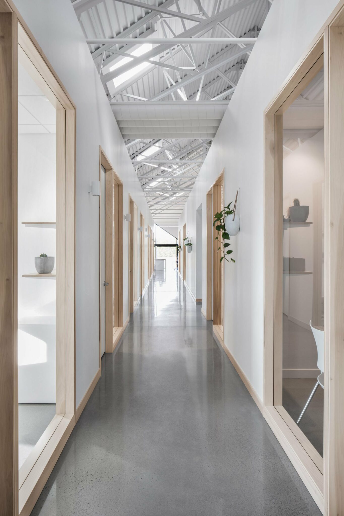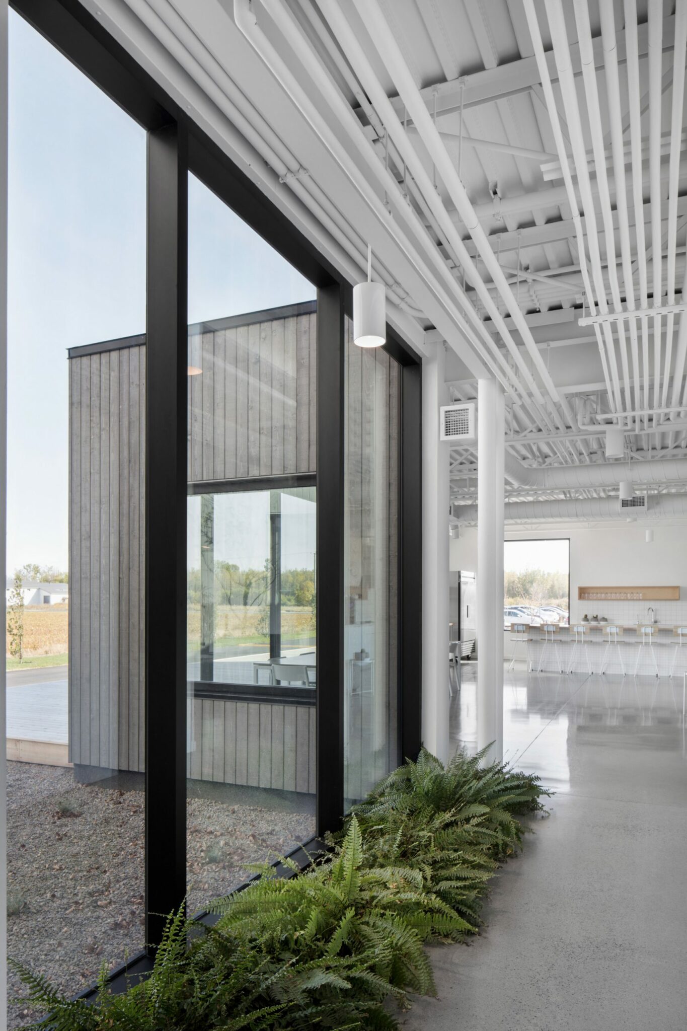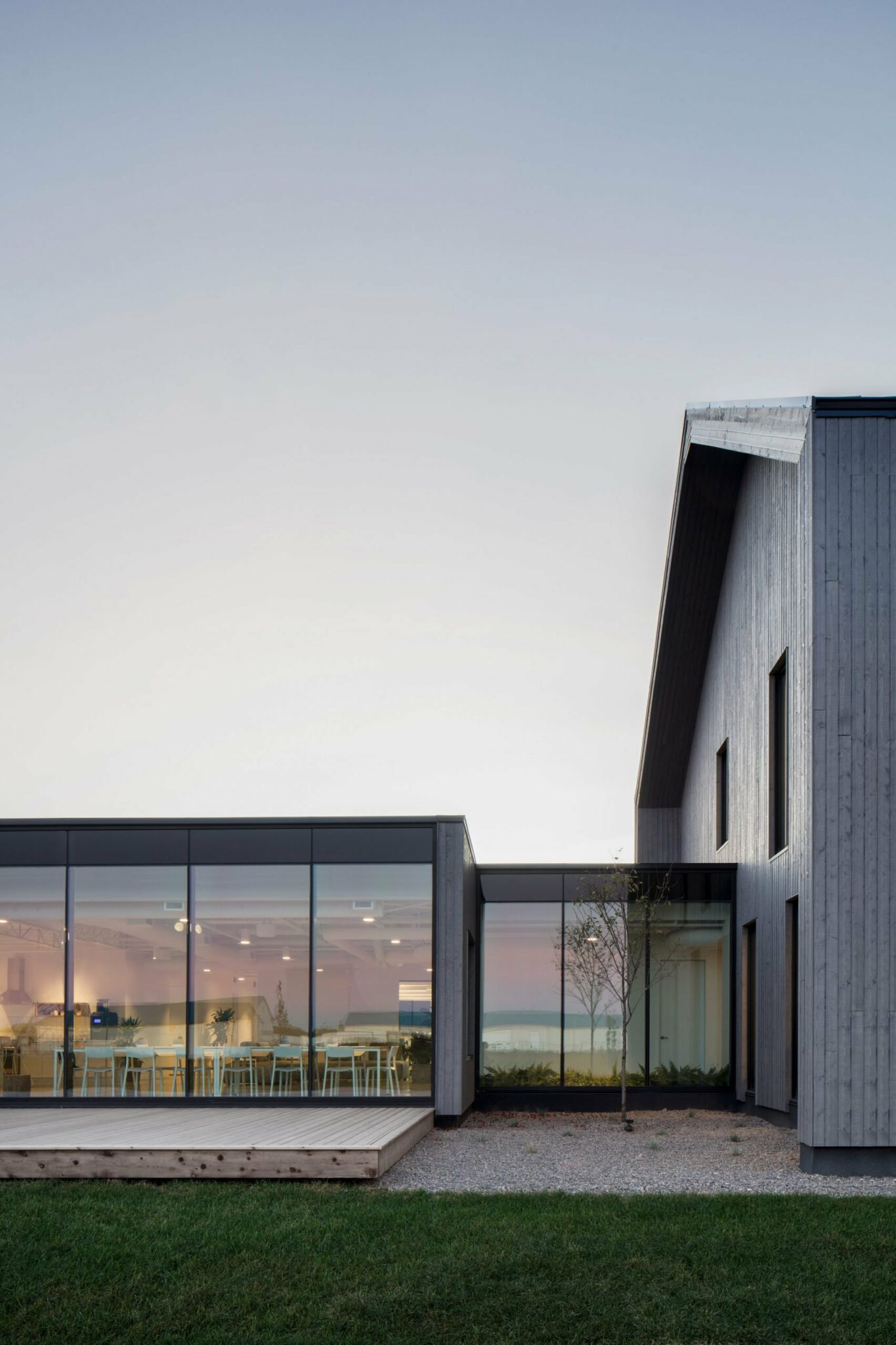 Le bâtiment à deux étages a un toit en pente comme une grange, tandis que la structure inférieure et rectangulaire est surmontée d’un toit plat. A deux, ils ressemblent subtilement à d’autres granges et entrepôts industriels de la ville rurale.