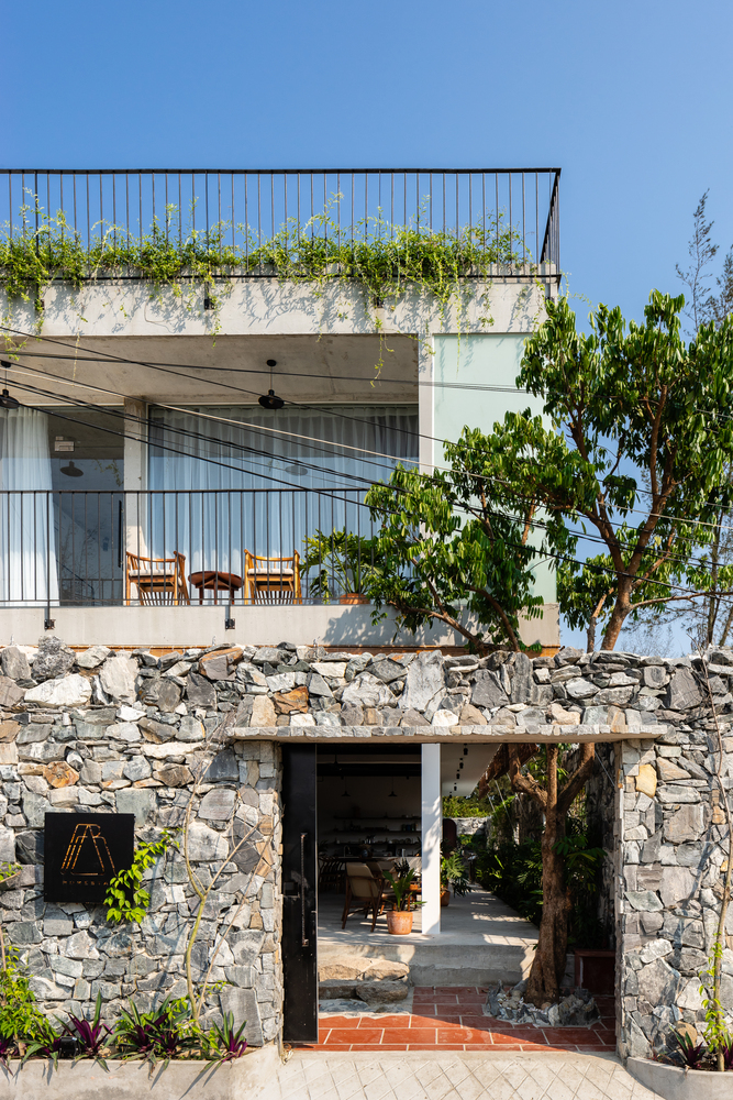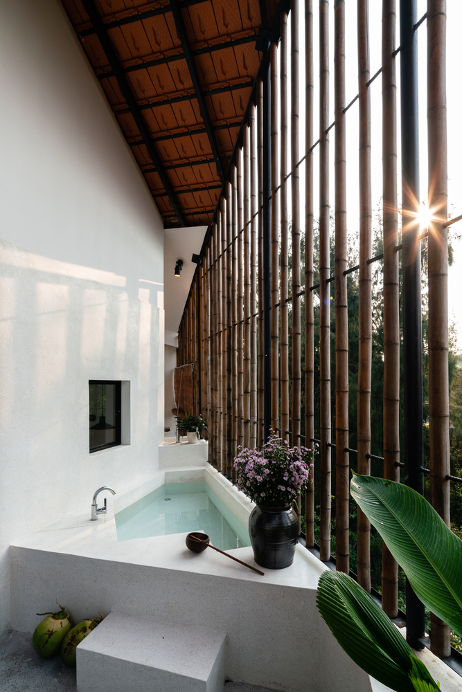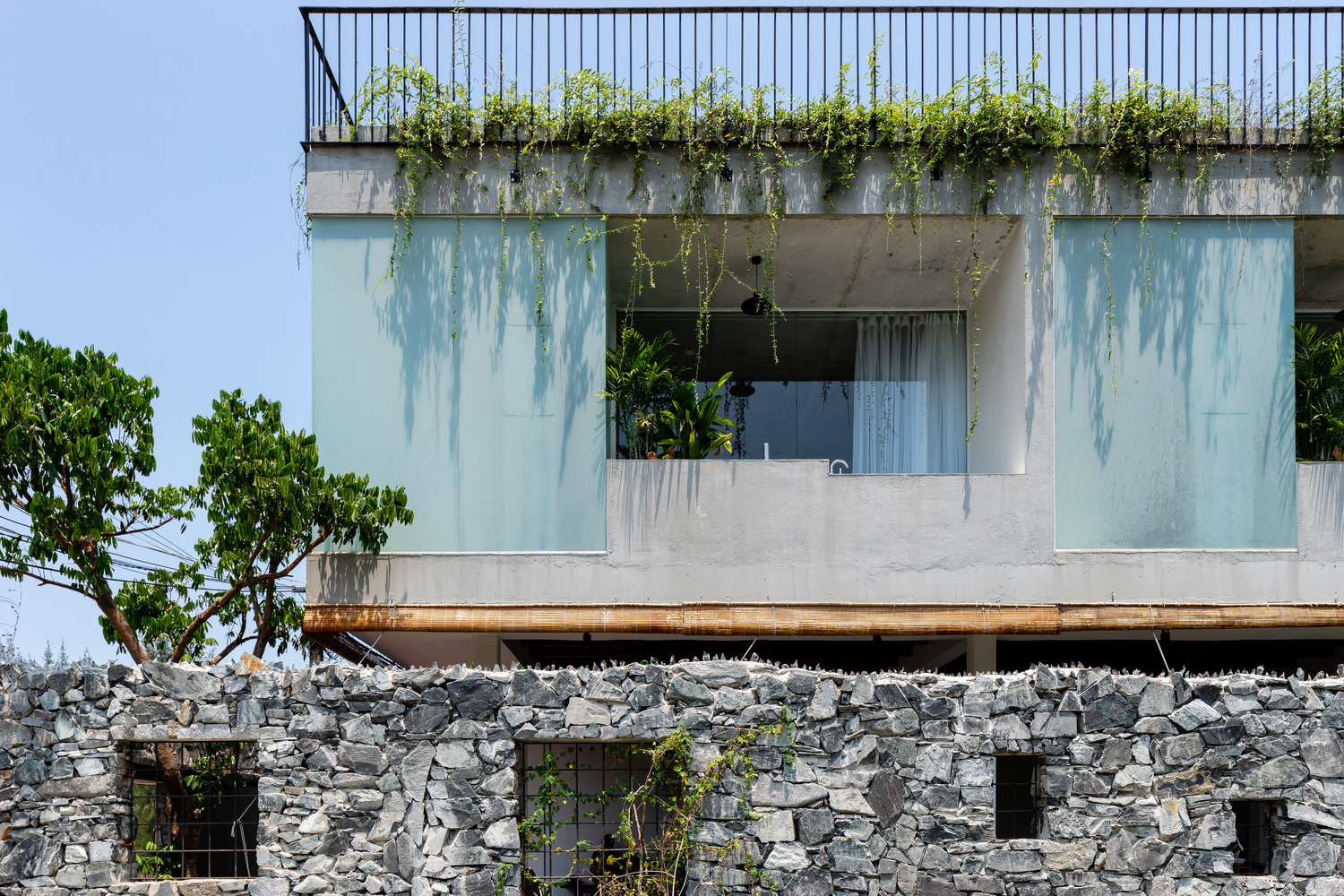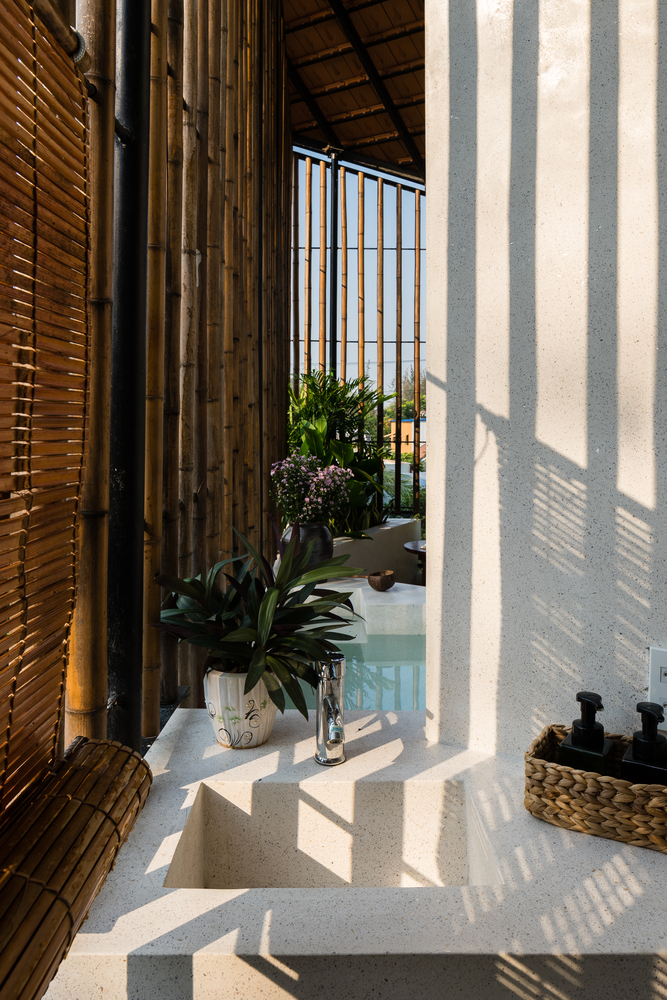 Afin de créer un climat durable, une belle esthétique reflétant la nature du paysage balnéaire, ils utilisent une combinaison de bois et de roche comme matériaux majeurs. En outre, en raison de contraintes budgétaires serrées, les architectes exploitent au maximum la beauté brute des matériaux naturels et n’installent que les murs de verre où il est absolument nécessaire. Des matériaux traditionnels et locaux sont également utilisés efficacement dans ce travail, tels que la pierre, le bois naturel, la meule, le bain abrasif, le mur de bambou, etc., permettant une infusion significative de l’âme dans le projet.
