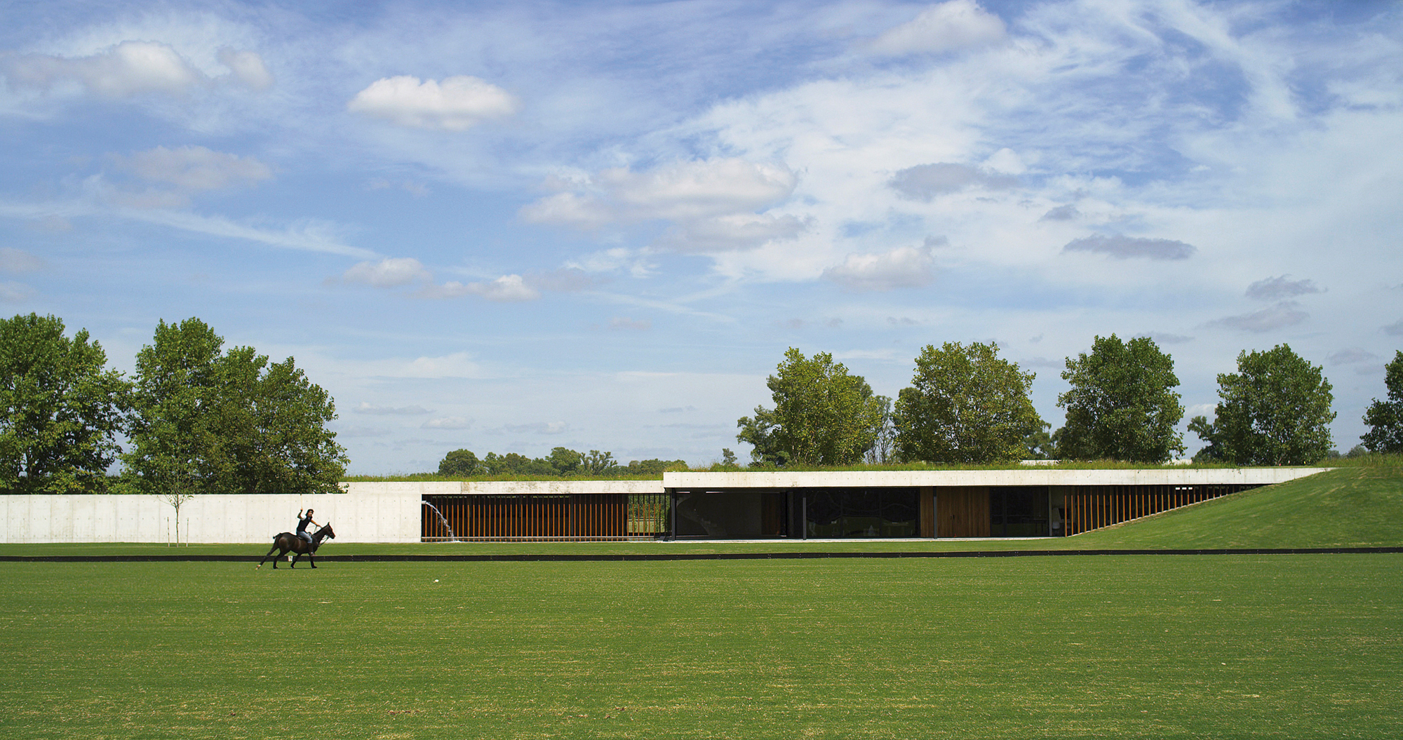 Plus encore, les architectes ont couvert leurs deux bâtiments de toits végétalisés qui entérinent le choix d’intégration architecturale. Là-haut, les herbes sauvages, natives des plaines de Las Pampas, contrastent élégamment avec l’harmonie ordonnancée du gazon des écuries. Quelques élévations douces et naturelles permettent l’accès aux toits d’où l’on peut observer les matches de polo et la nature environnante.