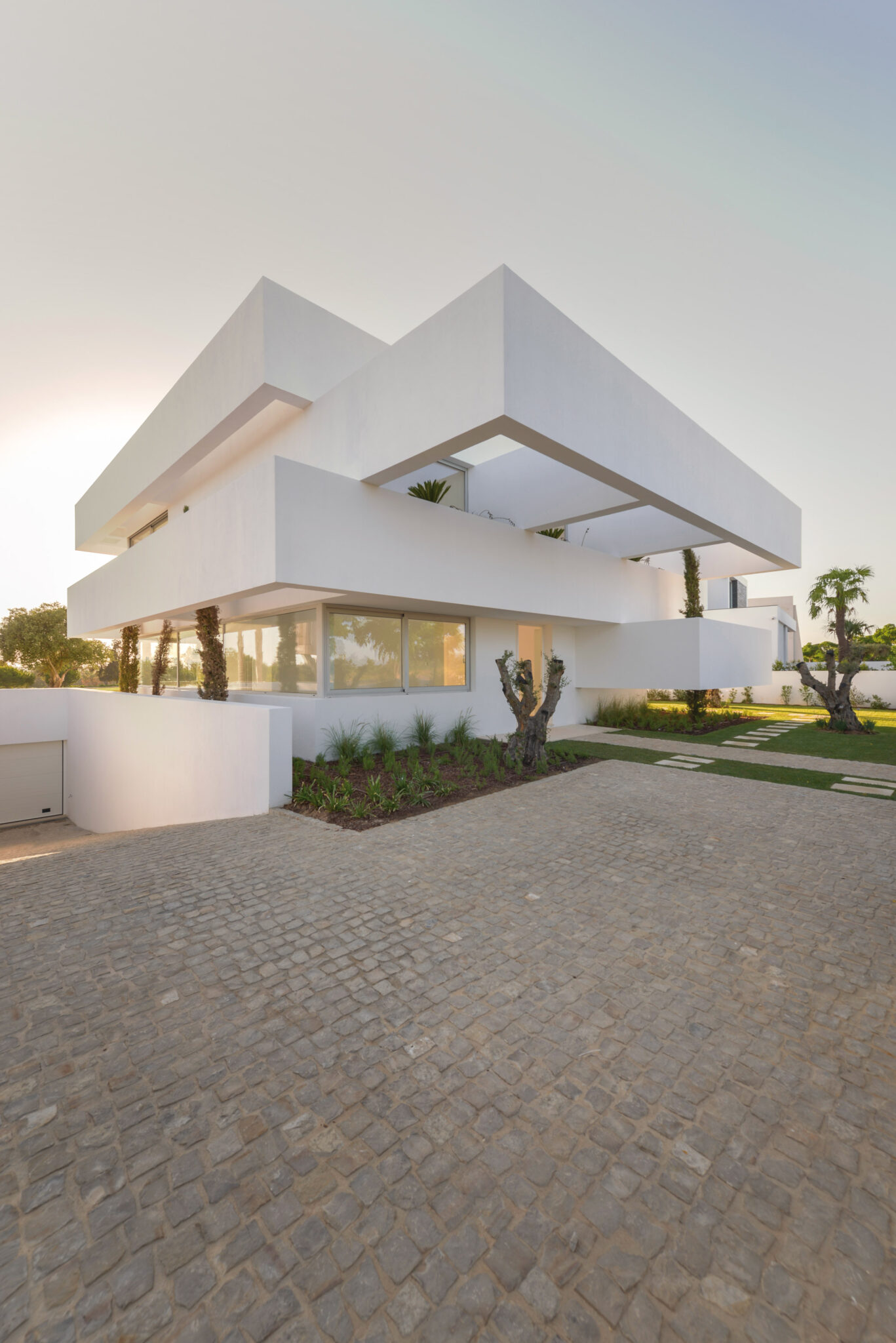 un jeu de construction, un champ ouvert à l’expérimentation perpétuelle. C’est ce regard absolu qui a permis aux architectes d’imaginer, sans préjugé ou préconception, le projet pertinemment nommé : Cinq terrasses et un Jardin. Au départ de l’affaire, un terrain de golf, à Vilamoura au Portugal, une terre parée de buissons et d’arbres, de bacs de sable et de petits étangs. Un terrain vallonné où d’autres maisons ont, elles aussi, été érigées pour satisfaire une clientèle acquise aux plaisirs de la petite balle blanche.
