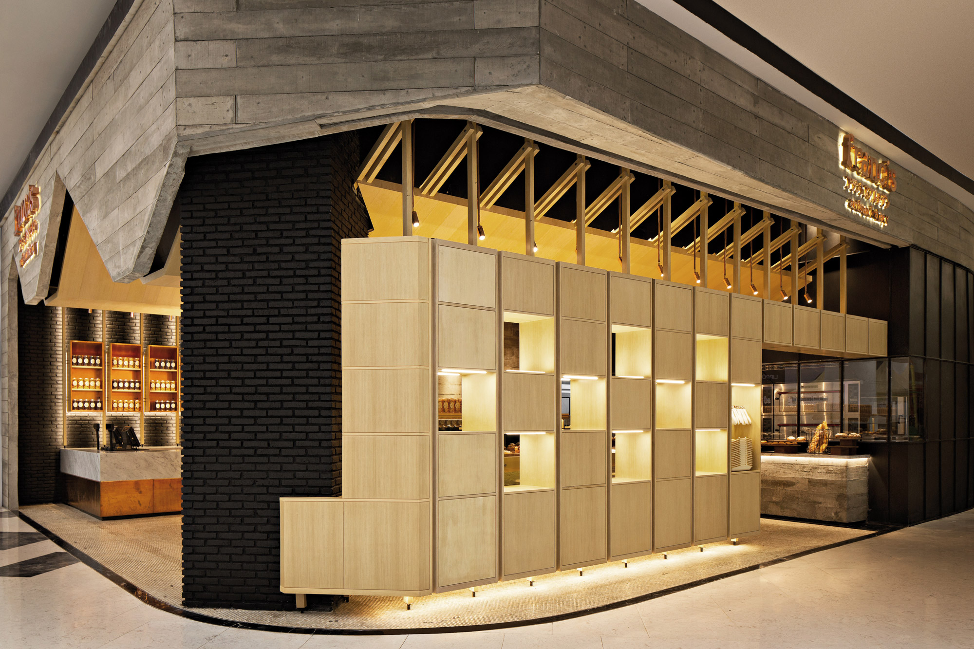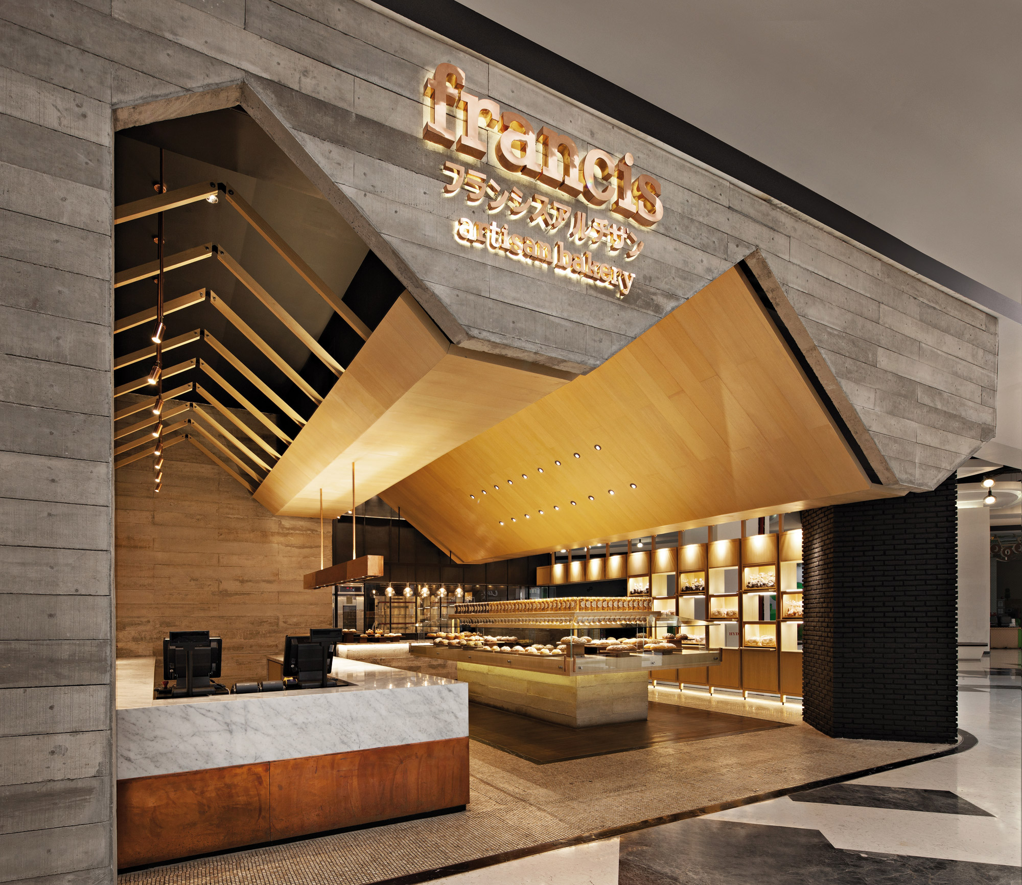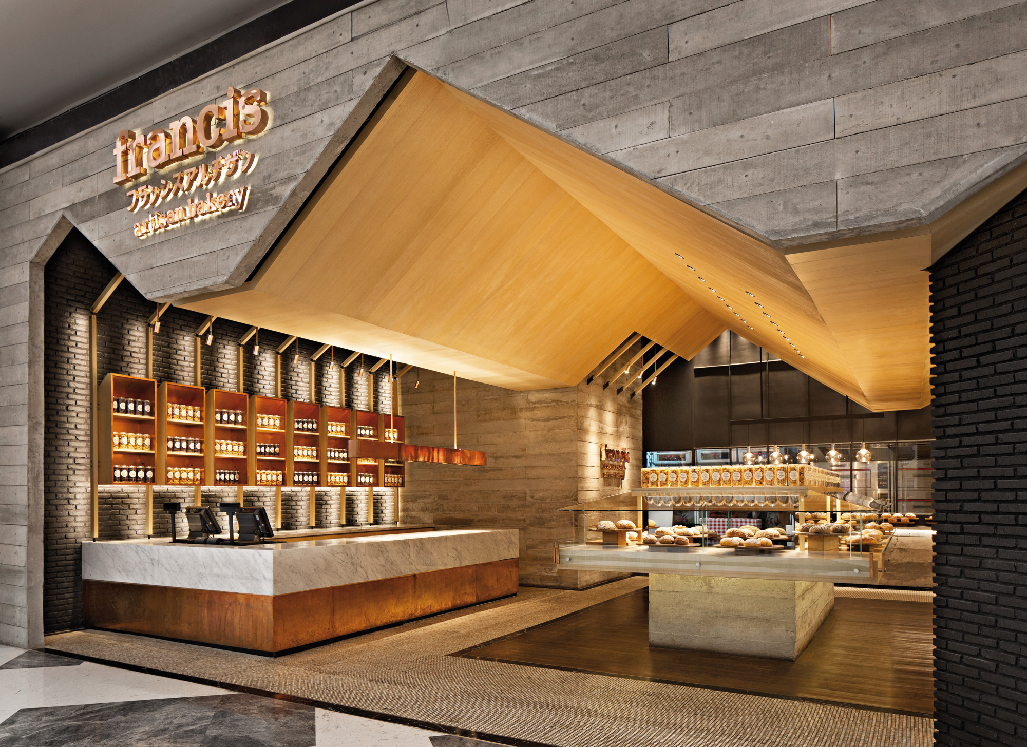 Francis Artisan Bakery prône le bon pain maison à base d’ingrédients naturels, celui dont la fabrication prend plus de huit heures, celui dont la croûte croustille et dont l’intérieur demeure bien moelleux. Idem pour les pâtisseries qui s’annoncent délicieuses… Et pour réaliser l’écrin de toutes ces gourmandises, les fondateurs ont fait appel à l’agence d’architecture Willis Kusuma. « Quand l’artisan rencontre la modernité » : tel était le point de départ du concept de cette boulangerie-pâtisserie à Jakarta. Pour exprimer cette idée, Willis Kusuma Architects a imaginé un espace de 120 m2, simple, unique, pratique et chaleureux comme une demeure, et mélangeant les styles. Ainsi, sous un toit en pente sont exposées toutes les créations de la maison. À l’arrière, de grandes parois de verre laissent transparaître le laboratoire où tout se trame en amont… Pour mettre en avant le mariage de la France et du Japon, des matériaux traditionnels, tels le bois, la brique, le béton, la mosaïque, participent au décor. Du marbre et du cuivre, au niveau du comptoir de l’entrée, complètent le dialogue mais dans le registre de la modernité. Et pour résoudre le problème des étals vides l’heure de la fermeture arrivant, les architectes ont dessiné du mobilier réglable et des étagères dont les casiers se ferment ou s’ouvrent suivant les besoins. Esthétiques et pratiques, les meubles donnent un vrai rythme à la boutique !