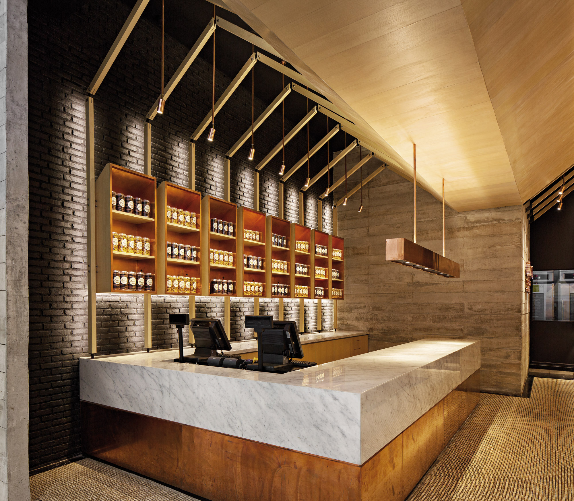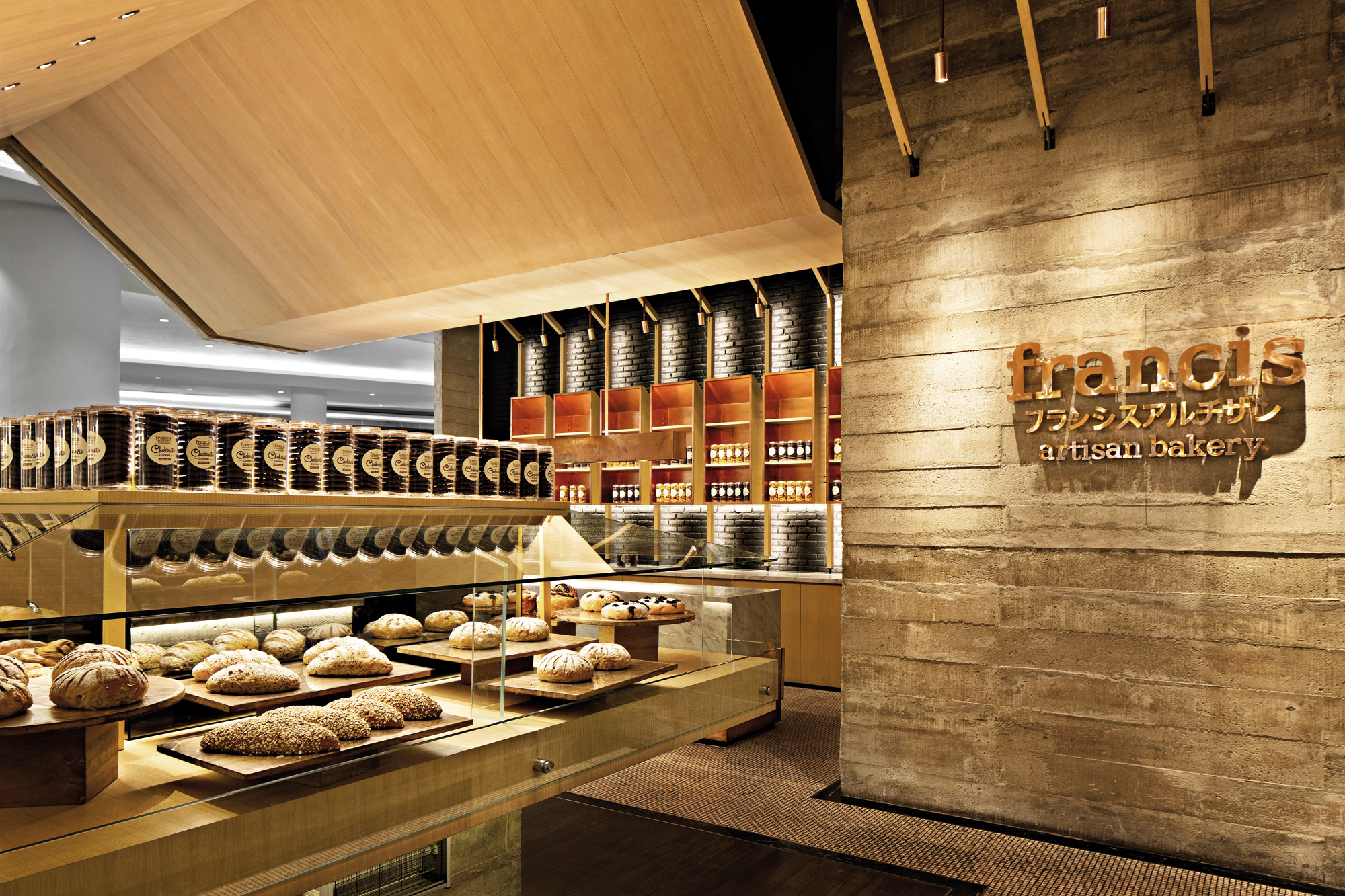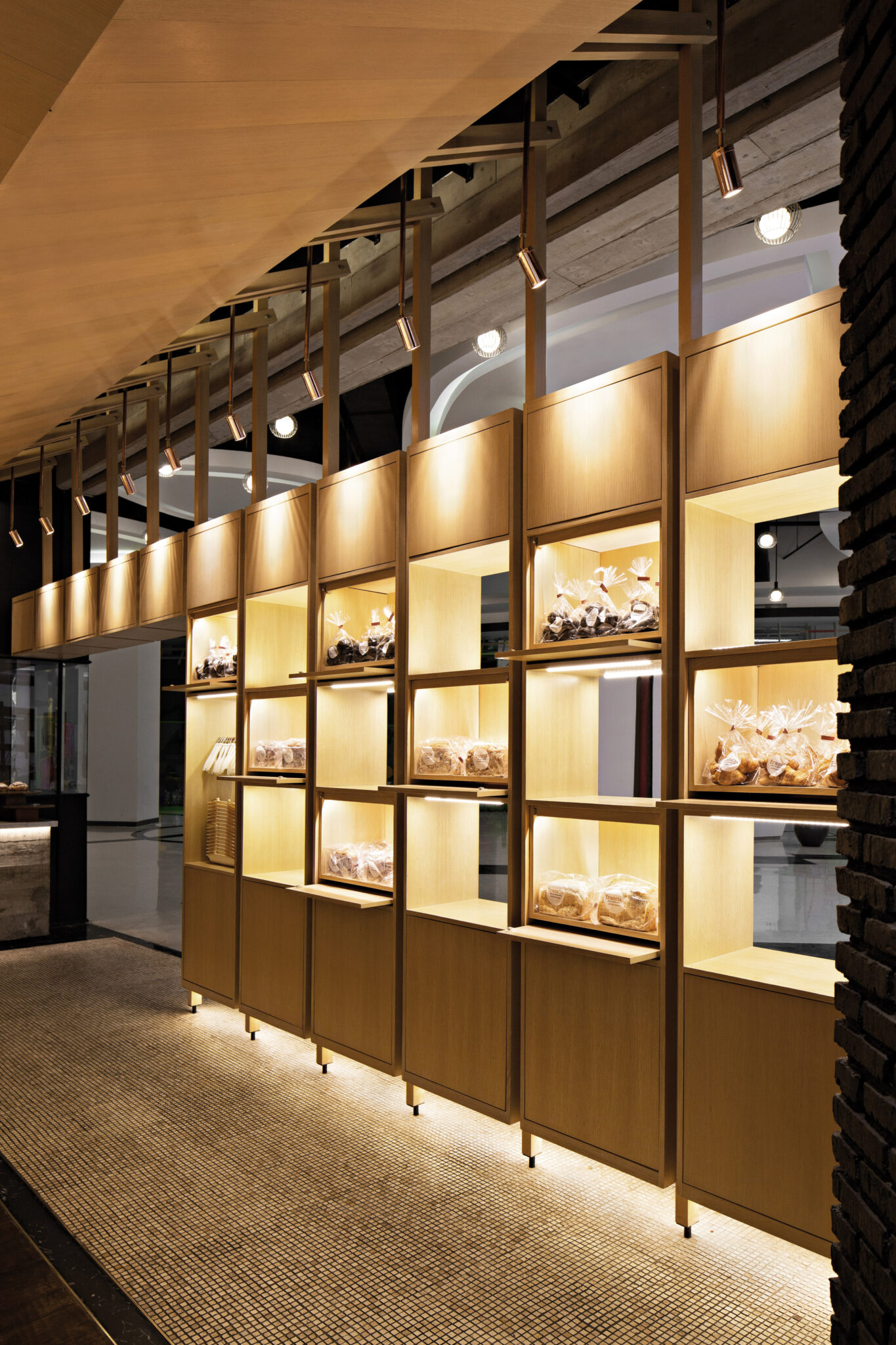 Francis Artisan Bakery prône le bon pain maison à base d’ingrédients naturels, celui dont la fabrication prend plus de huit heures, celui dont la croûte croustille et dont l’intérieur demeure bien moelleux. Idem pour les pâtisseries qui s’annoncent délicieuses… Et pour réaliser l’écrin de toutes ces gourmandises, les fondateurs ont fait appel à l’agence d’architecture Willis Kusuma. « Quand l’artisan rencontre la modernité » : tel était le point de départ du concept de cette boulangerie-pâtisserie à Jakarta. Pour exprimer cette idée, Willis Kusuma Architects a imaginé un espace de 120 m2, simple, unique, pratique et chaleureux comme une demeure, et mélangeant les styles. Ainsi, sous un toit en pente sont exposées toutes les créations de la maison. À l’arrière, de grandes parois de verre laissent transparaître le laboratoire où tout se trame en amont… Pour mettre en avant le mariage de la France et du Japon, des matériaux traditionnels, tels le bois, la brique, le béton, la mosaïque, participent au décor. Du marbre et du cuivre, au niveau du comptoir de l’entrée, complètent le dialogue mais dans le registre de la modernité. Et pour résoudre le problème des étals vides l’heure de la fermeture arrivant, les architectes ont dessiné du mobilier réglable et des étagères dont les casiers se ferment ou s’ouvrent suivant les besoins. Esthétiques et pratiques, les meubles donnent un vrai rythme à la boutique !