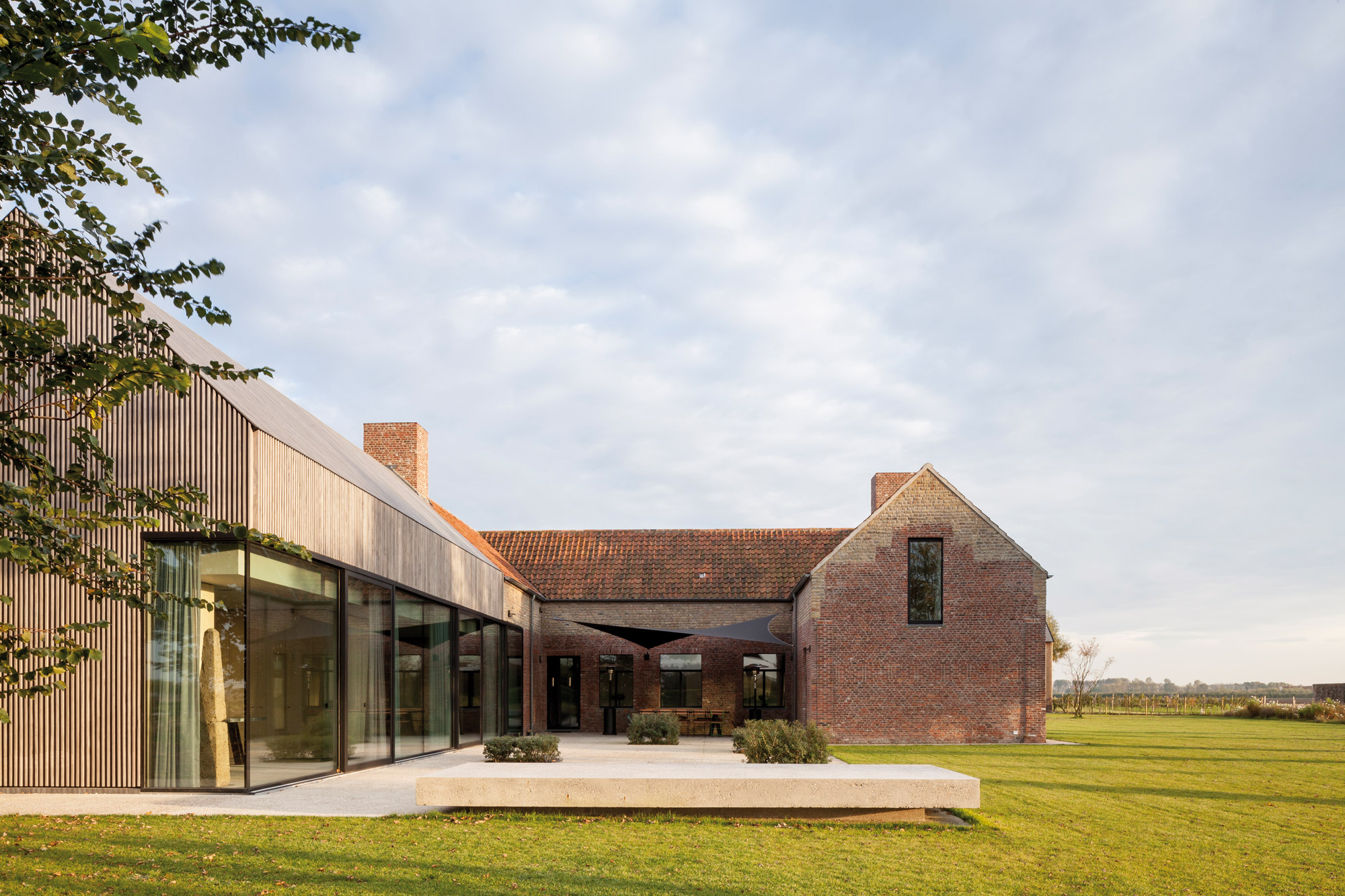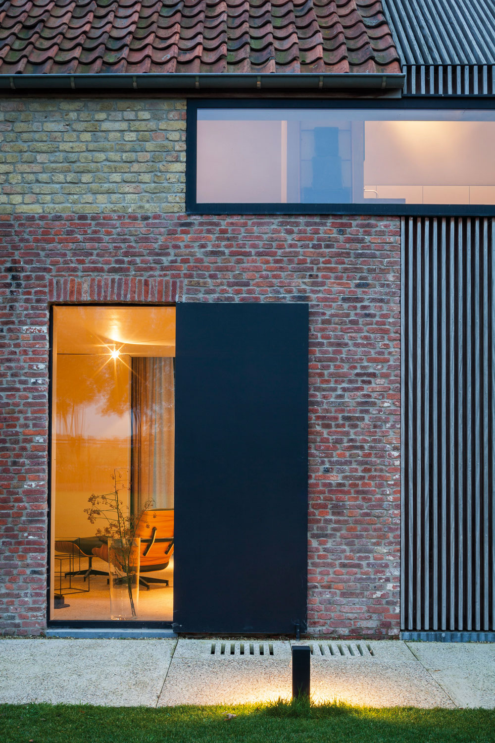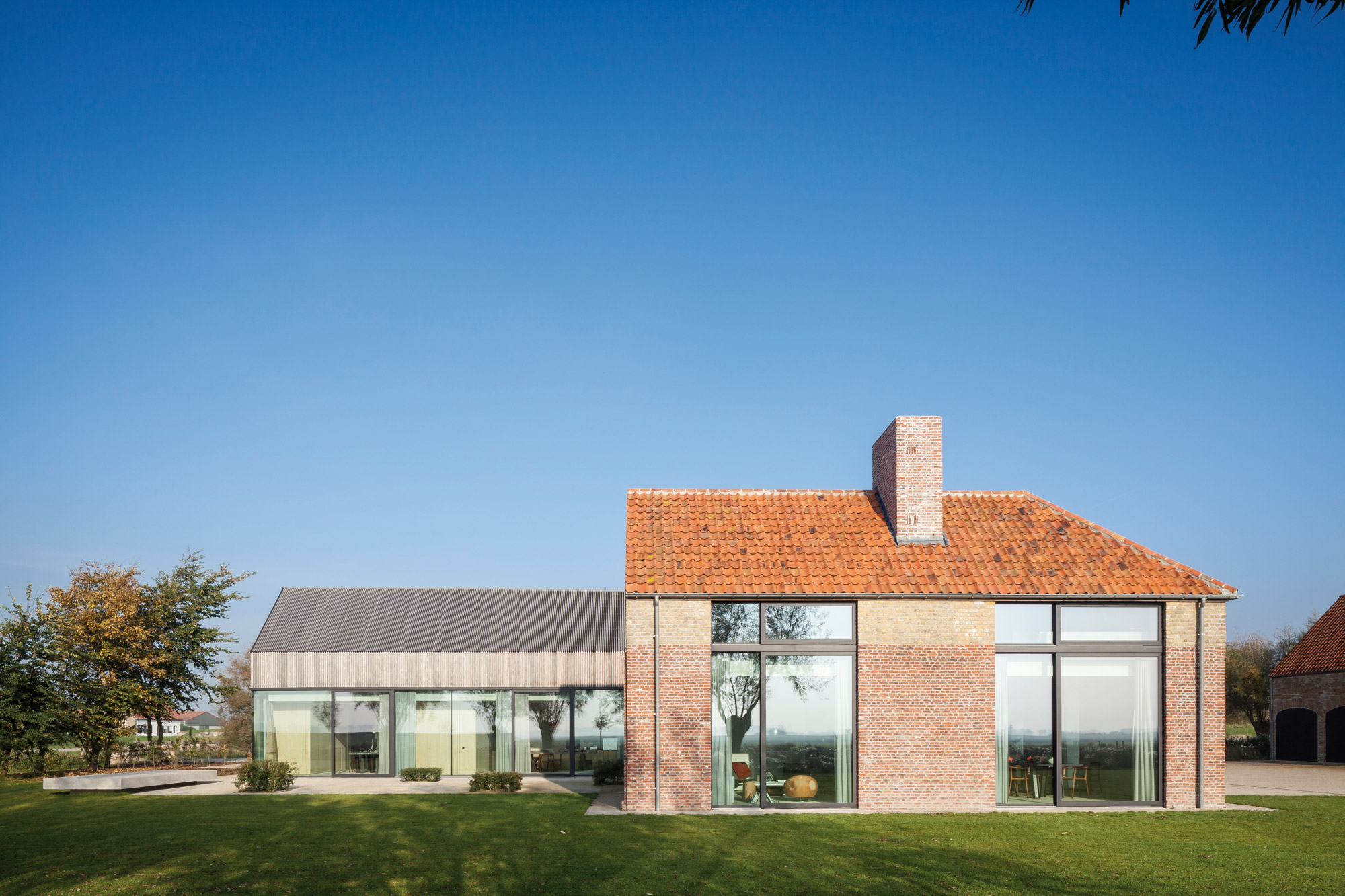 La Résidence DBB, près de la ville de Knokke, répond joliment à ce constat. Ici, les époques se superposent dans le respect de leur spécificité, pour un résultat contemporain qui valorise le patrimoine existant. Cette ancienne ferme de 1839 – jadis un fort – a été transformée ; sa grange a été métamorphosée en une maison d’hôtes et agrandie. L’ensemble est désormais relié par nouveau passage souterrain ! L’extension se lit clairement sur les façades, avec un passage de la brique au bois qu’une ouverture vient sceller. Comprendre un site, respecter son histoire, c’est aussi cela l’ADN de l’agence.