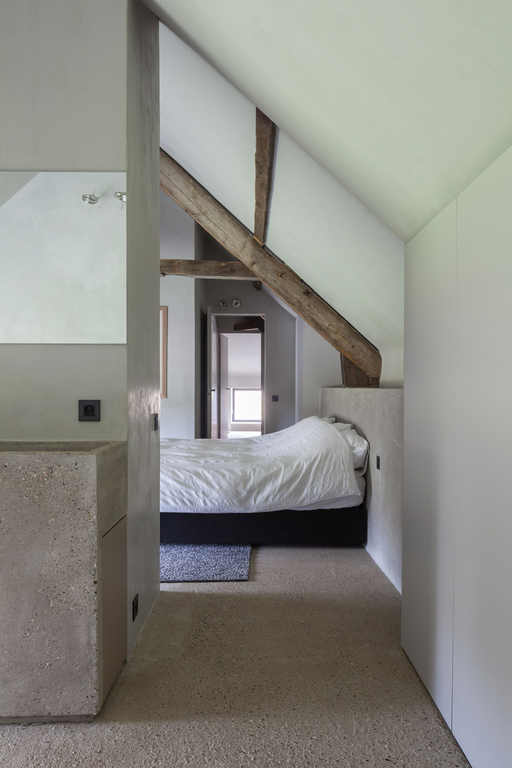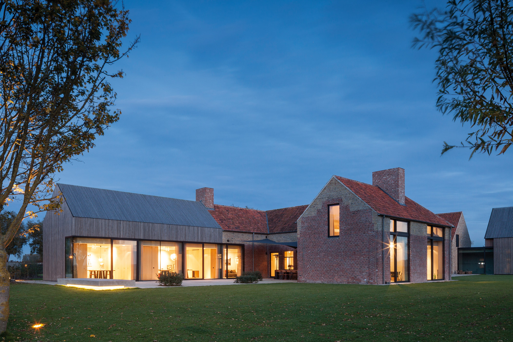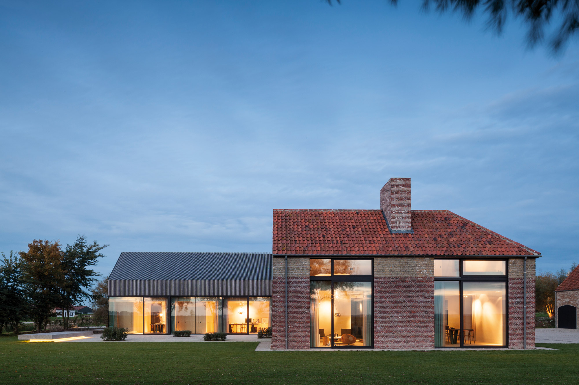 La Résidence DBB, près de la ville de Knokke, répond joliment à ce constat. Ici, les époques se superposent dans le respect de leur spécificité, pour un résultat contemporain qui valorise le patrimoine existant. Cette ancienne ferme de 1839 – jadis un fort – a été transformée ; sa grange a été métamorphosée en une maison d’hôtes et agrandie. L’ensemble est désormais relié par nouveau passage souterrain ! L’extension se lit clairement sur les façades, avec un passage de la brique au bois qu’une ouverture vient sceller. Comprendre un site, respecter son histoire, c’est aussi cela l’ADN de l’agence.