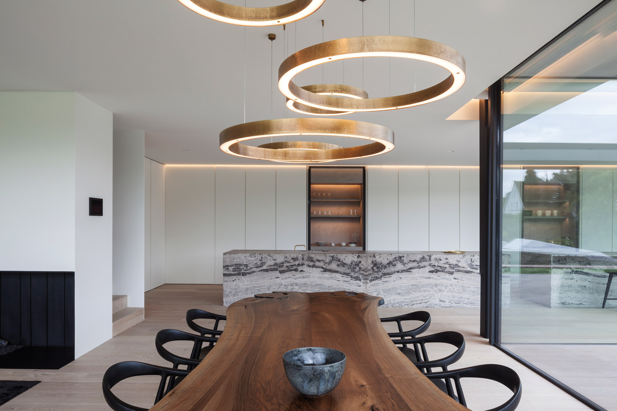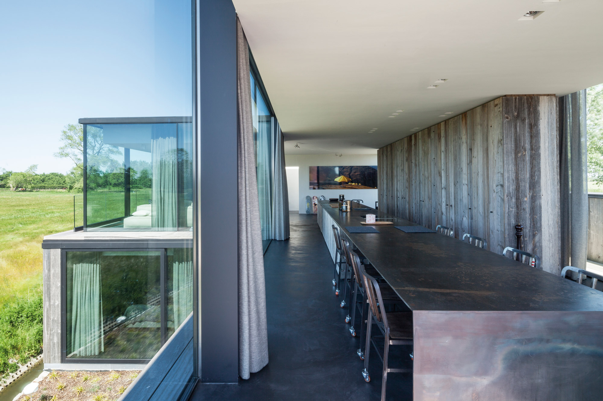 Conçue pour un quarantenaire, elle est notamment pourvue d’un night club privé, ainsi que d’un ascenseur pour les voitures. Un deuxième volume de béton, plus petit et posé sur le premier, abrite, entre autres, la chambre principale prolongée par une terrasse extérieure qui embrasse le paysage. Le rez-de-chaussée, lui, est fortement tourné vers la rivière, avec des façades presque entièrement vitrées pour admirer le jardin et le cours d’eau. Le pool house se love dans une boîte en bois que le propriétaire peut dissimuler grâce à un jeu de panneaux coulissants. À l’intérieur, les architectes ont imaginé des volumes chics et épurés, sublimés par un mariage de matières nobles. Avec une pièce forte dans la cuisine : un long îlot en pierre qui transcende l’espace.