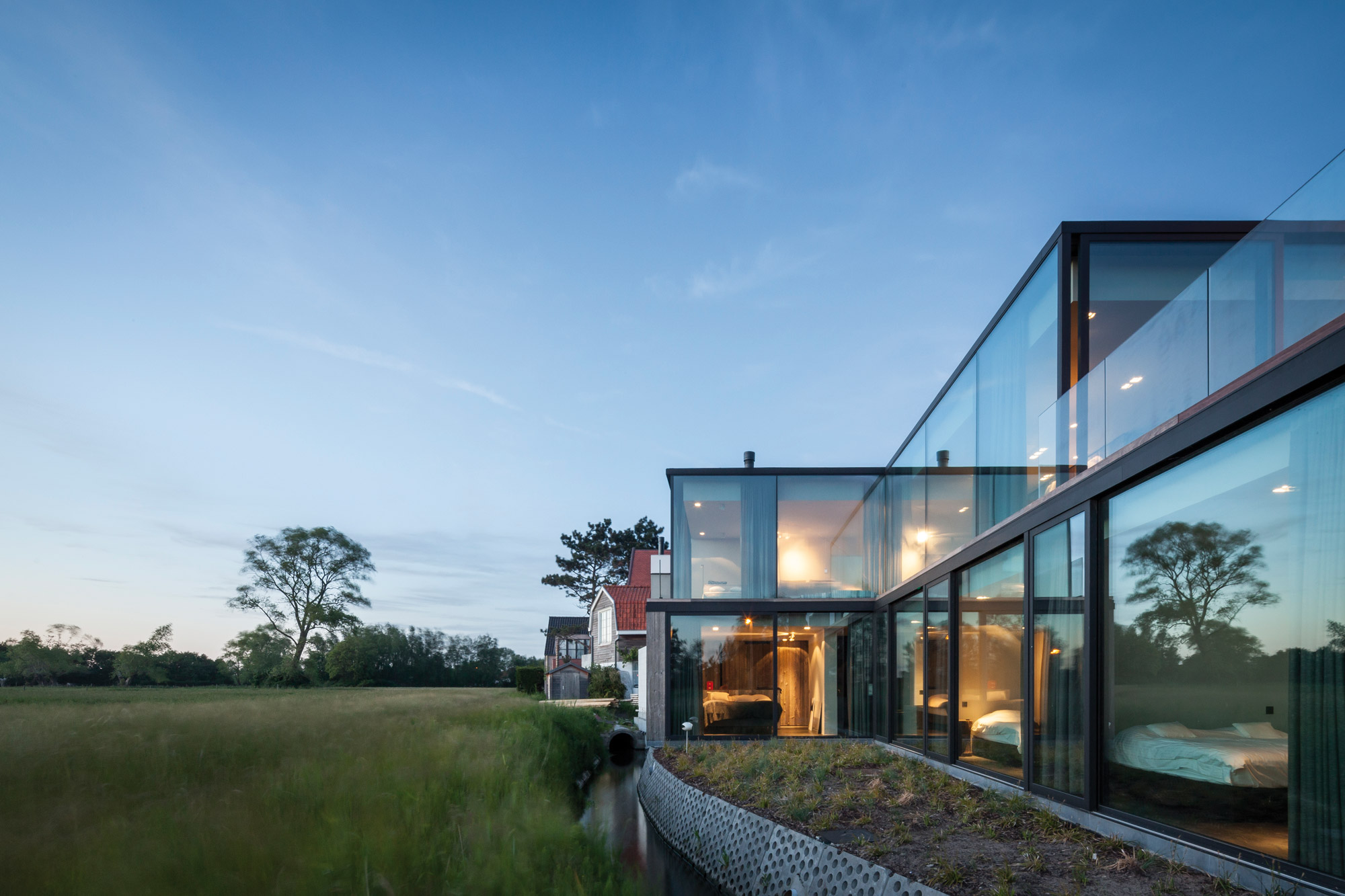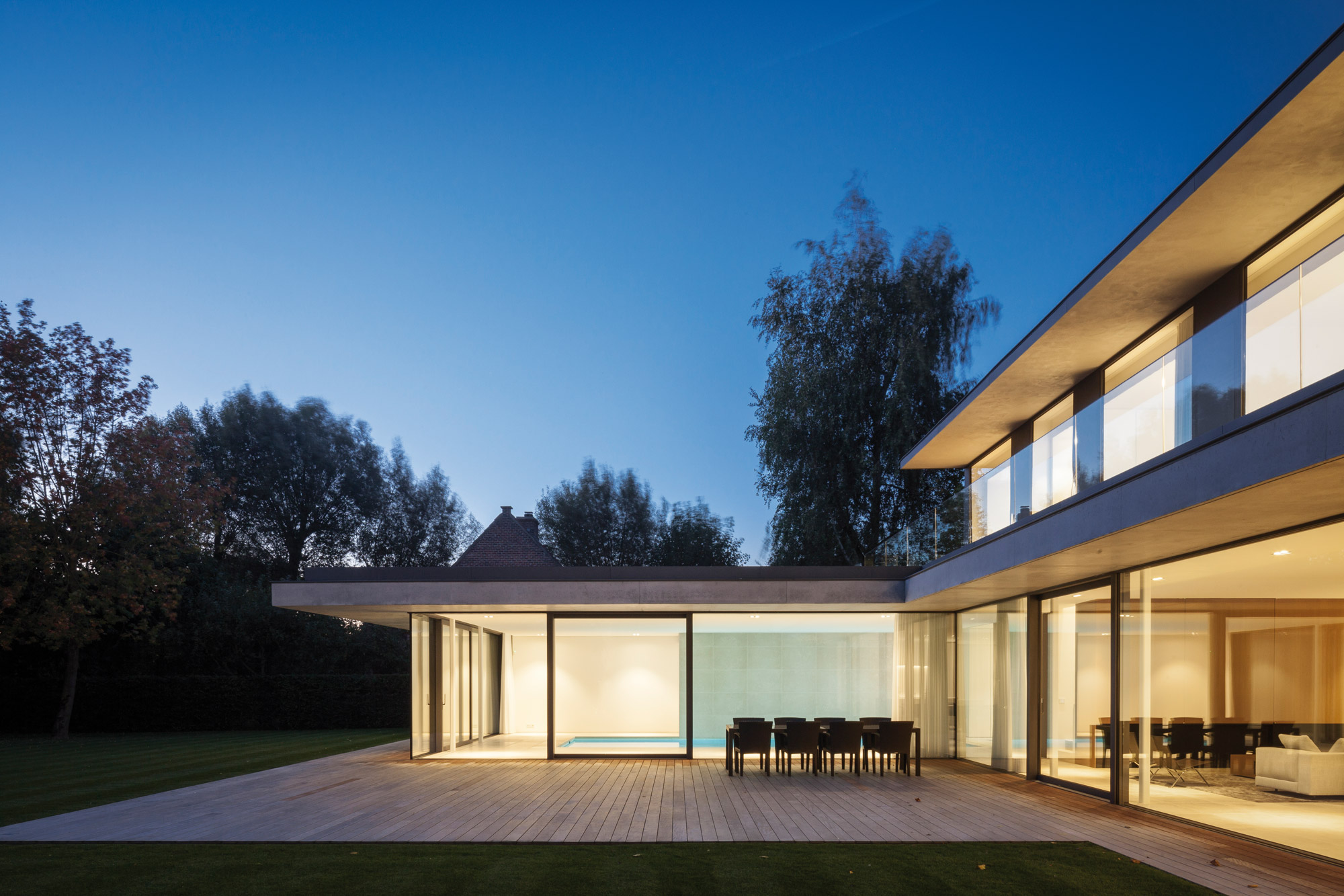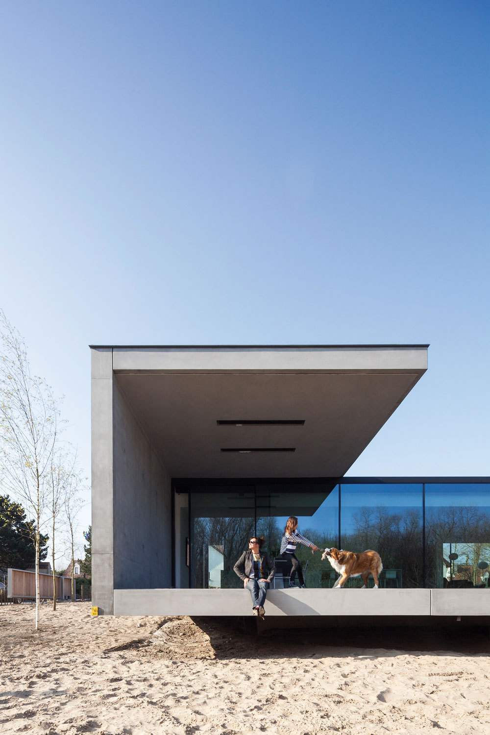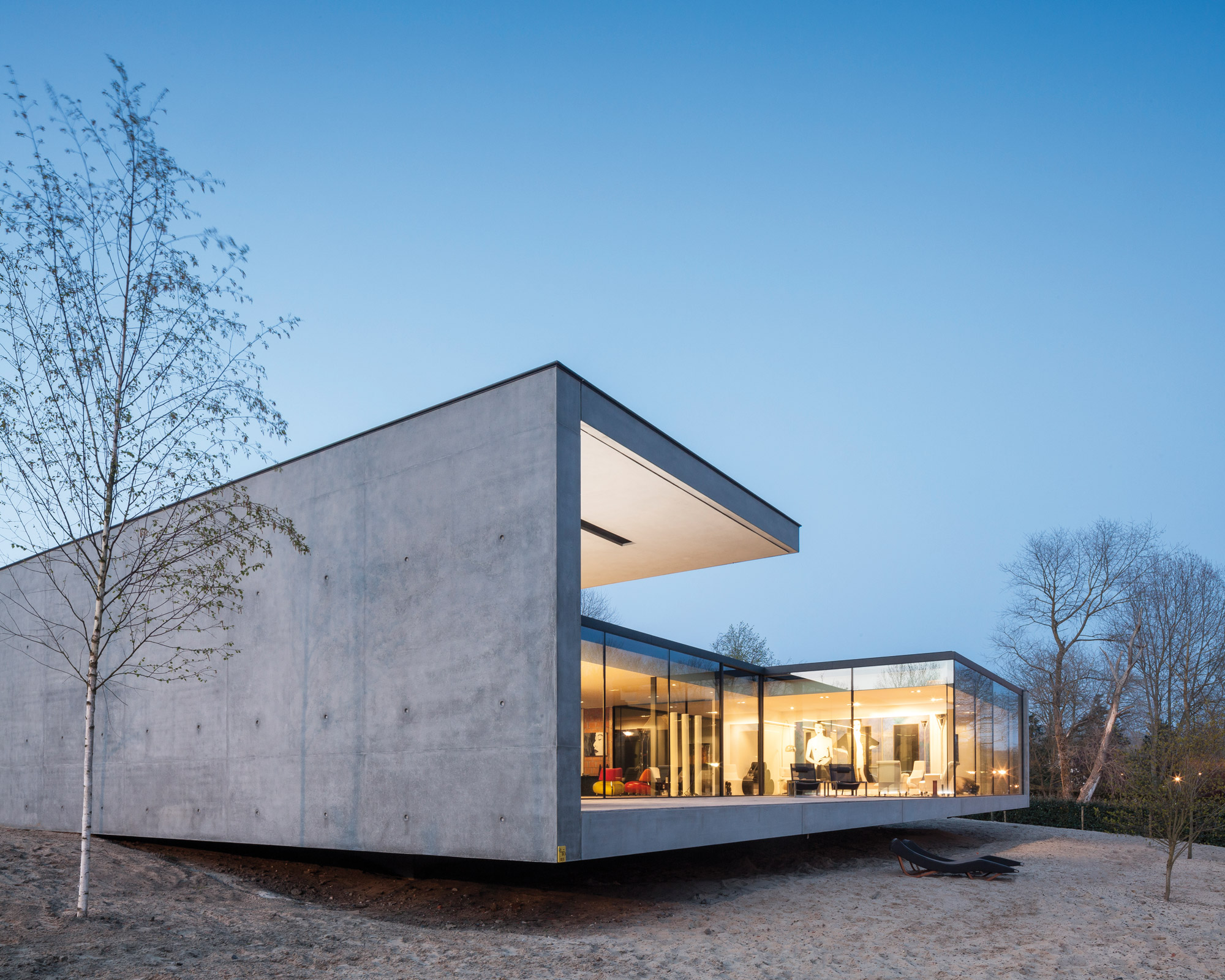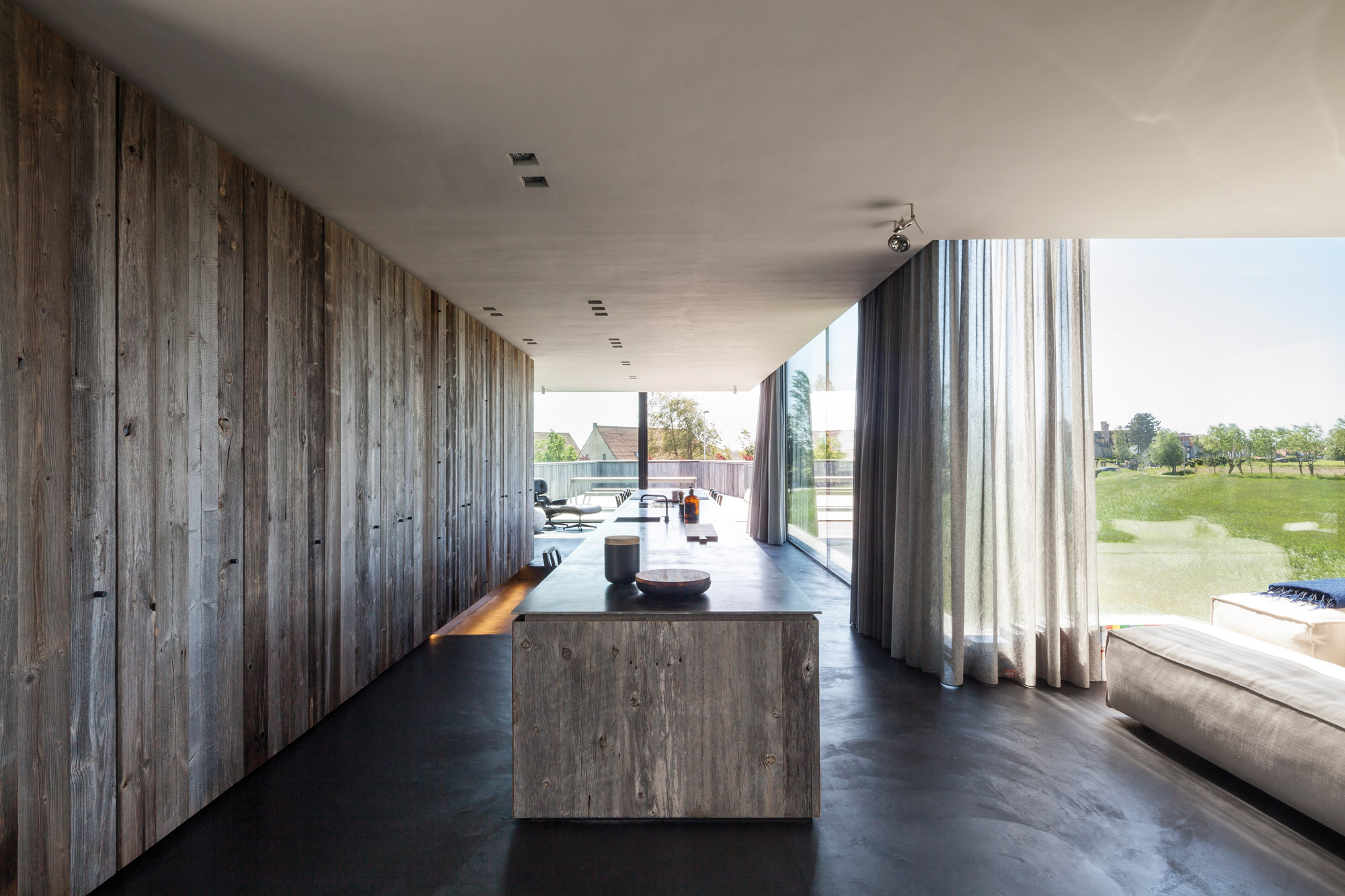 Depuis la création de leur agence basée à Bruges en Belgique, Benny Govaert et Damiaan Vanhoutte élèvent chaque nouveau projet à un niveau supérieur. Et particulièrement dans l’univers de l’architecture résidentielle. Le duo du studio Govaert & Vanhoutte, entouré de près de 20 collaborateurs, invente des demeures exceptionnelles à l’élégante horizontalité, avec des formes et des volumes d’une pureté intemporelle, ainsi que des détails inouïs. Leur dernière réalisation, la Résidence VDB achevée en janvier 2017, illustre parfaitement ce propos. Sur les bords de la rivière Leie, à Sint-Martens-Latem en aval du centre ville de Gand, cette maison en béton et bois s’étirant en longueur attire les regards des plaisanciers curieux.