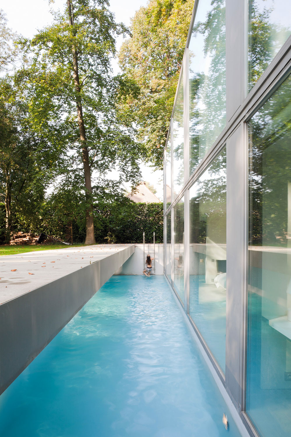 L’originalité des structures s’impose comme une autre constante, à l’image de la Résidence KDP, à La Panne près de la côte belge. Une maison en béton et verre, posée sur une grande dune, qui semble flotter au-dessus de cette dune, et qui arbore l’allure d’une sculpture légère et pure… La villa Roces aussi témoigne de cette identité. Située dans une forêt à Bruges sur un terrain oblong, elle imite une boîte de verre, découpée sur plusieurs côtés pour permettre de développer la piscine semienterrée, d’accéder au parking ou bien à l’arrière de la maison. « La maison est construite le long d’un mur pour répondre au manque de lumière, pour refléter la présence de la forêt, la verticalité des arbres, etc. Le mur de 54 mètres de long sert de fond pour le volume transparent à l’avant. Comme le volume transparent est conçu telle une boîte, l’espace intérieur est rempli de boîtes et de volumes clairement définis et incorpore les éléments de structure », expliquent les architectes. Un dessin original qui permet aussi de faire entrer au maximum la lumière et la nature à l’intérieur, une préoccupation majeure de l’agence. L’autre point remarquable du travail de Benny Govaert et Damiaan Vanhoutte, c’est leur savoir-faire en matière de rénovation : un exercice révélant de douces transitions entre le passé et le présent.