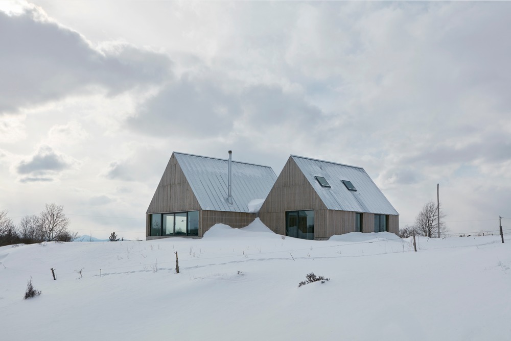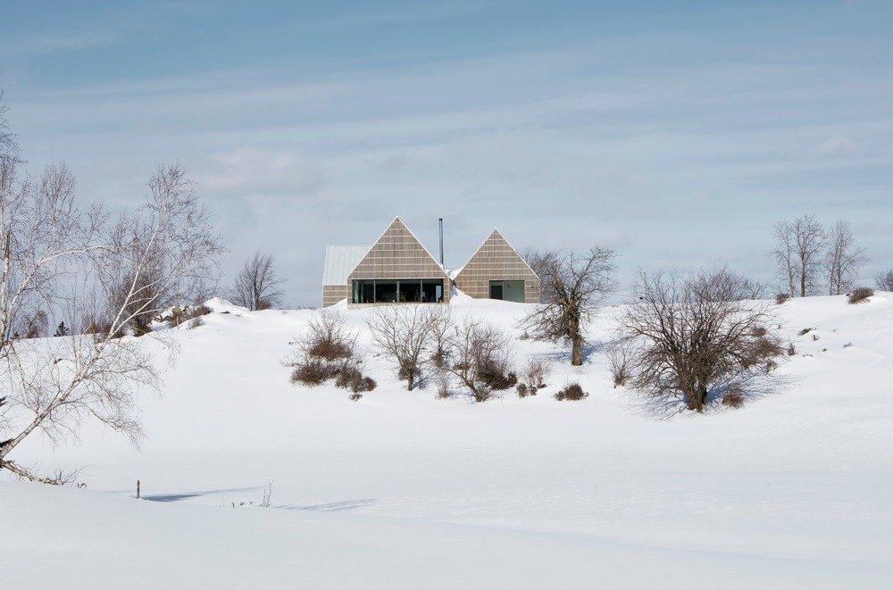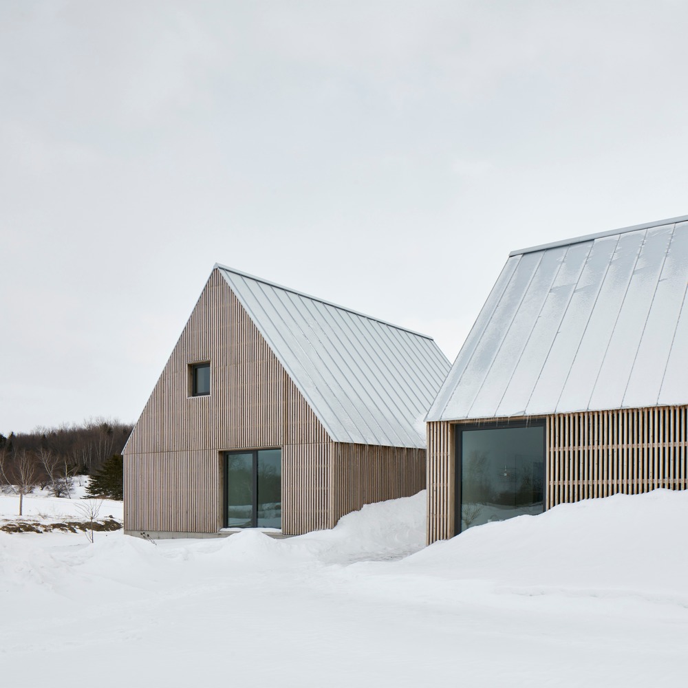 Quelques éléments de langage clairs définissent l’architecture : la fondation de béton continue qui sert de socle aux trois objets et délimite une série d’espaces extérieurs, la façade à clairevoie en lattes de cèdre, qui donne à la fois une uniformité à l’ensemble tout en créant une certaine profondeur visuelle, et le toit d’acier galvanisé, qui emprunte au contexte vernaculaire des architectures agricoles environnantes. Ces trois éléments servent à unifier les différents volumes tout en conférant une richesse matérielle à l’ensemble. La maison est à la fois simple mais complexe, discrète mais affirmée, ouverte mais introvertie.