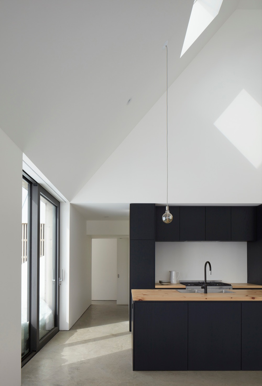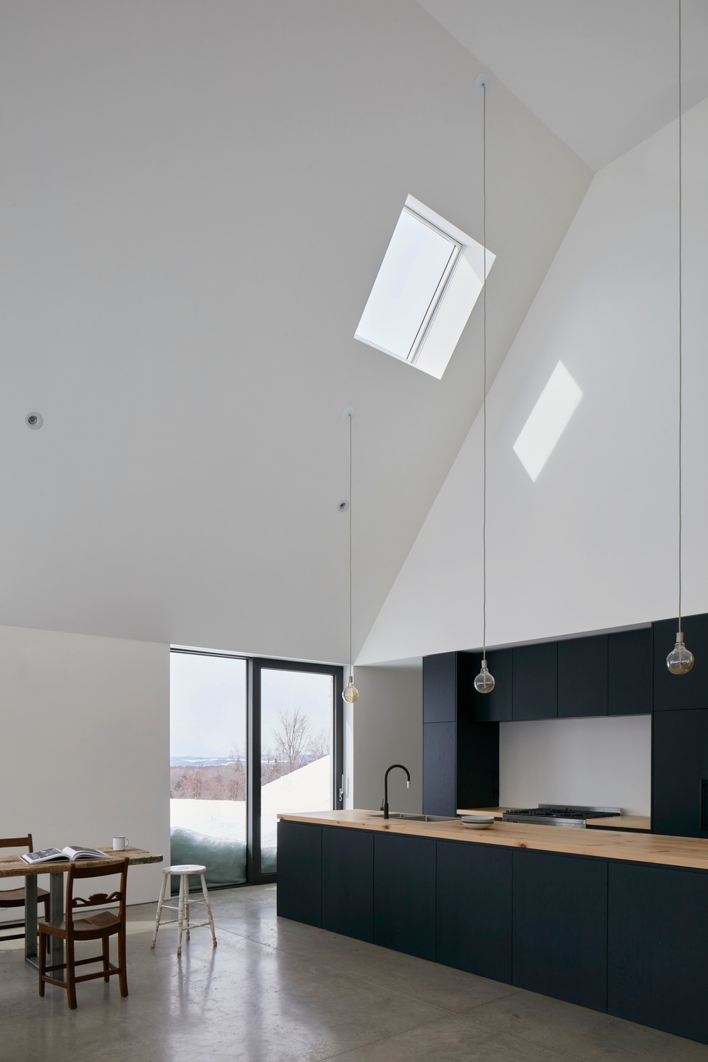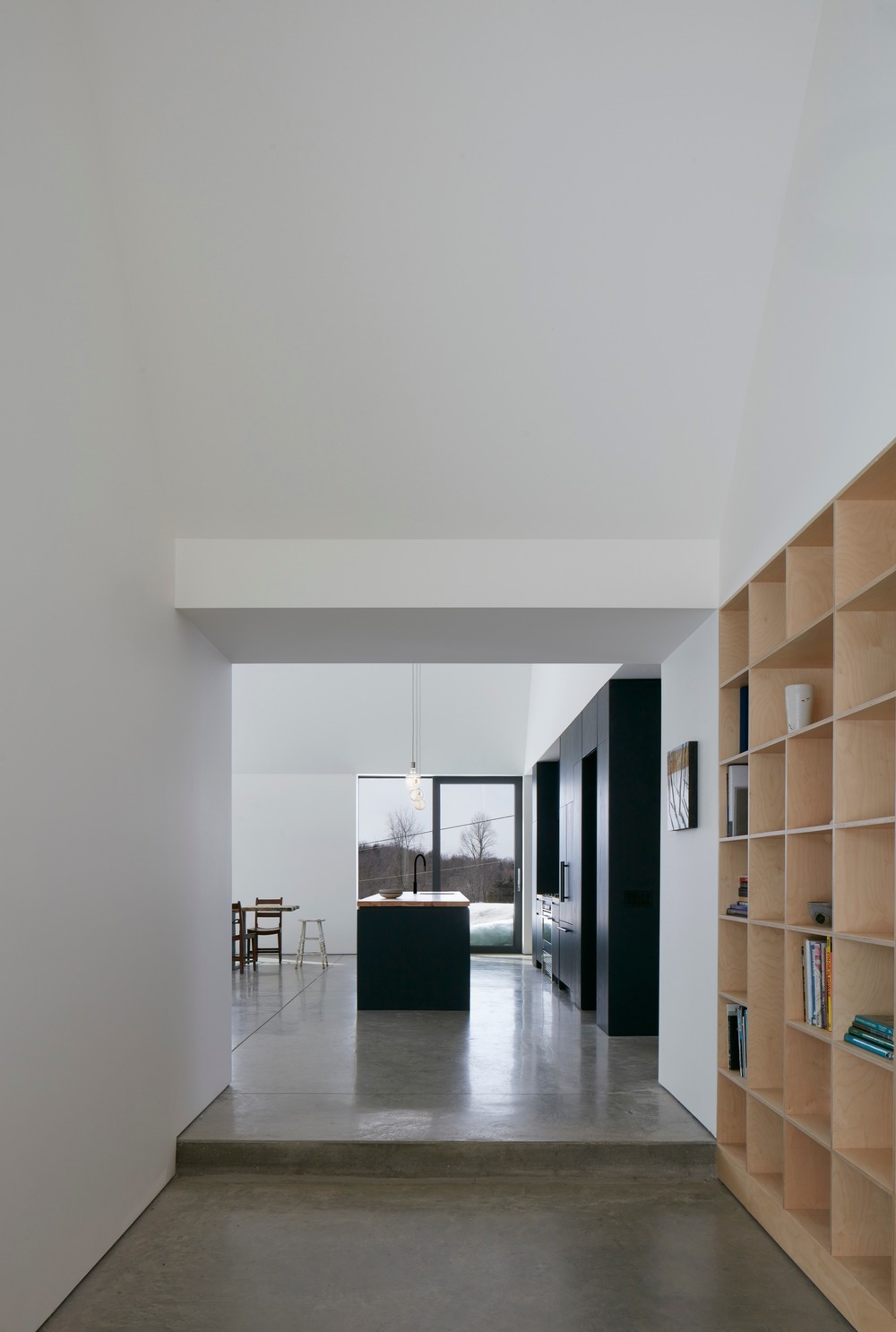 L’articulation des trois blocs crée des interstices qui cadrent des fonctions extérieures spécifiques: l’entrée de la maison ainsi que deux terrasses distinctes. Chacun des volumes répond à un élément différent du programme : la maison commune, la maison des parents et la maison des enfants. Le volume principal, « la maison commune » est entièrement ouvert en double hauteur et contient les principaux espaces de vie; salon, cuisine, salle à manger. Les deux autres volumes contiennent les chambres, salles de bains et des mezzanines plus privées. Alors que les pièces au rez-de-chaussée sont blanches, les mezzanines et les escaliers qui y mènent sont en contreplaqué fin, accentuant le sentiment de chaleur et d’intimité.