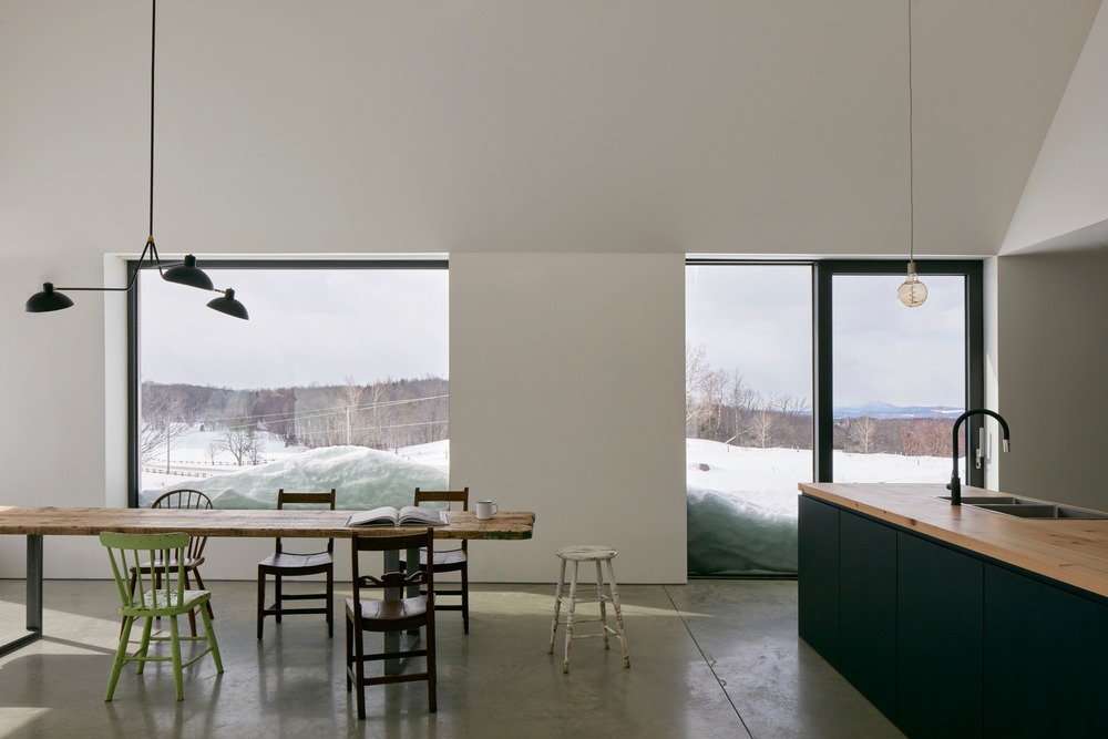 Située sur le haut d’un plateau, la maison Hatley surplombe un terrain agricole vallonné, composé de champs et de pâturages. La maison est composée de trois volumes de proportions identiques, mais d’échelles différentes, qui connectés les uns aux autres forment un ensemble architectural cohérent. La maison n’est pas orientée selon une vue ou une condition précise du paysage mais forme plutôt une composition qui se transforme continuellement selon le point de vue de l’observateur. Montrant parfois deux des volumes, parfois les trois, les pignons se couvrent et se découvrent en créant un jeu de superpositions riche en variations. L’absence de hiérarchie dans la relation entre l’implantation et le paysage permet d’apprécier celui-ci comme un panorama continu composée de multiples perspectives.