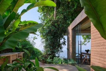 Étant donné que le bâtiment est largement intégré dans le terrain, nous avons utilisé du béton armé monolithique comme principal matériau de construction. Son esthétique se reflète à l’intérieur et sur la façade du bâtiment, où un enduit poli gris béton est complété par un bardage en bois de mélèze et de grandes baies vitrées avec des cadres en bois. Les débords proéminents des plafonds monolithiques couvrent les terrasses, créant un abri à chaque entrée, et servent de protection solaire passive pour éviter la surchauffe de l’intérieur.