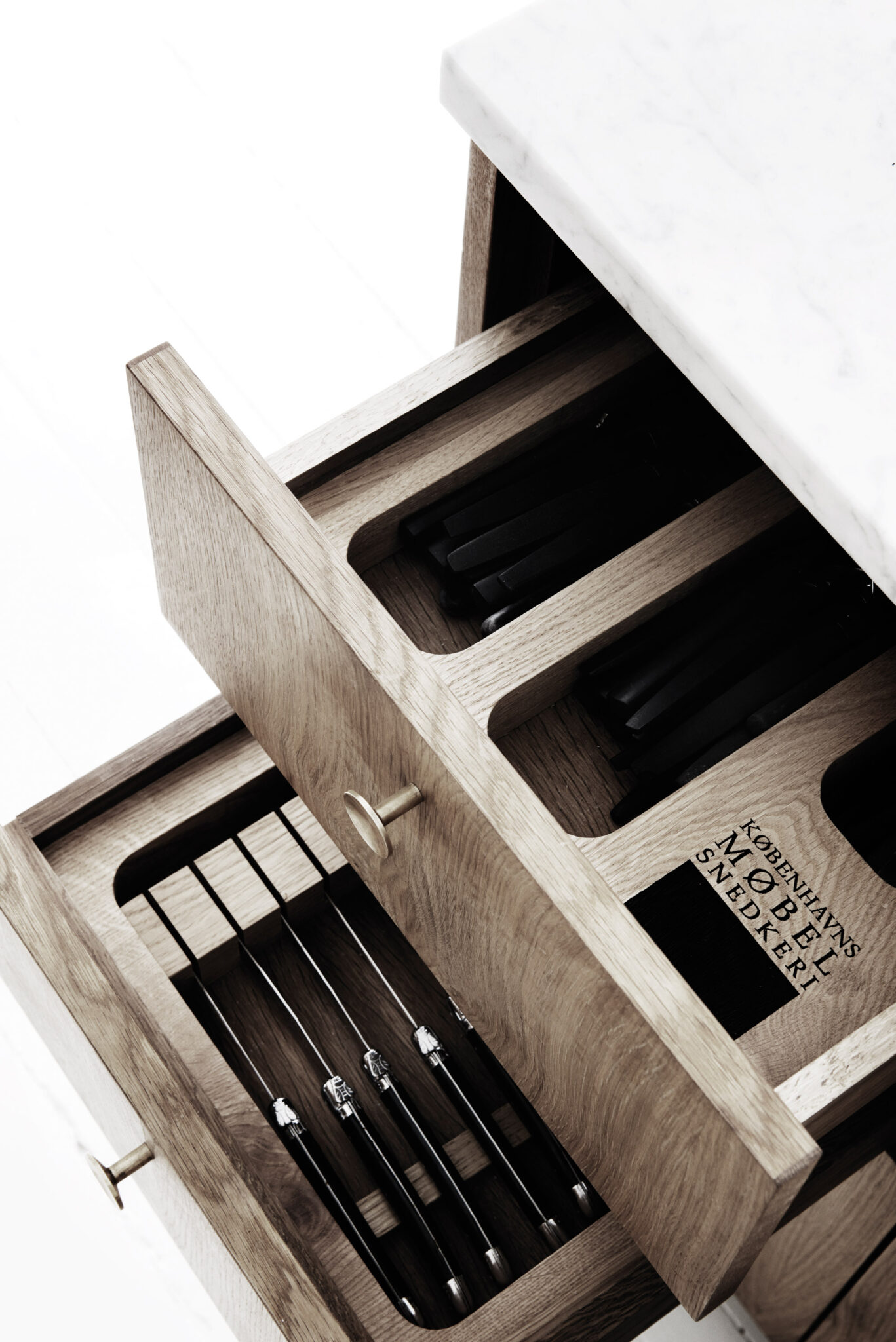 Bien avant l’heure du bio et du bien-être, les Danois avait déjà développé leur propre sens du confort. La notion intraduisible que l’on appelle là-bas le hygge (prononcez « hugueu ») doit toutes ses lettres de noblesse à l’art de vie à la danoise. Quelque part entre le cosy et la simplicité, le hygge tient tout autant de la façon d’être que de l’atmosphère alentour. Verbe, nom ou adjectif, il est de toutes les syntaxes de la langue germanique et comme un ADN se comprend d’instinct parmi ceux qui le possède. Côté design, même combat. Les Danois (Panton, Jacobsen, Normann Copenhagen, etc.) n’ont jamais eu de cesse de prouver leur talent minimaliste toujours associé à cette petite touche qui rappelle les intérieurs chaleureux d’antan, sans jamais faire de compromis sur l’économie tangible de leurs dessins. Dotés de ce même caractère nordique, les designers de KBH ne font pas exception à cette règle. Car, depuis 2006, Kheim Dolva et Søren Bech Jespersen ont en effet conquis leur clientèle sur la simplicité, la tradition et la qualité de produits devenus référence depuis lors sur la planète design. Il faut dire que les deux amis, qui se sont rencontrés lors d’une formation en ébénisterie, ont vite compris l’importance de ce savoir-faire manuel qui complète idéalement les idées de designers, souvent à court de maestria artisanale. Ensemble Kheim et Søren, aujourd’hui entourés de vingt artisans, ont ainsi œuvré durant près de dix années pour apporter sur le devant de la scène un design à l’ouvrage artisanal irréprochable, adoubé de lignes saillantes et racées. En dix années donc, l’image de KBH s’est peu à peu forgée pour investir autant de lieux publics que de projets de résidences. Aujourd’hui, nombreuses sont les prestigieuses agences d’architecture à venir frapper à leur porte pour décrocher des solutions d’intérieurs concrètes et élégantes. À l’image de Bjarke Ingels de BIG architects, si l’on ne devait en nommer qu’un seul.