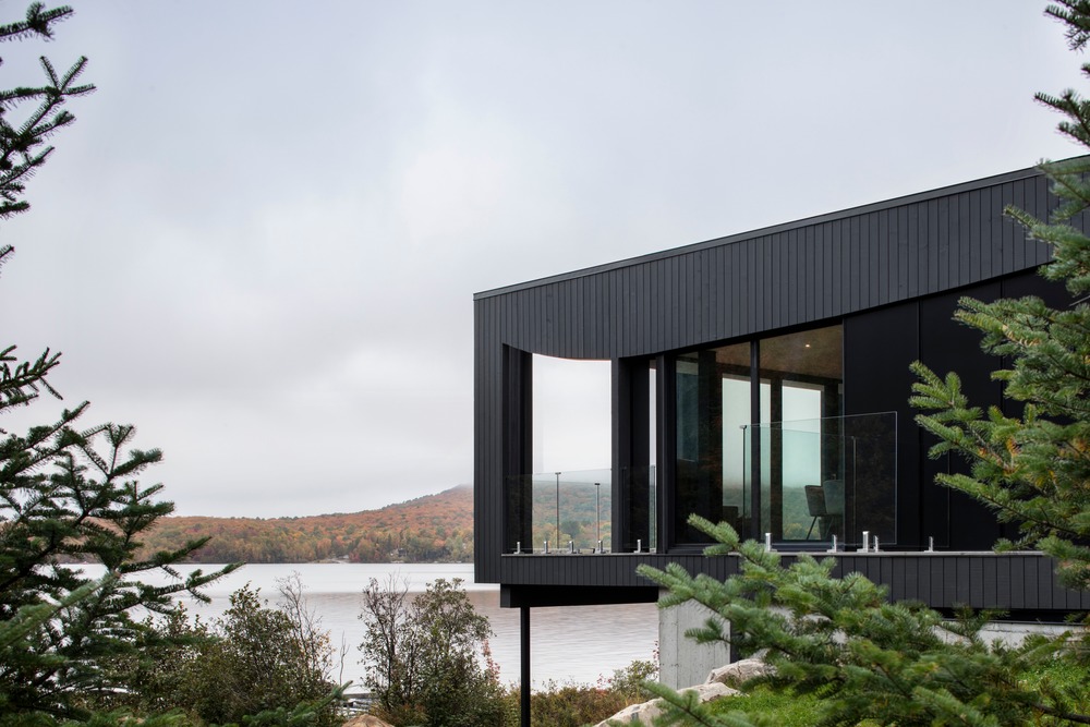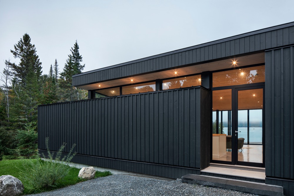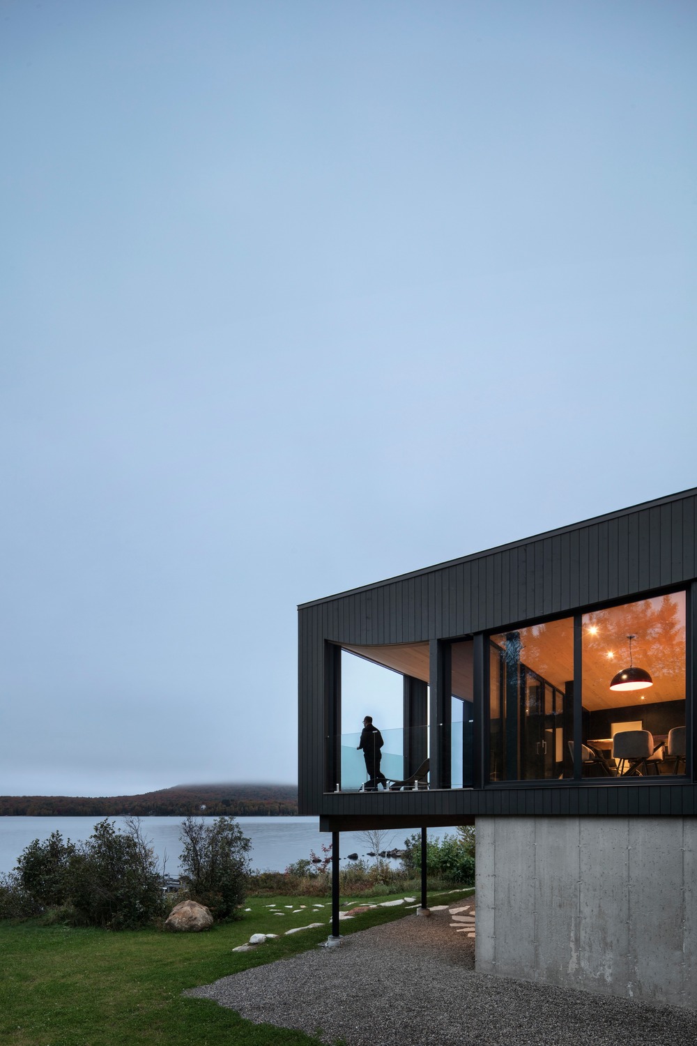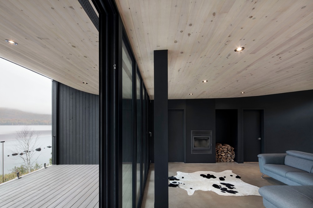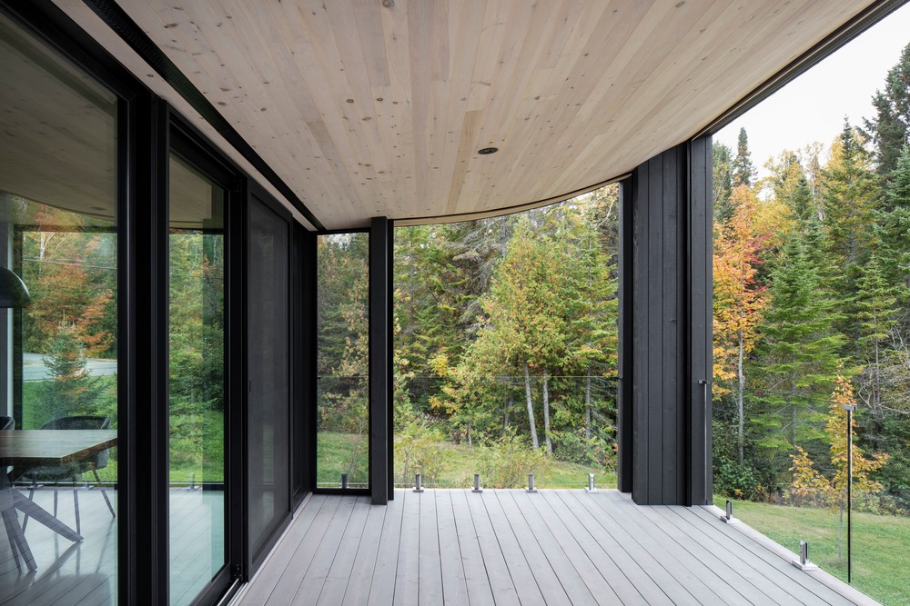 Depuis leur terrasse surélevée sous la courbe montante du toit, les résidents peuvent contempler la surface calme du lac. Les moustiquaires intelligemment intégrées permettent à la famille d’apprécier la nature toute l’année.