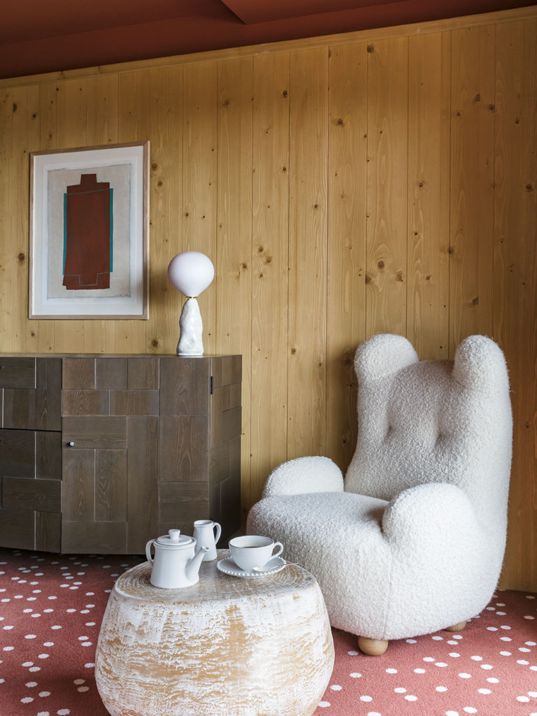 Le design. Signé Pierre Yovanovitch, le design brille par son raffinement, ses détails inouïs, partout, sa contemporanéité, ses surprises… La première apparaît dès l’arrivée dans le lobby. L’architecte d’intérieur – qui a eu carte blanche et dix-huit mois seulement pour penser les 12 000 m2 de l’hôtel – nous immerge dans un monde à part et onirique. Avec sa double hauteur, ses bancs en bois et velours formant un cercle, sa fresque aux tonalités fortes réalisée par l’artiste Matthieu Cossé représentant des chouettes, son lustre dessiné par l’architecte d’intérieur suggérant le nid d’un coucou, l’entrée impose sa majesté et sa singularité. « J’ai ensuite créé des moments très distincts pour le restaurant Beefbar, le bar plus foncé, le restaurant italien plus « old style », le spa et les chambres, assez différentes, toutes relativement grandes… » « Ma famille avait un chalet dans les Alpes du Sud, poursuit Pierre Yovanovitch. J’ai réinterprété de manière plus contemporaine mes souvenirs d’enfance à la montagne, à travers, par exemple, ces grandes tables en bois dans le restaurant avec des incrustations de céramique. Mais dans cette évocation des codes alpins, j’avais envie de couleurs, de matières, de retranscrire quelque chose de plus léger et de plus joyeux. » Meubles chinés, pièces iconiques de l’architecte d’intérieur – comme les fauteuils Oops et Mad –, et ses propres créations se marient à l’unisson. Précisons que pour l’hôtel, il a dessiné 230 meubles en moins de deux ans ! « C’est du délire ! », s’amuse-t-il. Mais cette prouesse confère un vrai supplément d’âme au décor et nous émerveille, à l’image de ses meubles avec des pieds imitant des pattes d’oiseau, des patères aux allures de chouettes, des suspensions de verre givrées évoquant la fonte d’un glaçon, des petites poignées « glaçons » des commodes, etc. Autres interventions d’artistes, d’artisans, présence de nombreuses œuvres d’art contemporain, issues de la collection de la famille Pariente ou sélectionnées par Amélie du Chalard, participent également à la beauté et à l’harmonie des espaces.