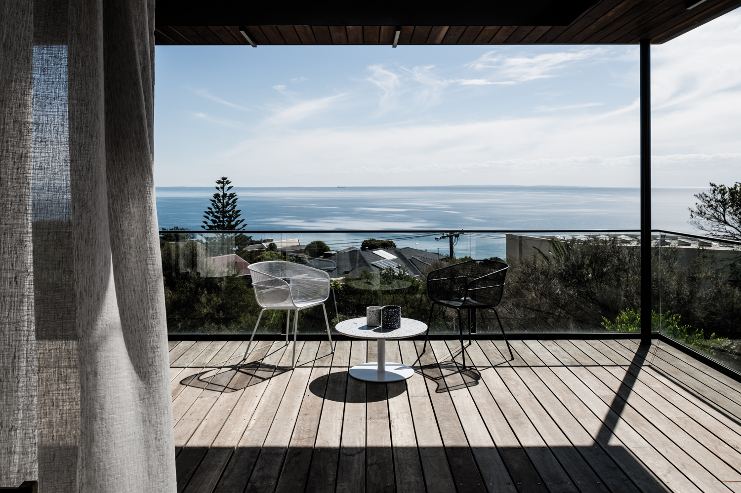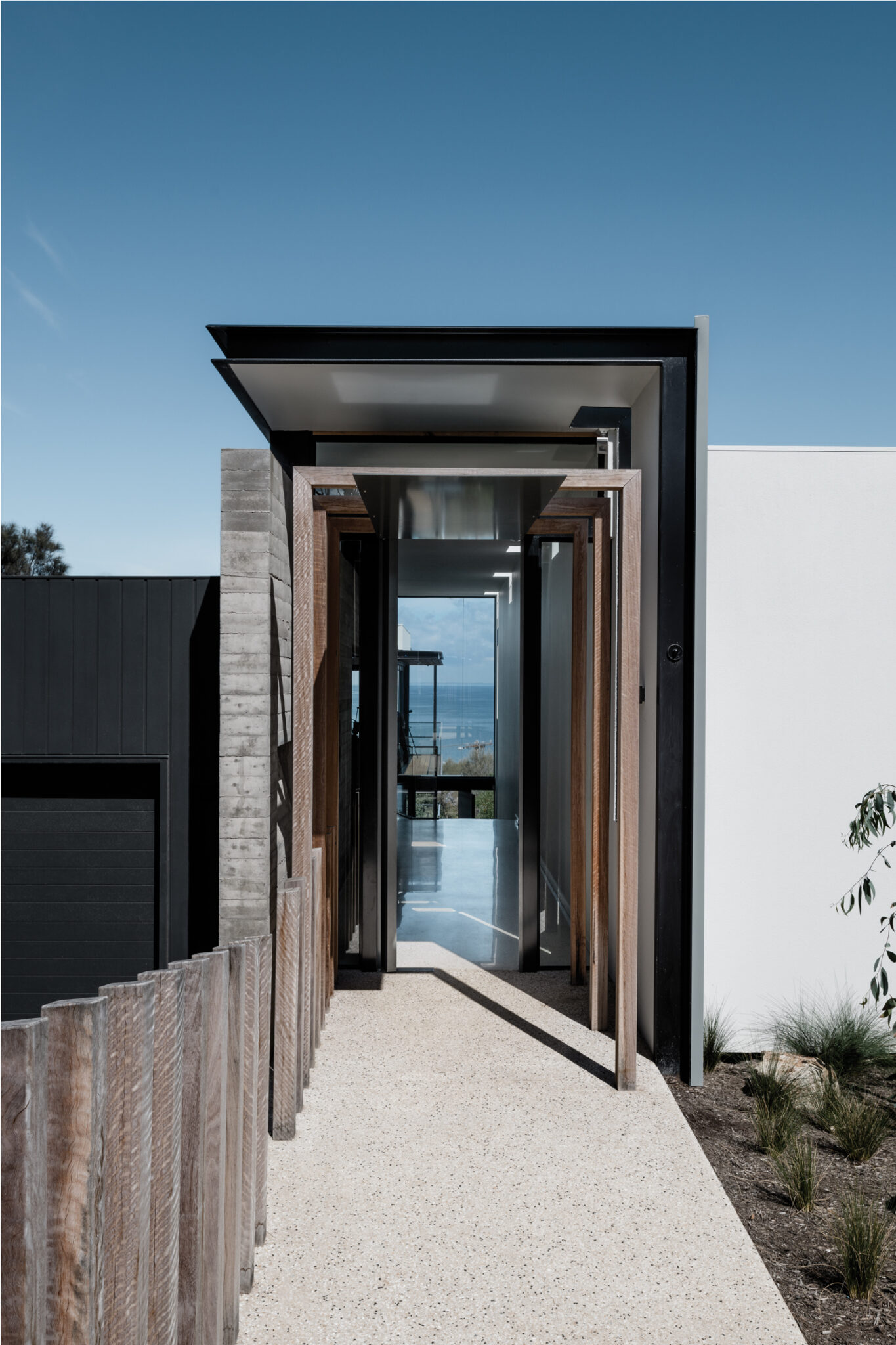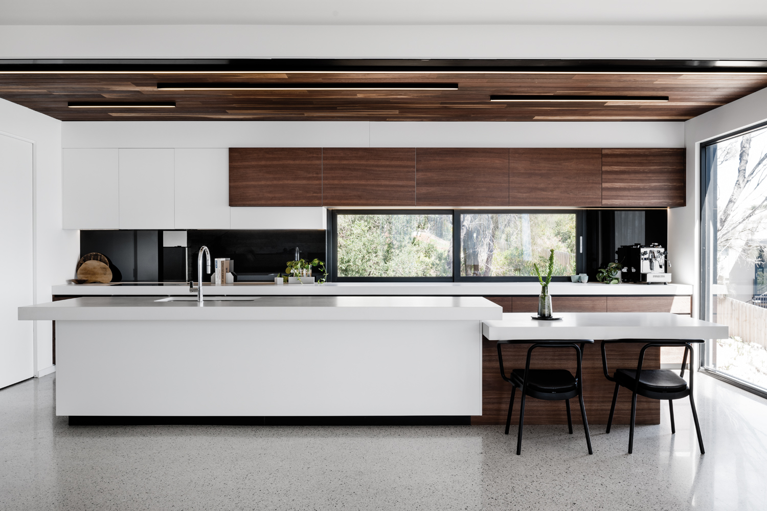 Pour son projet de la maison Eliza, le défi d’harmonie n’a pas manqué. Nichée sur un terrain en angle, la maison a été dessinée pour maximiser toutes les vues alentours qu’elle offre à ses habitants. À l’approche, une petite maison seule apparaît, laissant entrevoir un projet modeste qui ne dévoile pas encore toute l’ambition de la maison Eliza. Il faudra se rapprocher encore un peu pour contempler cette construction composée de deux parties distinctes. La petite maison donc, et puis l’autre, plus large, plus généreuse. Orientée nord-est, cette partie abrite la suite parentale et la pièce de vie. Entièrement offerte à la vue sur la ville de Melbourne puis, plus loin, sur l’océan, elle est aussi en première position pour capter les rayons du soleil tout au long de la journée. Un peu plus loin, un couloir mène vers un espace sur une double hauteur qui contient le second salon de la maison. Entièrement vitrée sur toute la hauteur de sa façade, la pièce offre l’une des vues les plus spectaculaires sur la baie.