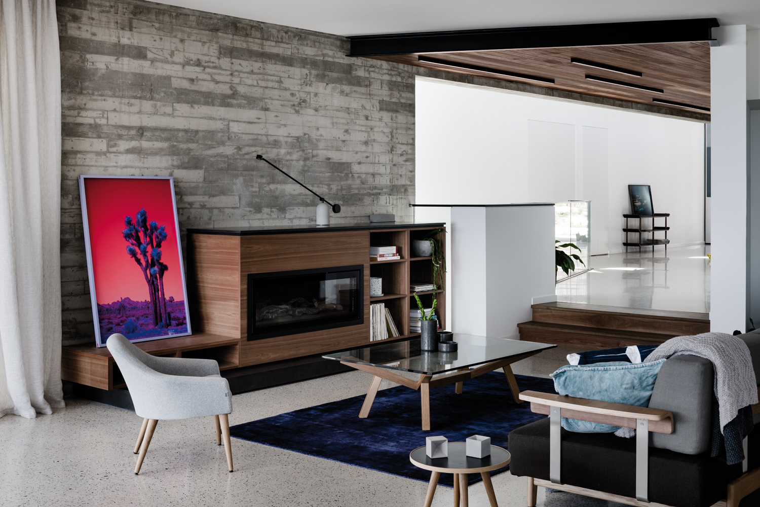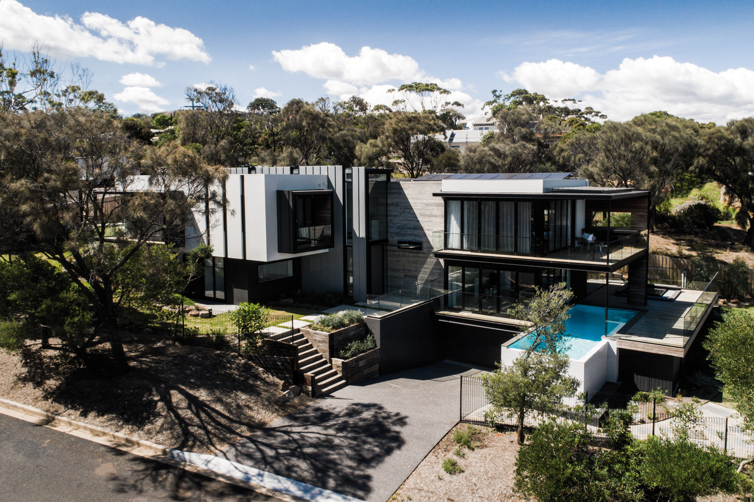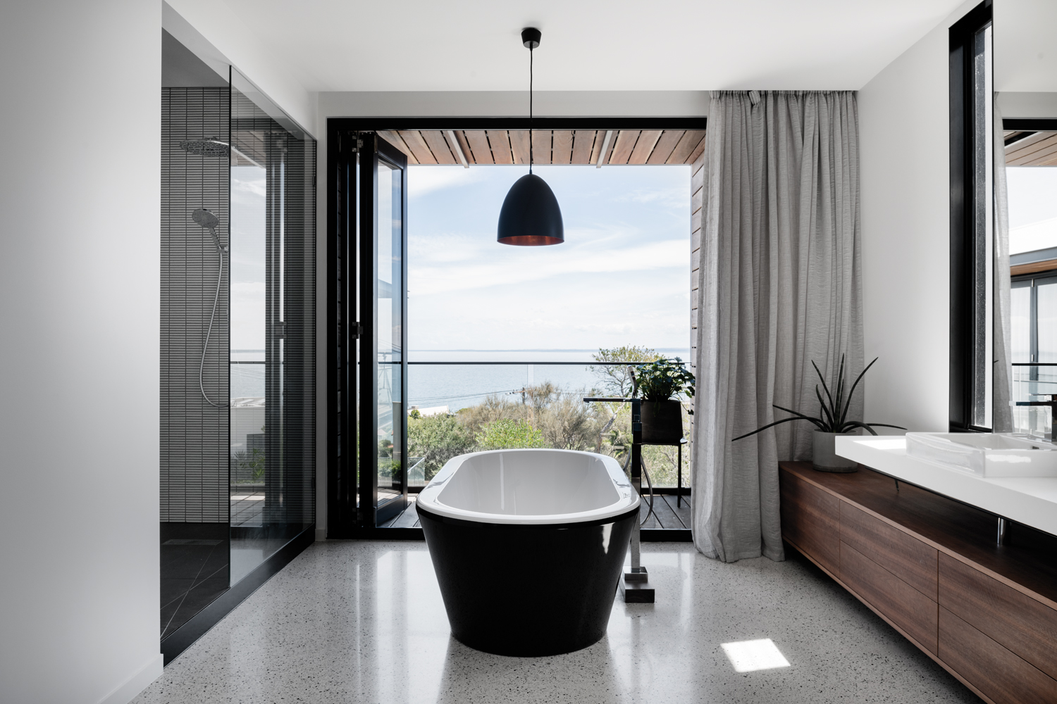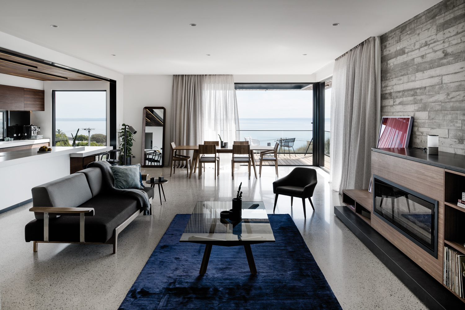 Pour son projet de la maison Eliza, le défi d’harmonie n’a pas manqué. Nichée sur un terrain en angle, la maison a été dessinée pour maximiser toutes les vues alentours qu’elle offre à ses habitants. À l’approche, une petite maison seule apparaît, laissant entrevoir un projet modeste qui ne dévoile pas encore toute l’ambition de la maison Eliza. Il faudra se rapprocher encore un peu pour contempler cette construction composée de deux parties distinctes. La petite maison donc, et puis l’autre, plus large, plus généreuse. Orientée nord-est, cette partie abrite la suite parentale et la pièce de vie. Entièrement offerte à la vue sur la ville de Melbourne puis, plus loin, sur l’océan, elle est aussi en première position pour capter les rayons du soleil tout au long de la journée. Un peu plus loin, un couloir mène vers un espace sur une double hauteur qui contient le second salon de la maison. Entièrement vitrée sur toute la hauteur de sa façade, la pièce offre l’une des vues les plus spectaculaires sur la baie.