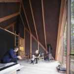 Vue de l’extérieur, la forme cristalline de la « maison » donne une apparence en constante évolution ; à l’intérieur, l’espace de 180 pieds carrés permet un certain confort. Enfin le contact avec la nature se fait de part les matériaux utilisés : charpente en pin massif, parquet en sapin de Douglas et murs en liège isolants naturels. La structure est également surélevée par quatre piliers en béton, tout d’abord pour un soutien optimal, mais également pour permettre à ses propriétaires de la placer pourquoi pas, dans les zones les plus reculés.