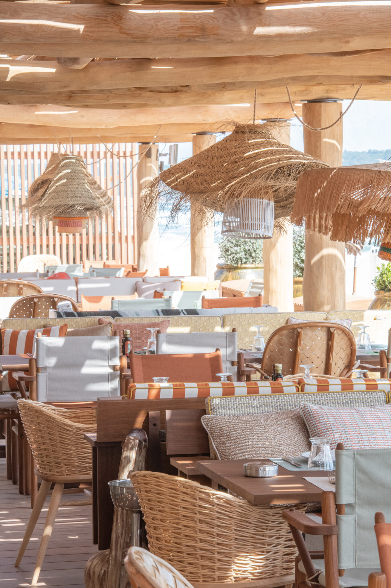 Un petit écrin de paradis sur la route de Pampelonne… C’est en longeant le chemin bordé de bambous que l’on découvre ce lieu entièrement dédié au plaisir de la mer et à la convivialité. Jacques Naveau et Anthony Ugo, architecte ramatuellois, ont imaginé ici un nouveau projet aux contours écologiques. La décoration à l’esprit bohème et nomade, signée Joyce Naveau, confère une tonalité naturelle et sauvage à la cabane, sublimée notamment par du bois, de la pierre de Toscane et des tissus d’Amérique Latine.