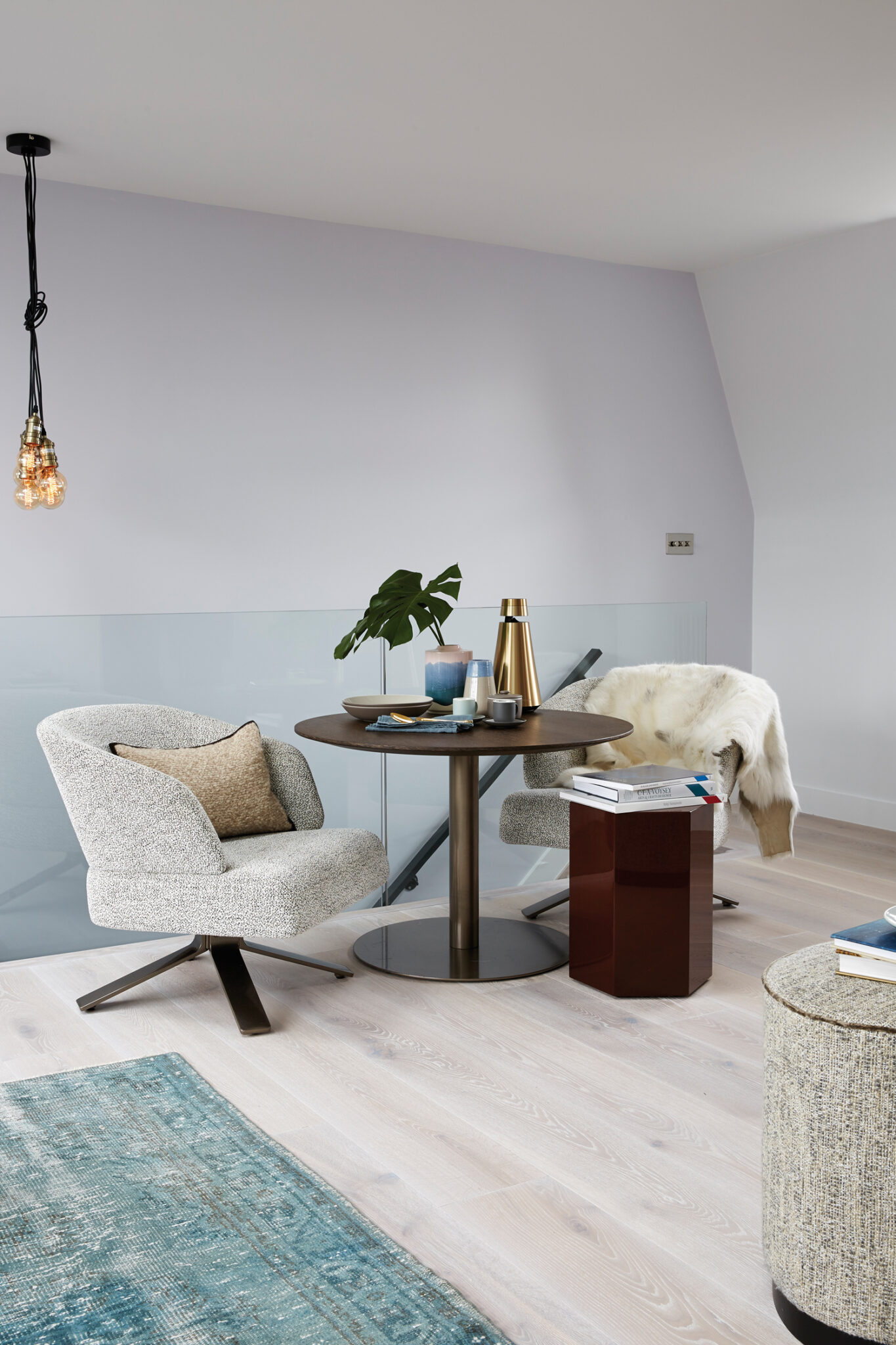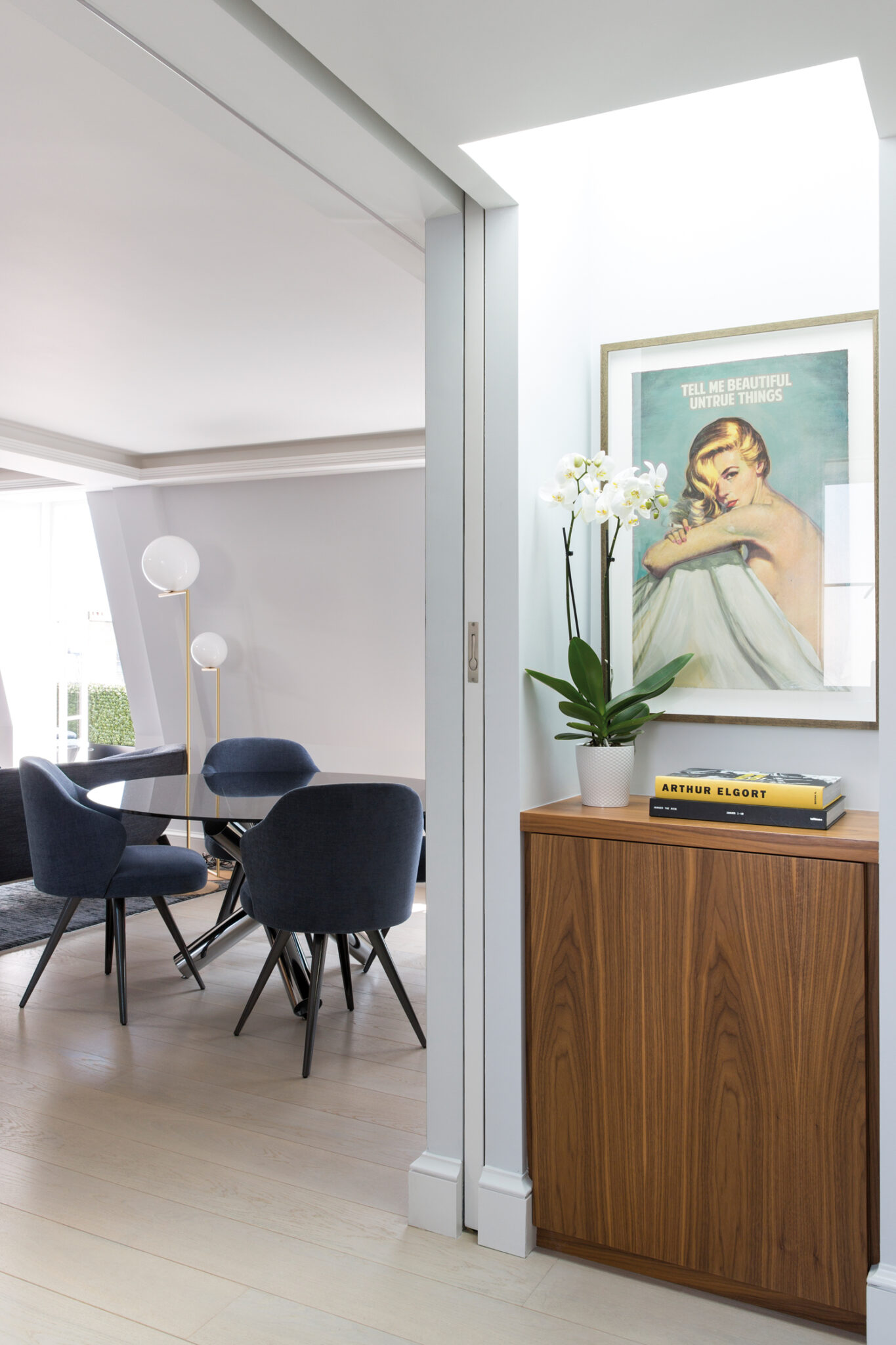 Côté décoration, Maurizio Pellizzoni a opté pour un intérieur aux contours dynamiques et féminins avec de douces couleurs pastel, un mélange de textures, des finitions en laiton poli et chrome élégantes, des œuvres d’art fortes – des photographies principalement – des artistes Stefanie Schneider, Lukas Dvorak et Sven Pfrommer, fournies par la galerie LUMAS de Mayfair. Les luminaires sont signés Flos, tandis que nombre de meubles designés par Rodolfo Dordoni ont également été dénichés dans le showroom de Minotti à Londres, à l’image du sofa Creed, du fauteuil Rivera, des tables basses Kirk « Cross » ou encore du banc Freeman… Une merveille pour la jeune habitante issue de la nouvelle génération !