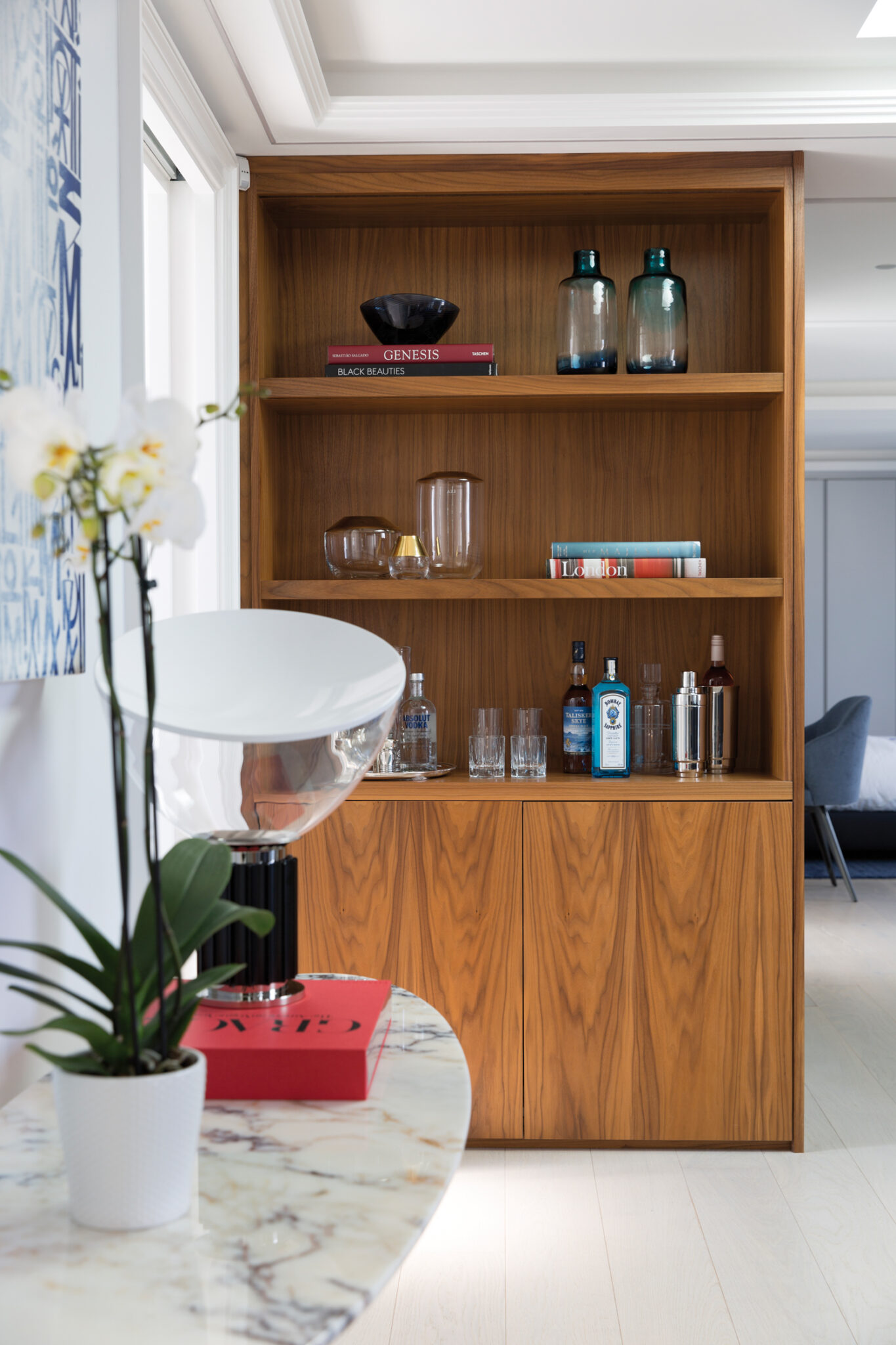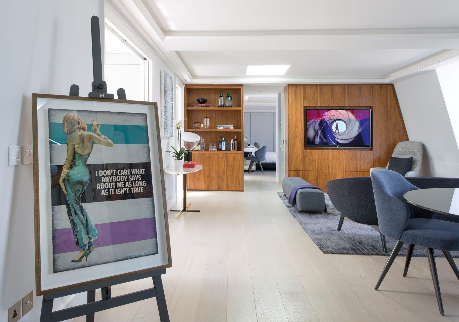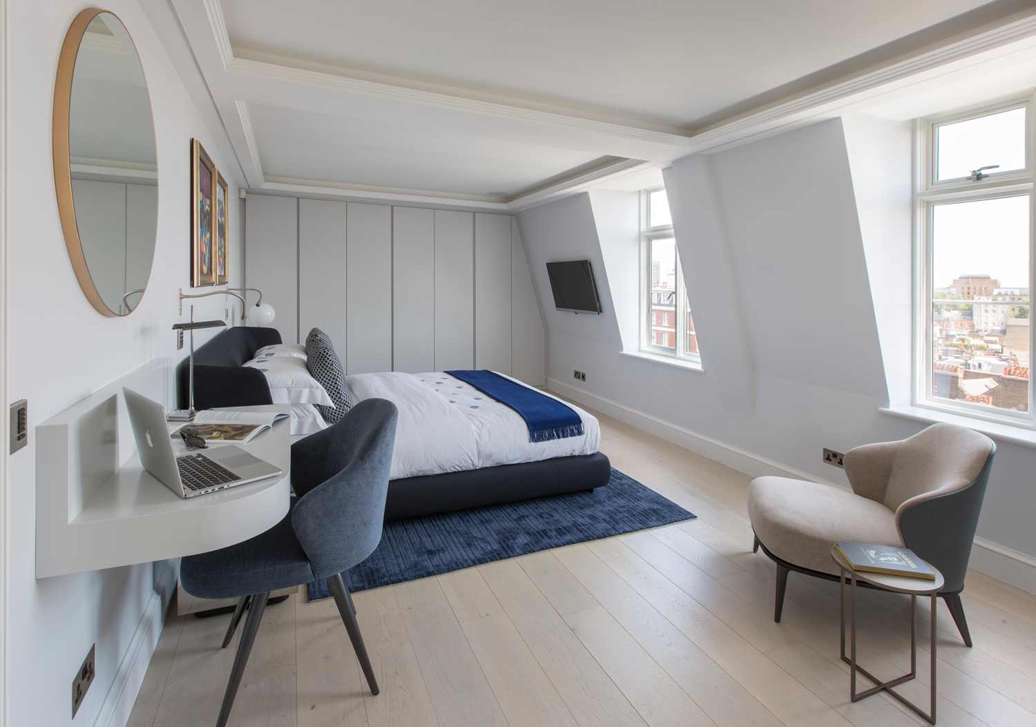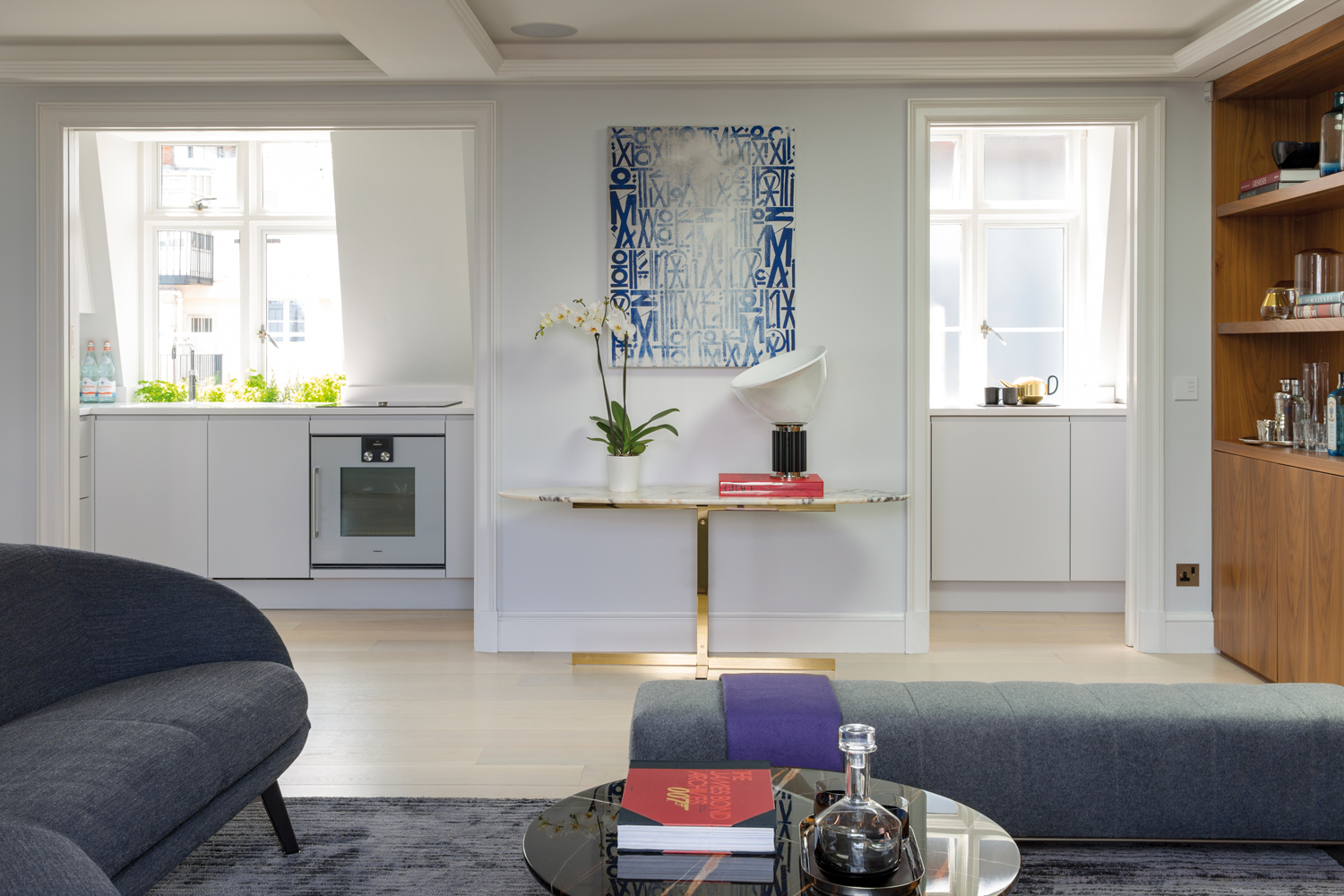 Dans l’un des quartiers les plus exclusifs de la capitale du Royaume-Uni, le penthouse Mayfair de 100 m2 présente le meilleur du « Made in Italy ». À l’origine, l’habitation comptait deux appartements séparés. Ils ont été réunis en un seul bien et entièrement repensés par Maurizio Pellizzoni. Pour les intérieurs, baignés de lumière naturelle, l’architecte d’intérieur a opté pour des tonalités claires, avec des notes de gris et de bleu, de beaux matériaux, des finitions en laiton poli et en chrome accentuant la noblesse du lieu, tout comme le choix du mobilier Minotti, provenant du showroom londonien, avec de sublimes pièces de l’éditeur italien designées par Rodolfo Dordoni, dans la pièce de vie et les chambres : entre autres la bergère Jacques, les tables basses Ellis et Catlin, le canapé Russell, la table de repas Van Dyck, le lit Creed, le fauteuil lounge Leslie, etc. La sélection d’œuvres d’art de la galerie Maddox, ajoute de la singularité à l’endroit tout en lui conférant une certaine modernité. Une métamorphose qui se démarque réellement des rénovations typiques du quartier de Mayfair.