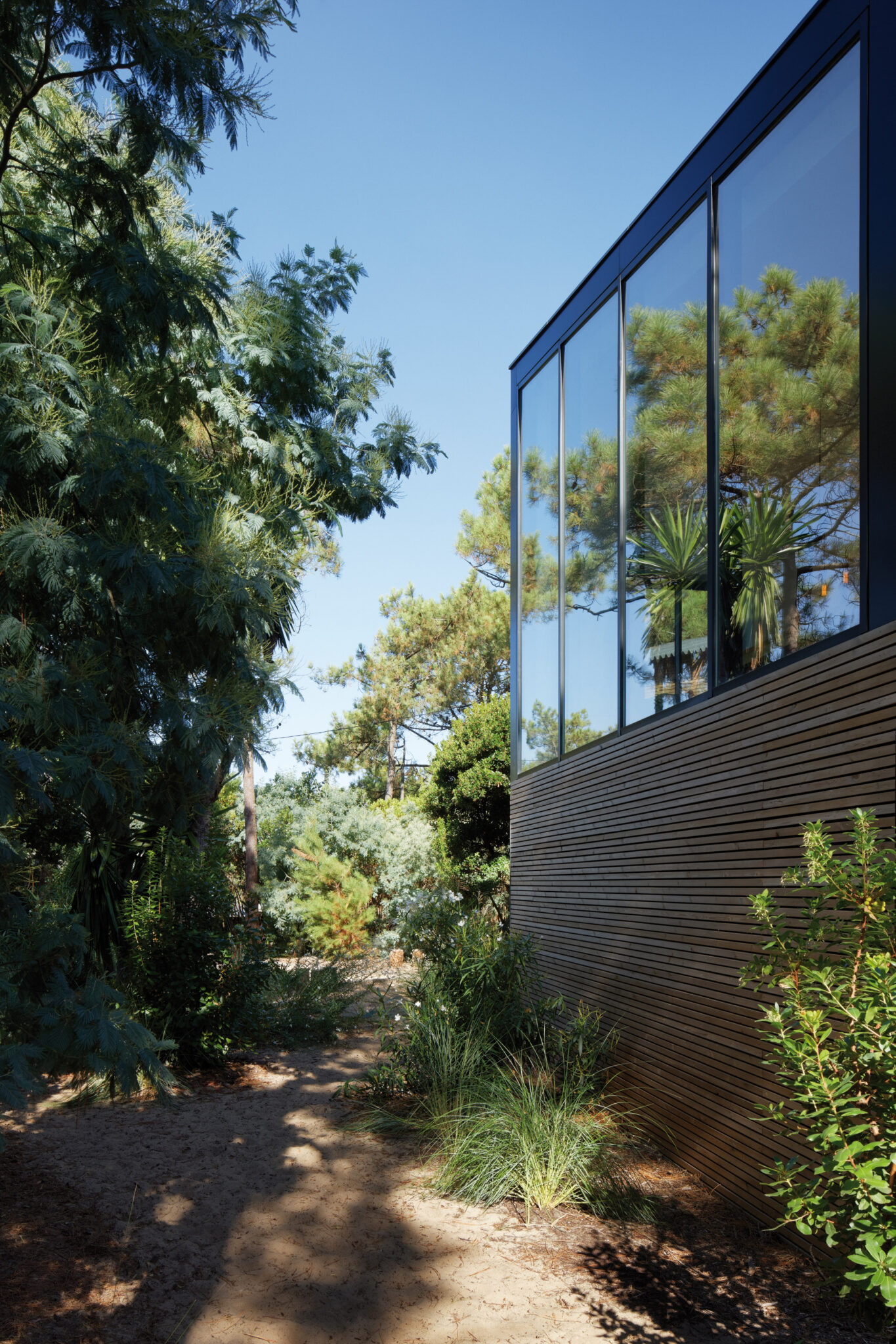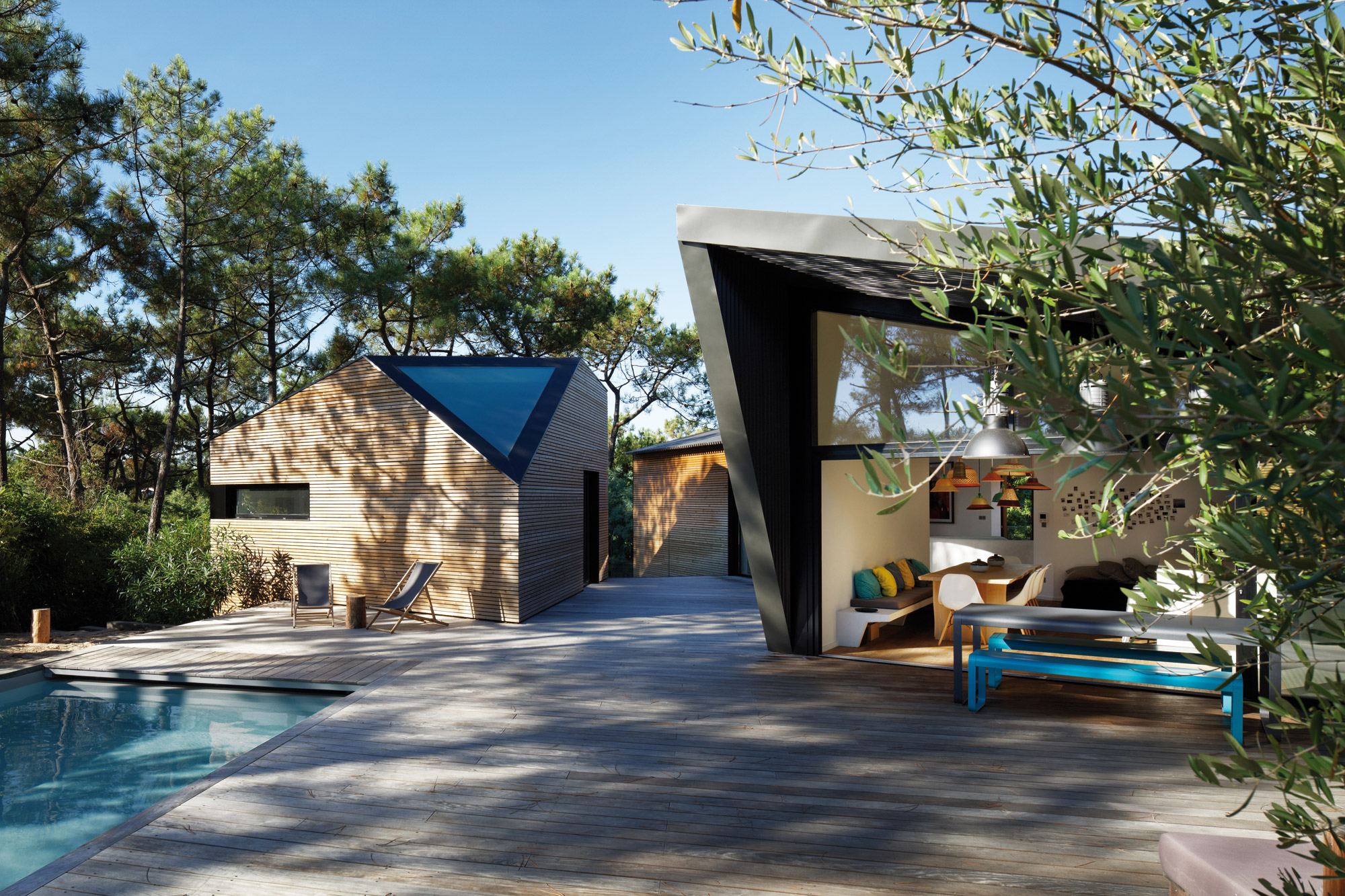 « À l’image de la presqu’île du Cap-Ferret, le terrain qui descend en pente douce vers la mer est une petite pinède d’arbousiers, yuccas et pins, typiques de la région, détaillent les architectes.Il s’agissait donc de concevoir un projet en harmonie avec son paysage et de limiter son impact sur l’environnement végétal existant. Rappelant les cabanes dans les arbres, la maison multiplie les percées visuelles qui accentuent sa relation à la nature. Son implantation permet de conserver au maximum les arbres existants tandis que le bois est majoritairement utilisé en façade jouant du mimétisme avec la pinède. » Le bois brille effectivement par sa présence à l’extérieur comme à l’intérieur avec, entre autres, des terrasses en bois, du red cedar au niveau du bardage de la façade, du parquet bois brut à l’intérieur, quelques meubles en bois.