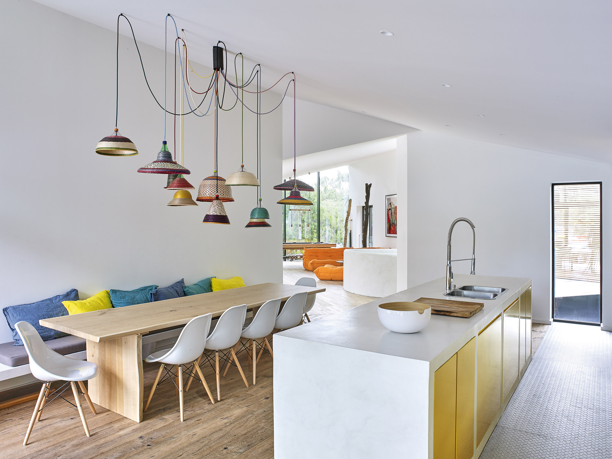 Afin de profiter au maximum des sublimes points de vue sur la nature, les architectes n’ont pas hésité à sortir des sentiers battus : ils ont inventé des ouvertures en triangle ou encore des lignes biaises qui dynamisent la construction. En opposition à cela, d’autres éléments architecturaux viennent adoucir les intérieurs, à l’image du dortoir maçonné des enfants ou encore de l’escalier sculptural en béton tout en rondeur qui voisine, dans le salon, avec les iconiques canapés Togo de Michel Ducaroy (Ligne Roset). On aime par ailleurs le choix de leur couleur, du orange, parce que cette tonalité ajoute du peps à la décoration ! Cette gaieté, on la retrouve également dans la pièce de repas où se mêlent meubles de cuisine jaune et suspensions multicolores Pet Lamp d’Alvaro Catalán de Ocón au-dessus de la table. L’atmosphère générale se veut plutôt décontractée… Une ambiance qui correspond à merveille à l’esprit d’une maison de vacances !