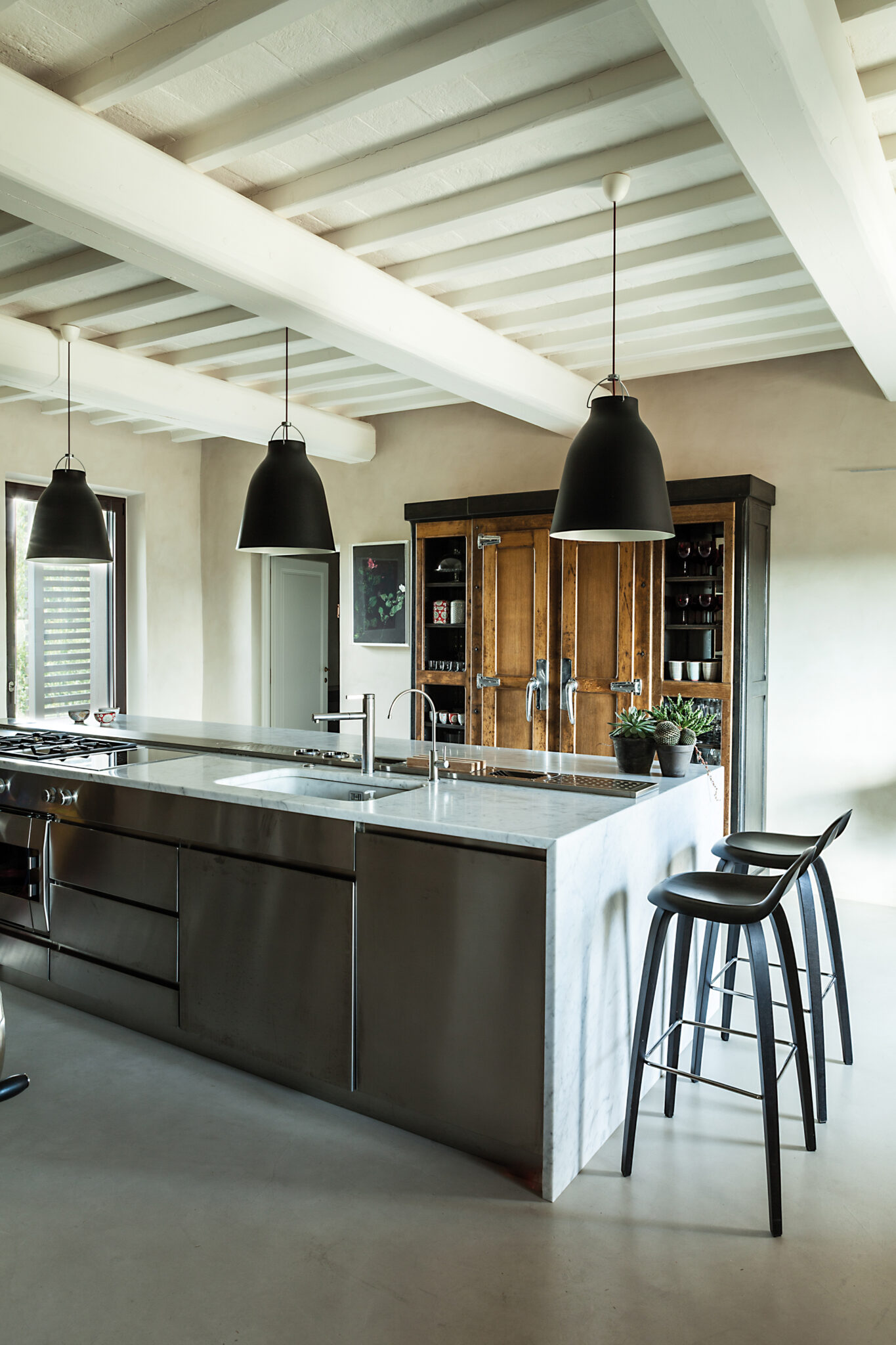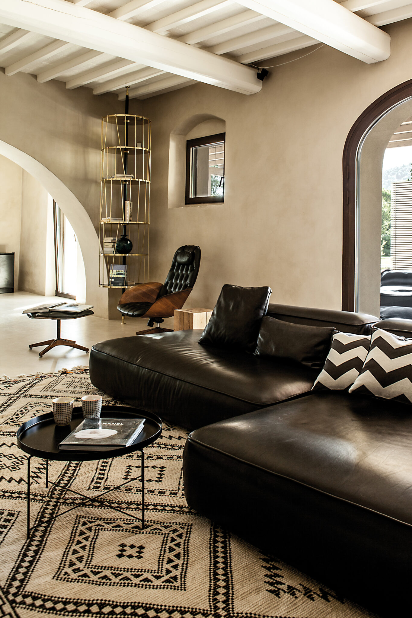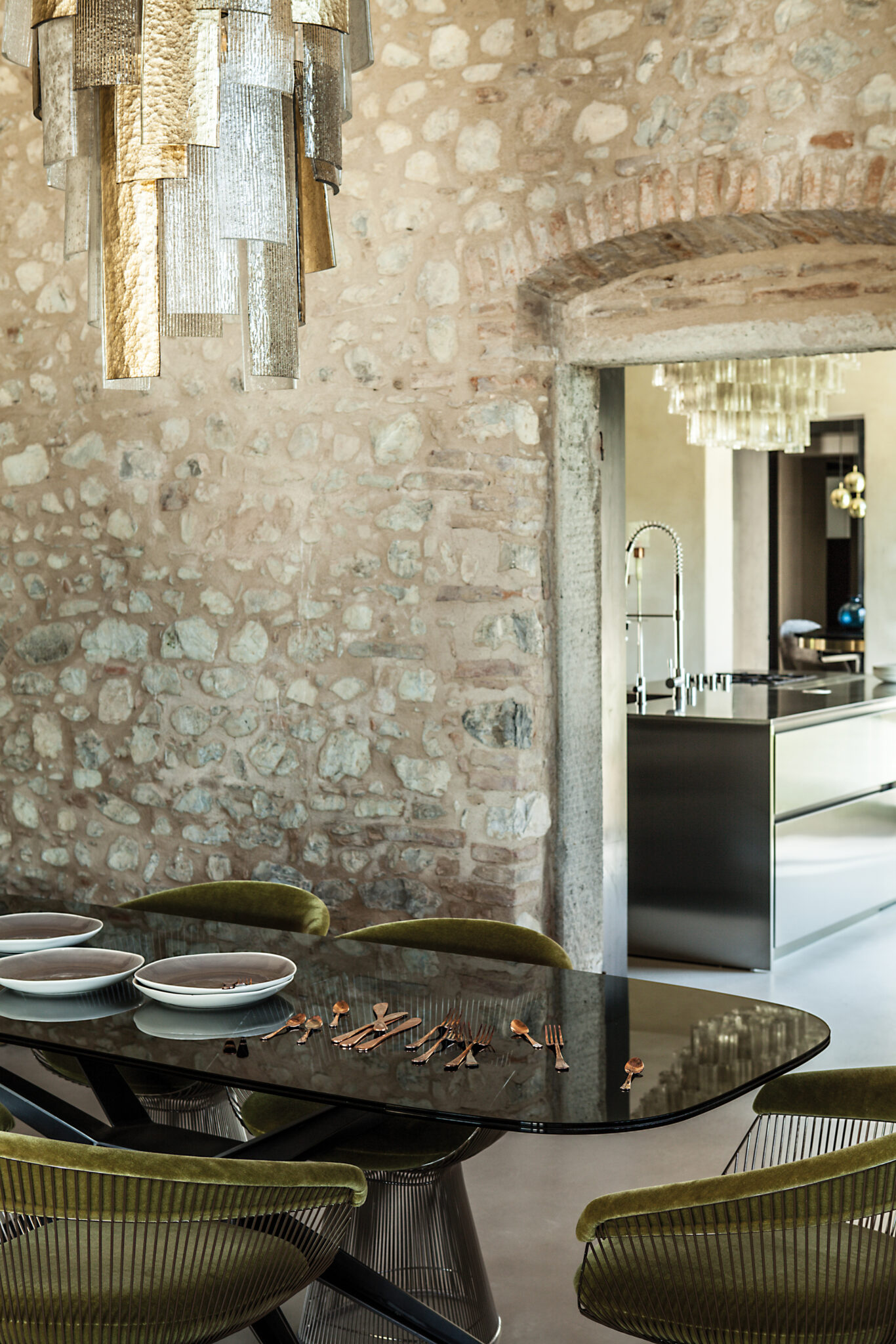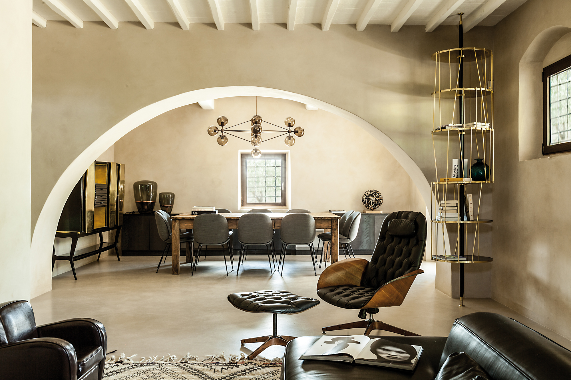 Au dehors donc, un travail de maintenance où chaque pierre est nettoyée pour retrouver ses couleurs. La reconversion faite dans les règles de l’art commence entre autres par un sablage mais surtout par un travail structurel de longue haleine. Les toitures sont refaites, les vieux bétons et plâtres sont retirés pour laisser place à des matériaux traditionnels, offrant une esthétique chaleureuse et artisanale. Une fois reconsolidés, les deux bâtis peuvent alors accueillir leurs nouvelles configurations intérieures, imaginées par les deux architectes. Des rez-de-chaussée ouverts où les pièces de vie communiquent aisément entre elles, se séparent par portes coulissantes, en s’offrant toutes vers le monde extérieur, vers l’« aia », la place du partage en Italie. À l’intérieur, et dans les deux maisons, construites non pas à l’identique mais sur des inflexions et lignes similaires, les matériaux sourcés localement promettent la patine de l’ouvrage fait main. Mais pourtant, le ton est ailleurs. Un ton entièrement offert à la modernité et qui ne laisse en rien imaginer l’origine de la demeure. Sols de résine délicatement satiné, pièces de mobilier design (parmi lesquelles le chandelier Modo par Roll & Hill, fauteuils Beetle de Gamfratesi pour Gubi et canapé Cloud de Francesco Rota pour Lema), suspensions et mobilier structurant en métal noir ainsi que quelques pièces chinées ici et là, contribuent en effet à offrir des espaces chaleureux et impeccablement contemporains.