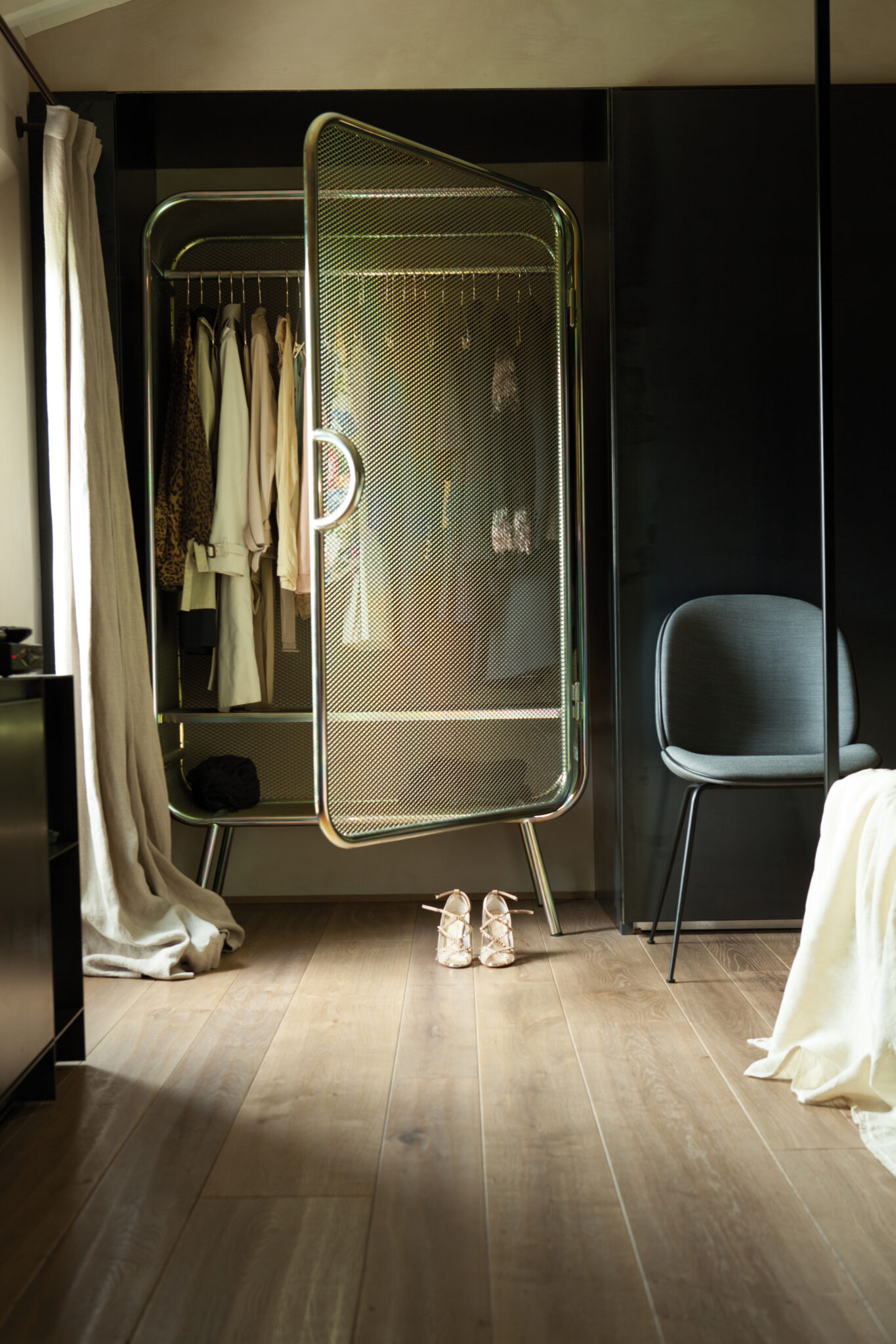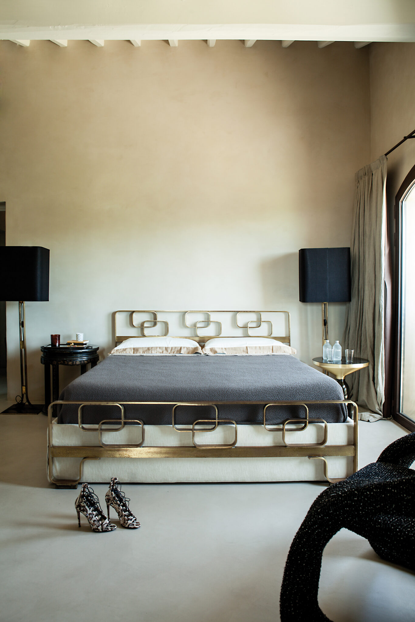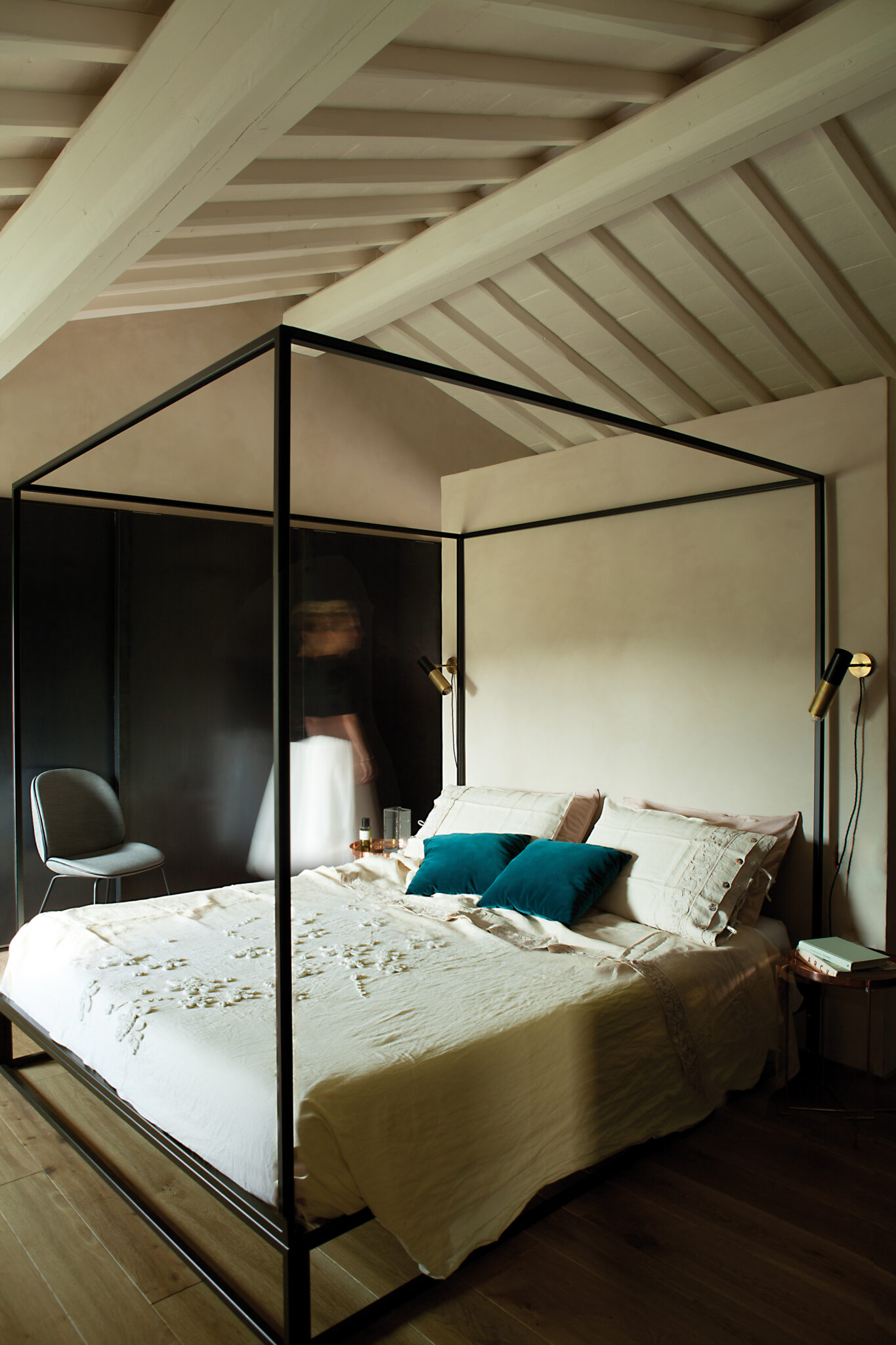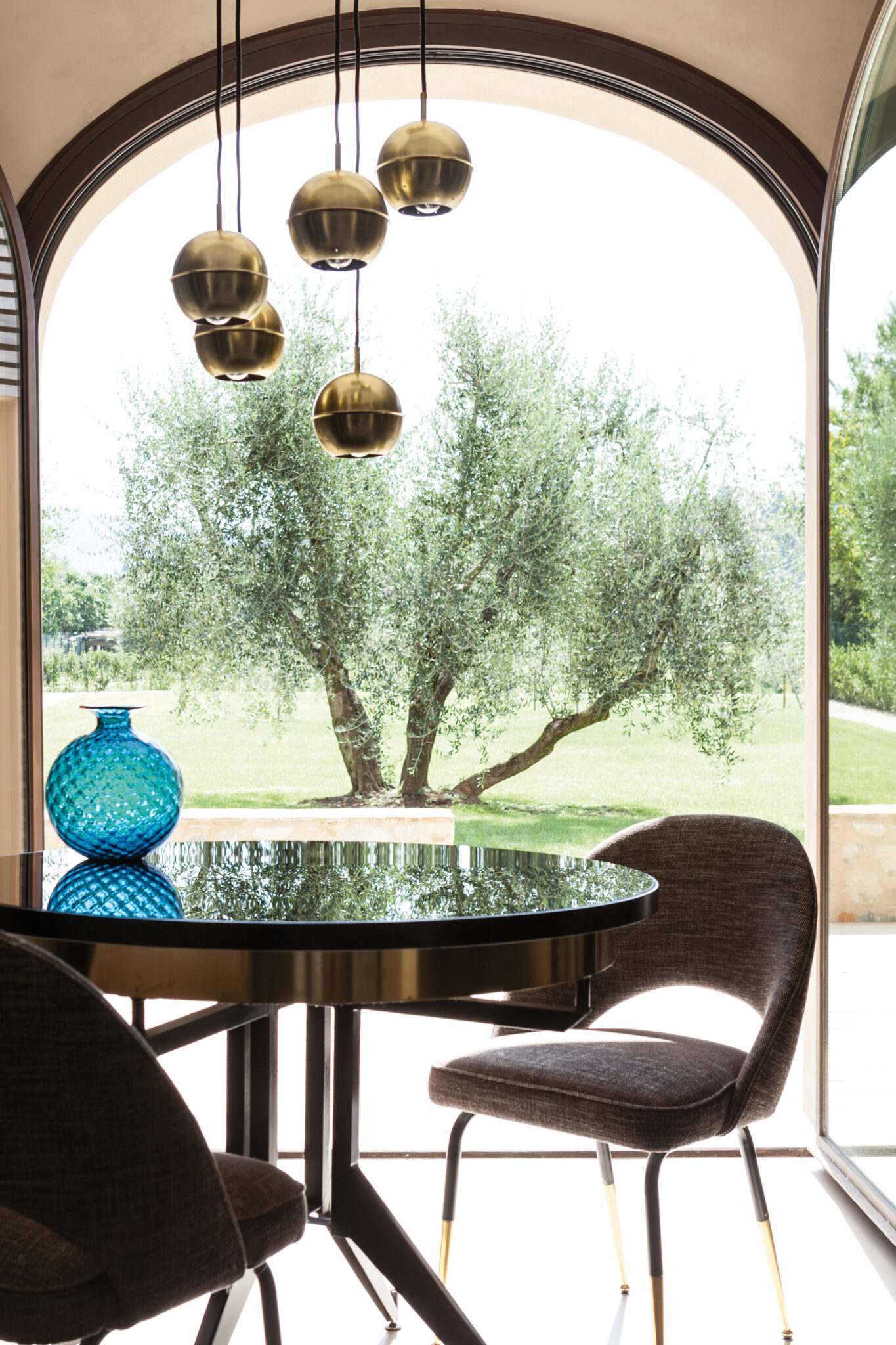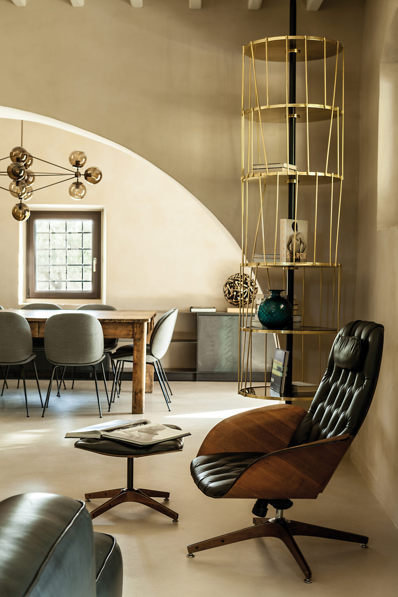 Au dehors donc, un travail de maintenance où chaque pierre est nettoyée pour retrouver ses couleurs. La reconversion faite dans les règles de l’art commence entre autres par un sablage mais surtout par un travail structurel de longue haleine. Les toitures sont refaites, les vieux bétons et plâtres sont retirés pour laisser place à des matériaux traditionnels, offrant une esthétique chaleureuse et artisanale. Une fois reconsolidés, les deux bâtis peuvent alors accueillir leurs nouvelles configurations intérieures, imaginées par les deux architectes. Des rez-de-chaussée ouverts où les pièces de vie communiquent aisément entre elles, se séparent par portes coulissantes, en s’offrant toutes vers le monde extérieur, vers l’« aia », la place du partage en Italie. À l’intérieur, et dans les deux maisons, construites non pas à l’identique mais sur des inflexions et lignes similaires, les matériaux sourcés localement promettent la patine de l’ouvrage fait main. Mais pourtant, le ton est ailleurs. Un ton entièrement offert à la modernité et qui ne laisse en rien imaginer l’origine de la demeure. Sols de résine délicatement satiné, pièces de mobilier design (parmi lesquelles le chandelier Modo par Roll & Hill, fauteuils Beetle de Gamfratesi pour Gubi et canapé Cloud de Francesco Rota pour Lema), suspensions et mobilier structurant en métal noir ainsi que quelques pièces chinées ici et là, contribuent en effet à offrir des espaces chaleureux et impeccablement contemporains.