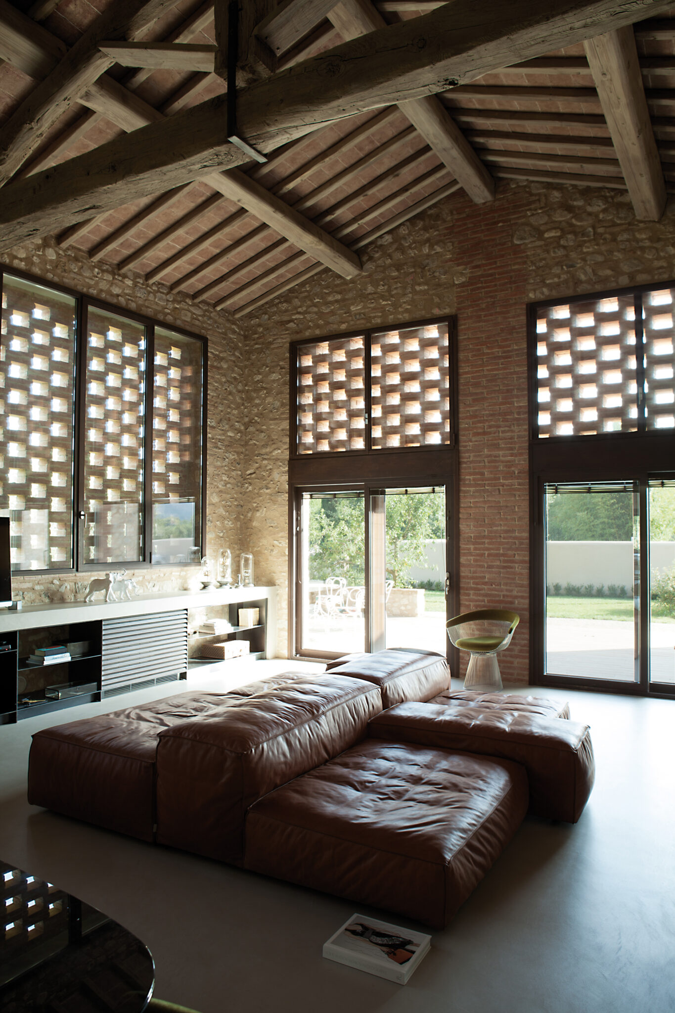 À une cinquantaine de kilomètres de Sienne ou un peu moins de cent de Florence, Travalle. Un village de Toscane planté en plein cœur d’une carte postale qui sent bon l’huile d’olive, les maisons de pierre et les longues tablées de déjeuners en famille. C’est ici, au milieu d’un verger d’oliviers, surplombant la vallée, que deux sœurs, Claudia et Elisa ont décidé de faire revivre leur image d’Epinal, pour elles et leurs familles respectives. Au centre du projet, une vieille ferme du XVe siècle, propriété de 700 m2, qui devait se transformer en une maison de vie pour deux familles. Des parties communes, mais aussi d’autres privatives devaient composer cet ensemble où parents et enfants pourraient évoluer, grandir, travailler et échanger dans le calme serein d’une maison du centre de l’Italie. Pour les architectes responsables du projet, il aura fallu un peu plus de trois années pour compléter cette réalisation de taille. Un projet complexe entre rénovation, conservation et modernité de rigueur, pour lequel les architectes Sabrina Bignami et Alessandro Capellaro vont œuvrer pour faire revivre la vieille bâtisse et sa grange, sans en écorcher les âmes.