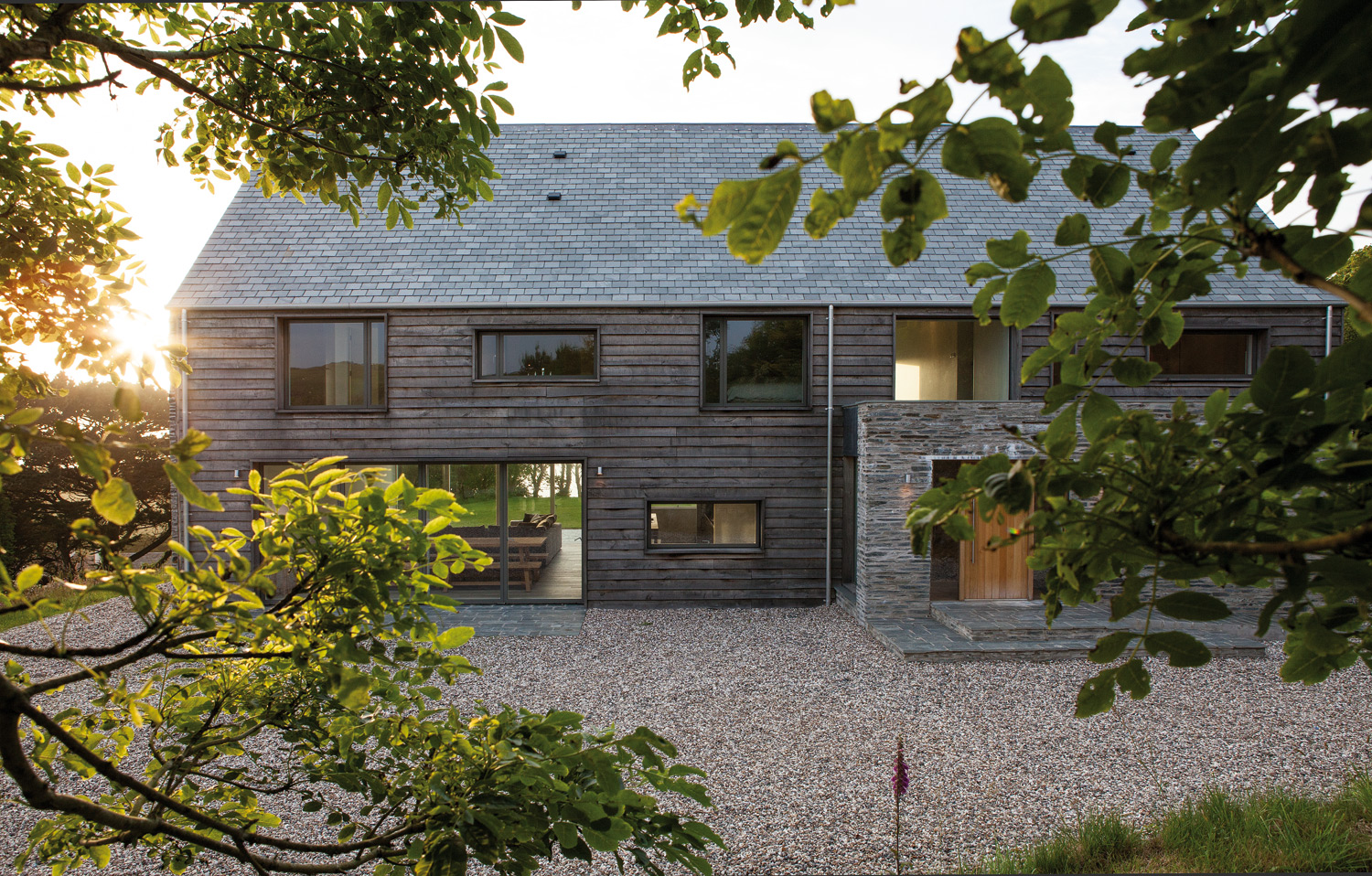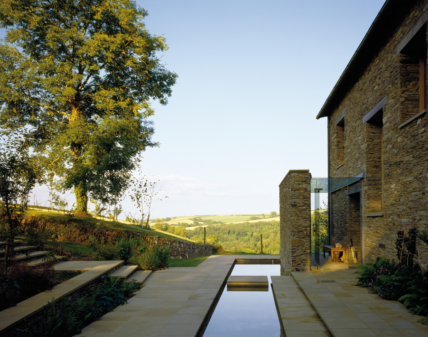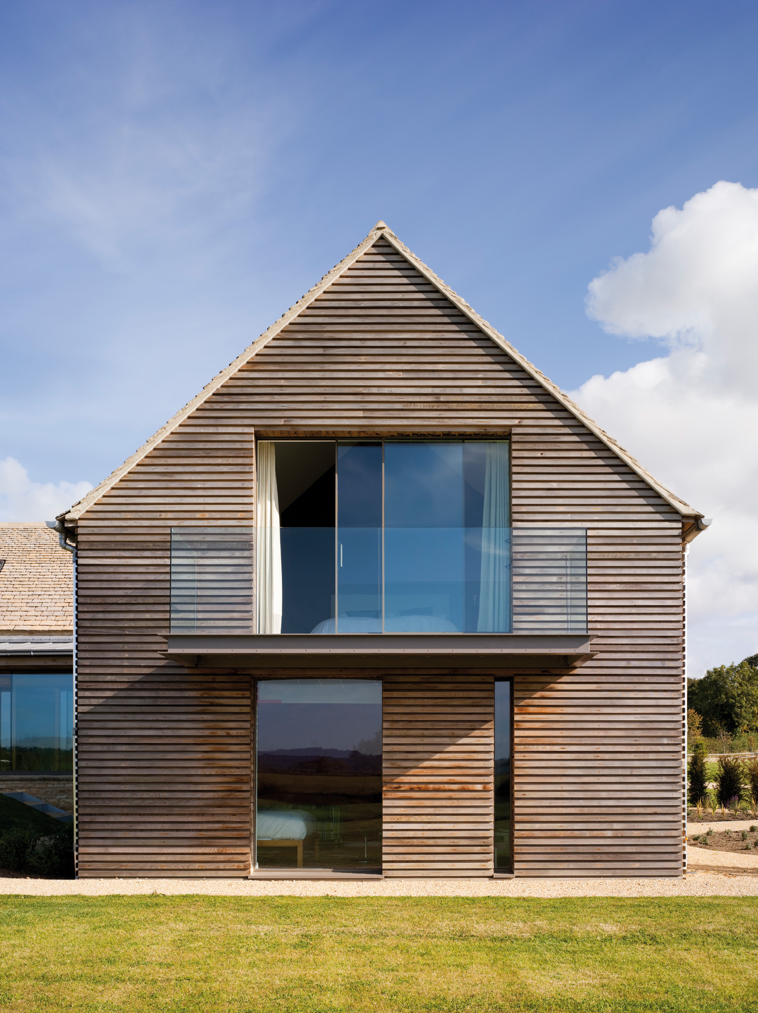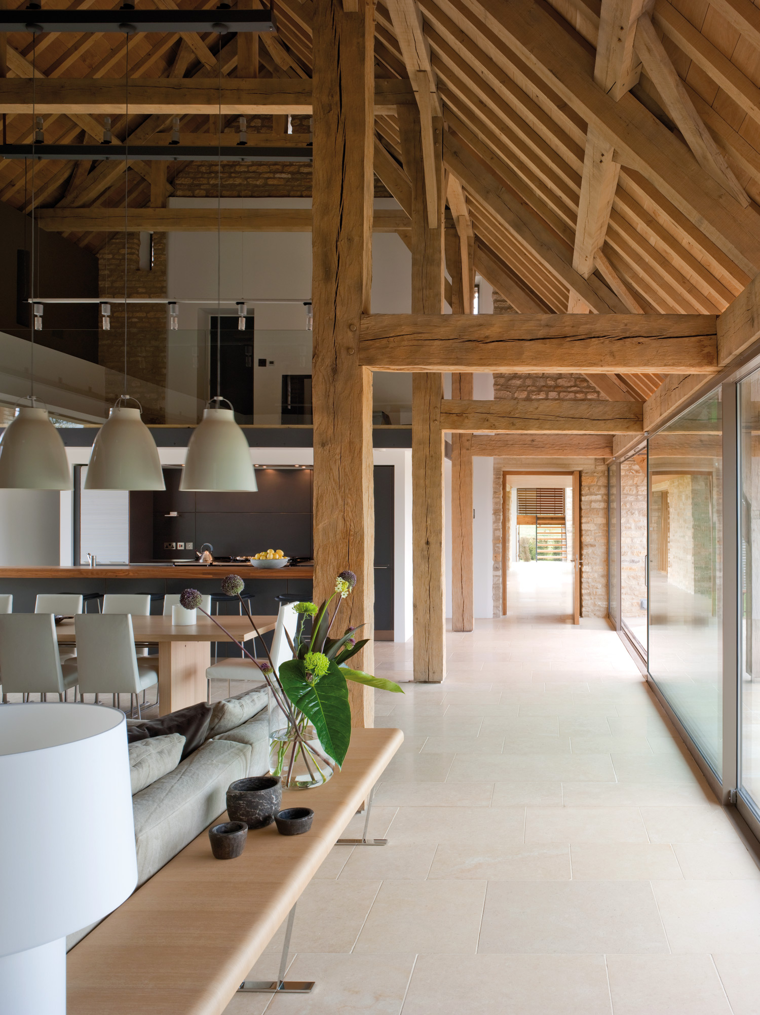 Car chez les McLean-Quinlan, on a, à l’évidence, une sainte horreur du superflu. La frugalité écossaise peut-être ? Ou tout simplement le bon sens, qui se détache systématiquement du stérile et de l’explétif pour mieux se concentrer sur l’essentiel, le bel utile, la vie. Un bon sens devenu véritable ADN, que l’on retrouve comme une marque de fabrique dans le projet Stow-on-the-World : la rénovation d’une ancienne grange devenue aujourd’hui une maison secondaire qui abrite une famille et ses quatre enfants. Au menu, un ancien corps de ferme dont les travaux de rénovation précédents ne satisfont pas McLean-Quinlan. La bâtisse est abattue et les pierres récupérées pour reconstruire la nouvelle habitation à laquelle seront ajoutées deux nouvelles ailes et une piscine. À l’intérieur, les espaces répondent aux exigences d’une vie de famille nombreuse qui aime recevoir et prendre son temps. Ainsi, la pièce de vie principale jouit-elle de toutes les attentions, dégagée d’un étage pour offrir une hauteur sous toit de neuf mètres de haut, que de larges baies vitrées, postées en avant-garde, viennent baigner de lumière naturelle.