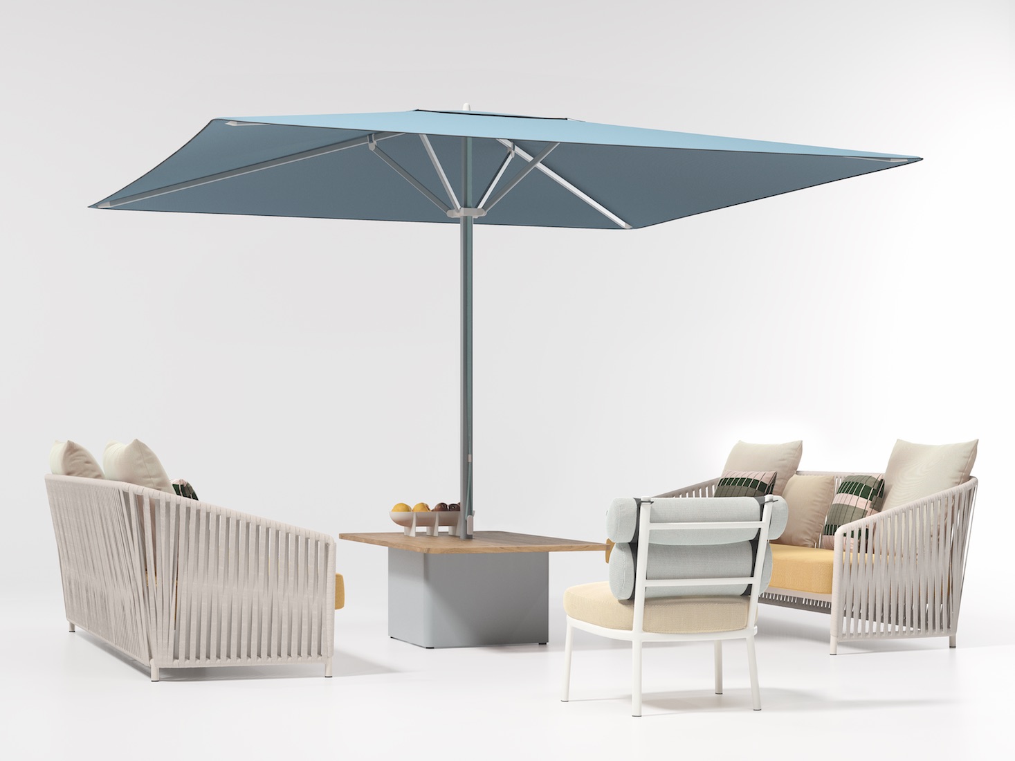 Après avoir lancé METEO en 2018, Kettal ajoute maintenant trois adaptations fonctionnelles au pied de parasol : un canapé/daybed, une table et un pot de fleurs. Chacun apporte une nouvelle utilité à cet élément qui, autrement, est encombrant.