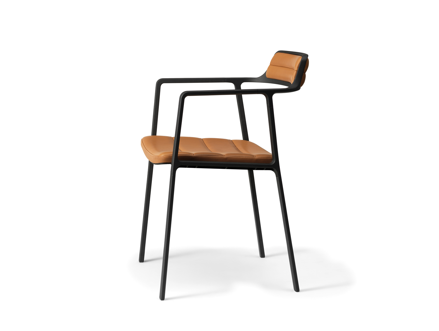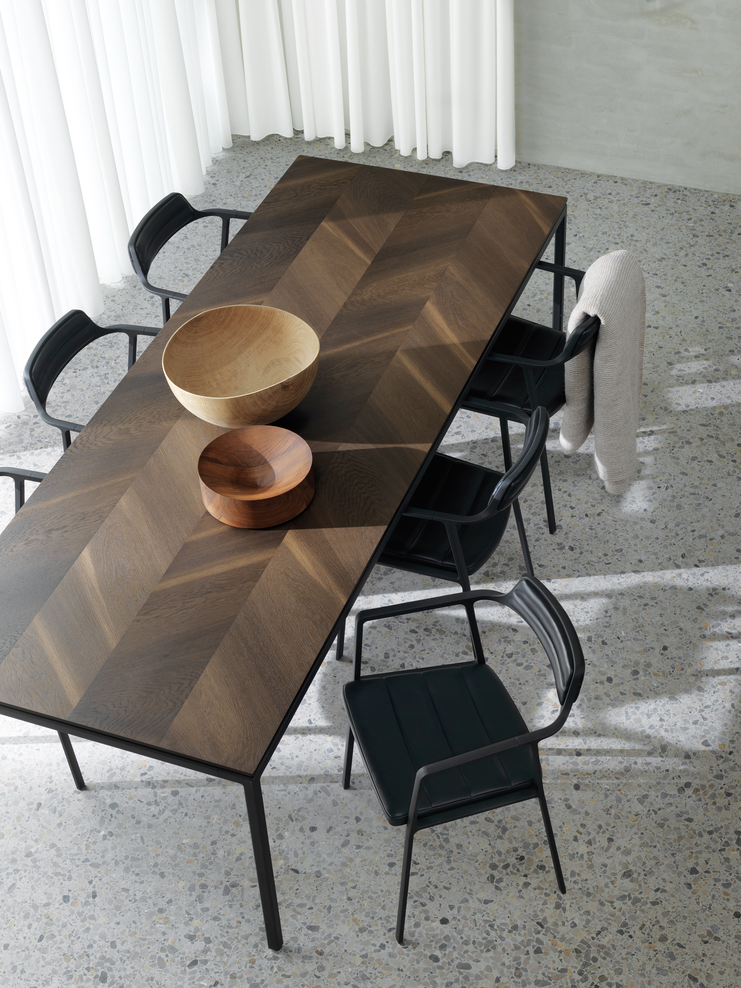 Et l’assise a fière allure, avec sa structure en aluminium peint par poudrage, ses accoudoirs arrondis, son petit dossier, son revêtement en cuir ou en tissu. Elle possède également des lignes simples mais élégantes lui permettant de s’intégrer dans de nombreux intérieurs. Tout comme sa table Vipp971 disponible dans une nouvelle version avec un plateau pourvu d’un placage en chêne fumé.
