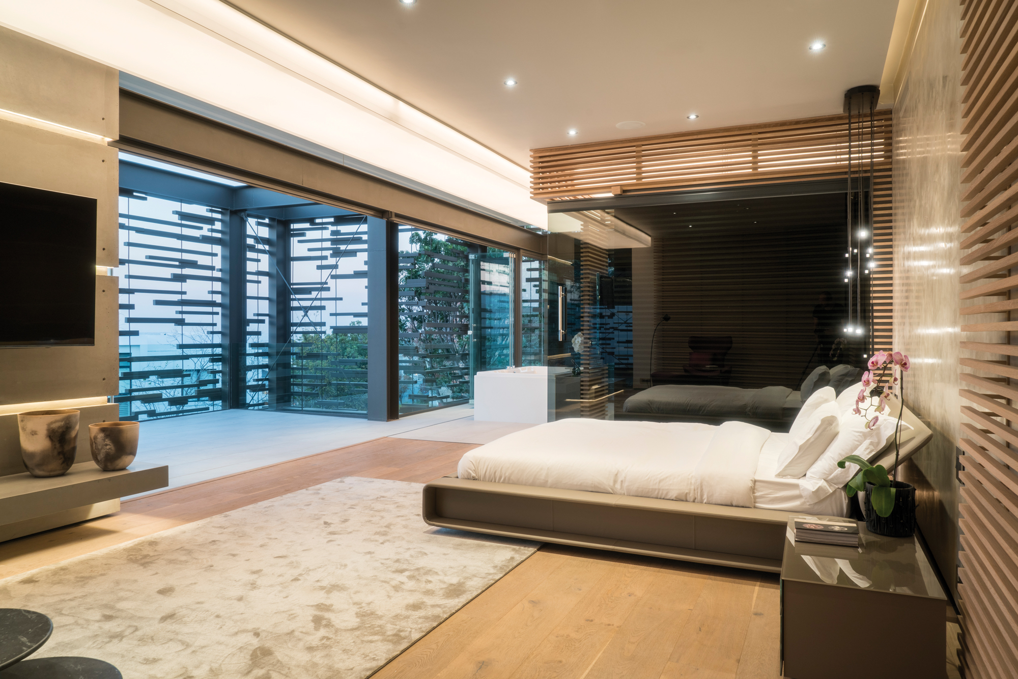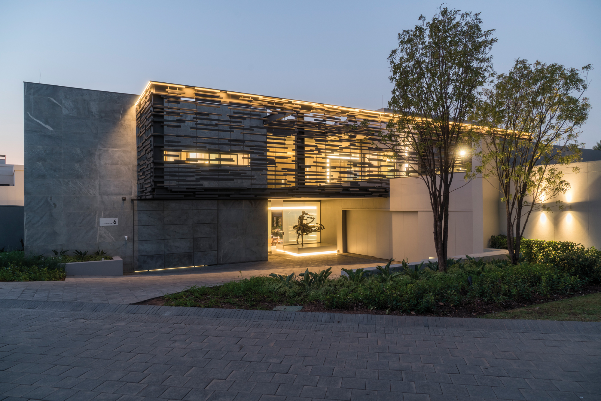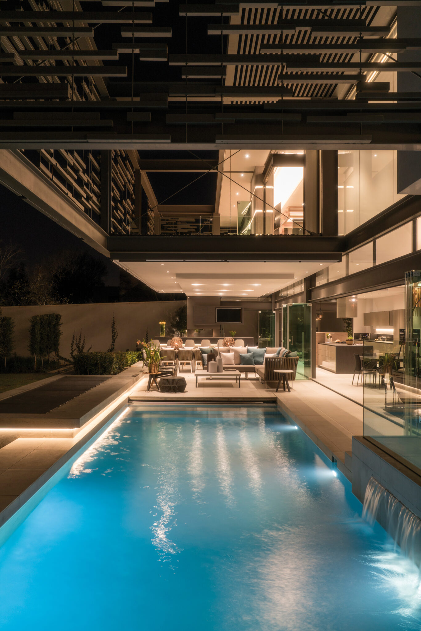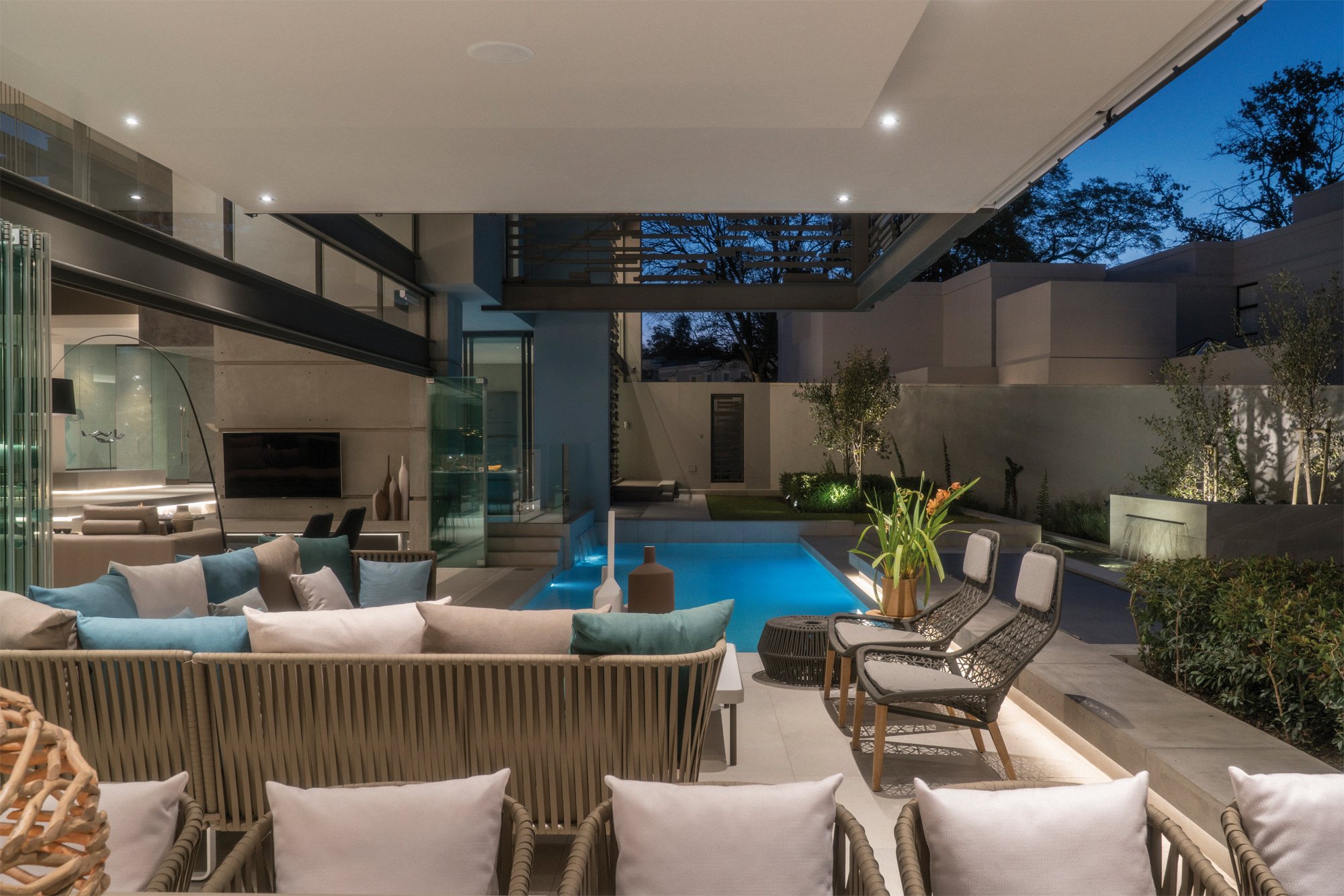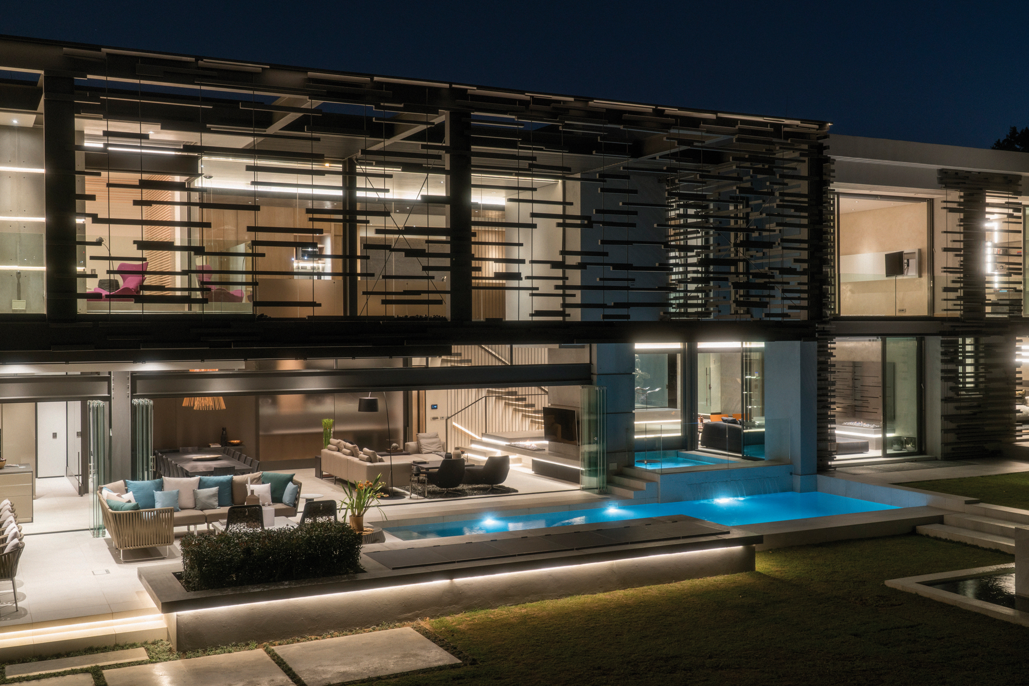 Tout débuta sans doute avec Nico van der Meulen, alors jeune Sud-Africain, dont la ferme parentale lui sert de laboratoire d’apprentissage. Bâtis, ponts et autres structures font alors le bonheur du jeune homme qui paraît faire feu de tout bois. À l’heure des études, il semble peu surpre- nant de voir le jeune Nico prendre la voie du Génie Civil. Douze années plus tard, Nico van der Meulen se fait pourtant rattraper par la passion latente qu’il avait en lui : l’architecture. Et de commencer sa nouvelle vie avec en tête, l’écologie, et en toile de fond, la forte conviction que la fonction doit toujours primer sur l’esthétisme. Depuis, avec une approche toujours plus affinée, Nico van der Meulen poursuit son ouvrage. Lui et son équipe travaillent ainsi sur des projets résidentiels, mais aussi des développements plus vastes comme celui de 4 000 habitations implantées, pour plusieurs d’entre elles, sur des zones environnementales sensibles. Et aujourd’hui encore, fonction et environnement restent les piliers de cette agence multidisciplinaire. Un mantra que l’on retrouve dans l’un de ses derniers projets, la maison One Forrest Road, située à Inanda, près de la ville de Sandton en banlieue de Johannesburg, dont on aperçoit à l’horizon, les contours illuminés. Avec plus de 1 500 m2 de surface, la résidence offre des proportions généreuses qui s’abordent par une large et imposante porte cochère de verre (qui s’obscurcit sur commande) et sa façade de béton qui ne laisse rien entrevoir du monde qui se cache derrière ces murs. C’en est autant pour le travail sur l’intimité. Une fois à l’intérieur, changement d’atmosphère, car c’est la tran- sparence des lieux qui prévaut, et offre des vues sur les étages, le spa, et la piscine postée à l’arrière de la maison, et son jardin attenant. Pour permettre à chacune des pièces d’accorder un peu de vie privée, les architectes ont ici utilisé, comme un moucharabieh, des poutres métalliques de différentes longueurs qui barrent la vue horizontalement et laissent entrevoir le dedans/dehors. Au rez-de-chaussée, le jardin, auquel on accède par les pièces de vie, cuisine et salle à manger, entièrement ouvertes vers le monde extérieur, offre des espaces de farniente, entre barbecue et piscine. Une véranda permet quant à elle de moduler les excès de température. À l’étage, la chambre principale offre pour sa part, un confort maximal là encore voué au contentement absolu des hôtes, comme ce spa soigneu- sement orienté pour attraper les premiers rayons du soleil et la chambre attenante qui dérobe elle aussi le meilleur du soleil d’hiver. Qu’en est-il alors de cette architecture durable si chère à Nico van der Meulen ? Pour cet espace, l’architecte a multiplié les efforts, en forant d’abord dans le sol, à plus de 100 mètres de profondeur, pour y placer neuf sondes répondant à la station géothermale installée en sous-sol et qui régit la maison : sa chaleur, sa fraîcheur, ainsi que son spa et sa piscine. Des panneaux photovoltaïques, placés sur le toit, permettent pour leur part, une production généreuse d’électricité tandis que les eaux des pluies sont récoltées (jusqu’à 20 000 litres) pour servir à l’usage domestique de la maison. Des processus qui font entrer de plain-pied la maison One Forrest Road dans la sphère privilégiée d’une architecture, certes de luxe, mais hautement responsable.