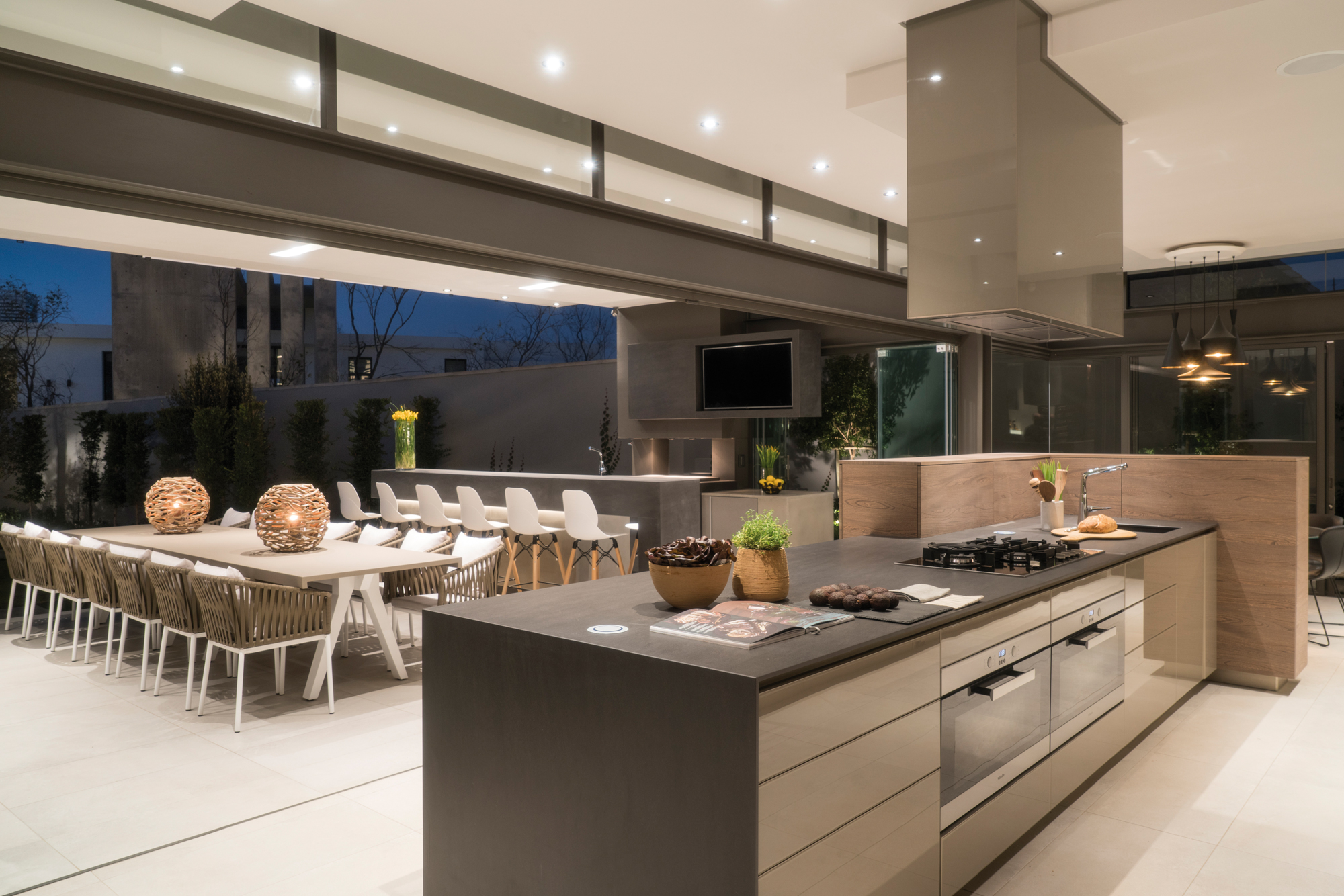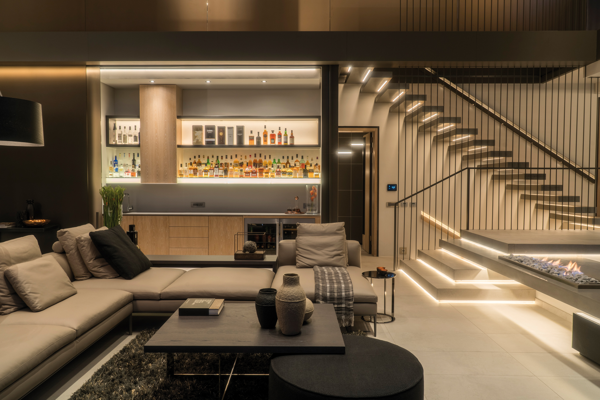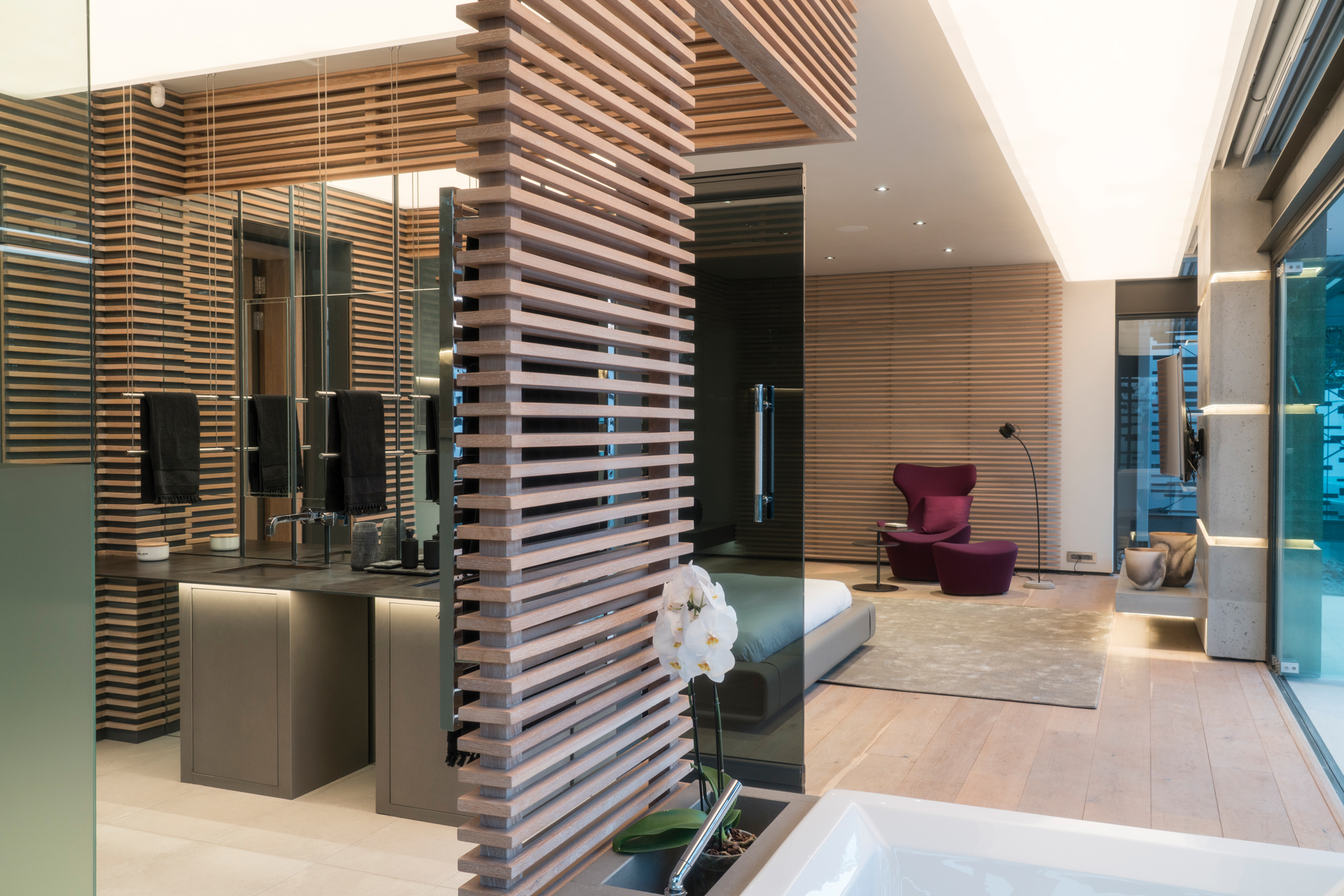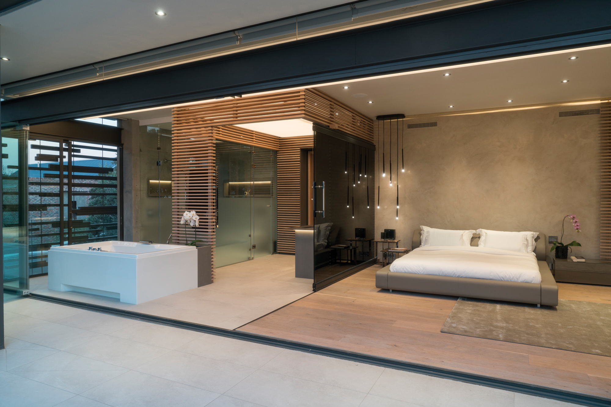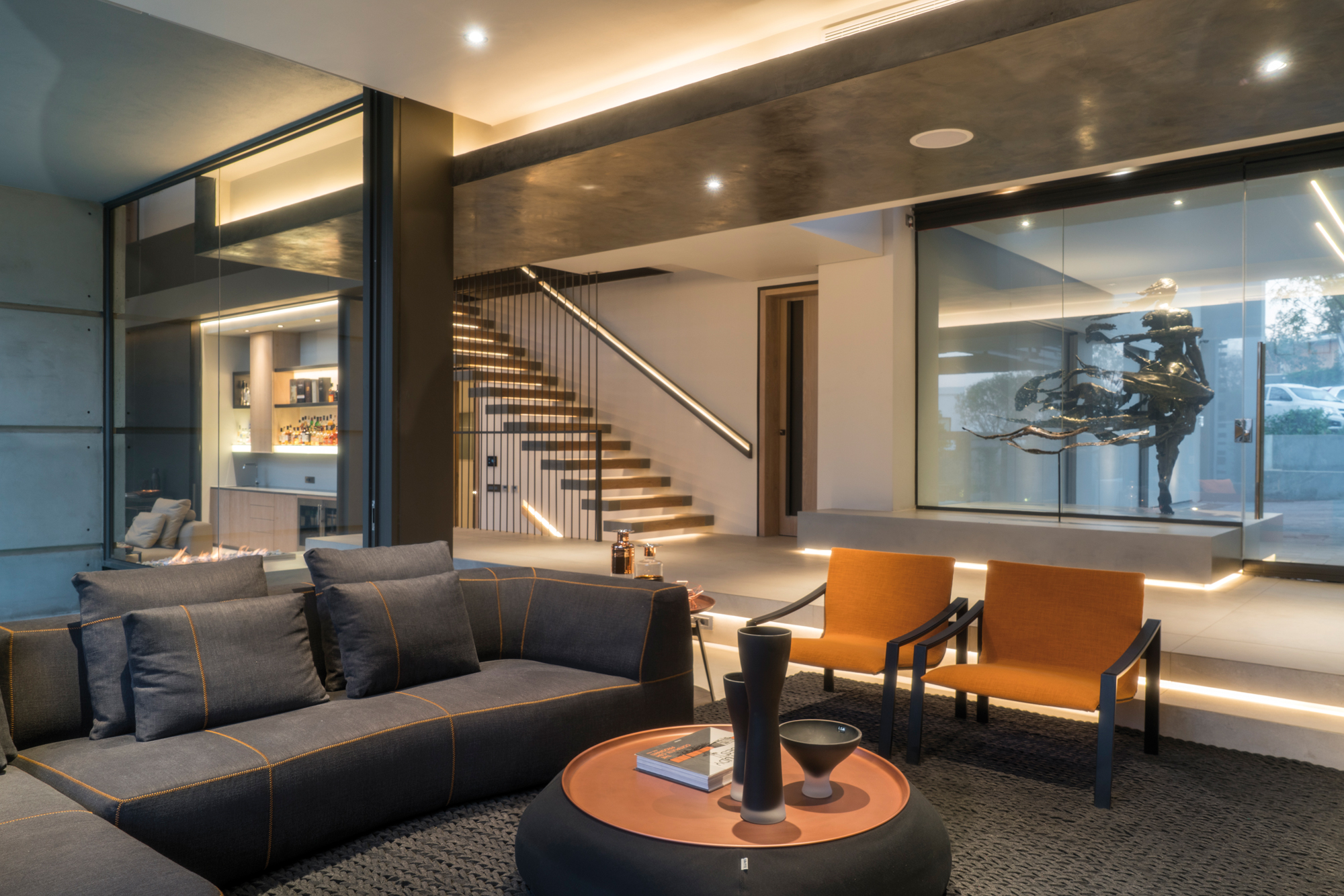 Tout débuta sans doute avec Nico van der Meulen, alors jeune Sud-Africain, dont la ferme parentale lui sert de laboratoire d’apprentissage. Bâtis, ponts et autres structures font alors le bonheur du jeune homme qui paraît faire feu de tout bois. À l’heure des études, il semble peu surpre- nant de voir le jeune Nico prendre la voie du Génie Civil. Douze années plus tard, Nico van der Meulen se fait pourtant rattraper par la passion latente qu’il avait en lui : l’architecture. Et de commencer sa nouvelle vie avec en tête, l’écologie, et en toile de fond, la forte conviction que la fonction doit toujours primer sur l’esthétisme. Depuis, avec une approche toujours plus affinée, Nico van der Meulen poursuit son ouvrage. Lui et son équipe travaillent ainsi sur des projets résidentiels, mais aussi des développements plus vastes comme celui de 4 000 habitations implantées, pour plusieurs d’entre elles, sur des zones environnementales sensibles. Et aujourd’hui encore, fonction et environnement restent les piliers de cette agence multidisciplinaire. Un mantra que l’on retrouve dans l’un de ses derniers projets, la maison One Forrest Road, située à Inanda, près de la ville de Sandton en banlieue de Johannesburg, dont on aperçoit à l’horizon, les contours illuminés. Avec plus de 1 500 m2 de surface, la résidence offre des proportions généreuses qui s’abordent par une large et imposante porte cochère de verre (qui s’obscurcit sur commande) et sa façade de béton qui ne laisse rien entrevoir du monde qui se cache derrière ces murs. C’en est autant pour le travail sur l’intimité. Une fois à l’intérieur, changement d’atmosphère, car c’est la tran- sparence des lieux qui prévaut, et offre des vues sur les étages, le spa, et la piscine postée à l’arrière de la maison, et son jardin attenant. Pour permettre à chacune des pièces d’accorder un peu de vie privée, les architectes ont ici utilisé, comme un moucharabieh, des poutres métalliques de différentes longueurs qui barrent la vue horizontalement et laissent entrevoir le dedans/dehors. Au rez-de-chaussée, le jardin, auquel on accède par les pièces de vie, cuisine et salle à manger, entièrement ouvertes vers le monde extérieur, offre des espaces de farniente, entre barbecue et piscine. Une véranda permet quant à elle de moduler les excès de température. À l’étage, la chambre principale offre pour sa part, un confort maximal là encore voué au contentement absolu des hôtes, comme ce spa soigneu- sement orienté pour attraper les premiers rayons du soleil et la chambre attenante qui dérobe elle aussi le meilleur du soleil d’hiver. Qu’en est-il alors de cette architecture durable si chère à Nico van der Meulen ? Pour cet espace, l’architecte a multiplié les efforts, en forant d’abord dans le sol, à plus de 100 mètres de profondeur, pour y placer neuf sondes répondant à la station géothermale installée en sous-sol et qui régit la maison : sa chaleur, sa fraîcheur, ainsi que son spa et sa piscine. Des panneaux photovoltaïques, placés sur le toit, permettent pour leur part, une production généreuse d’électricité tandis que les eaux des pluies sont récoltées (jusqu’à 20 000 litres) pour servir à l’usage domestique de la maison. Des processus qui font entrer de plain-pied la maison One Forrest Road dans la sphère privilégiée d’une architecture, certes de luxe, mais hautement responsable.