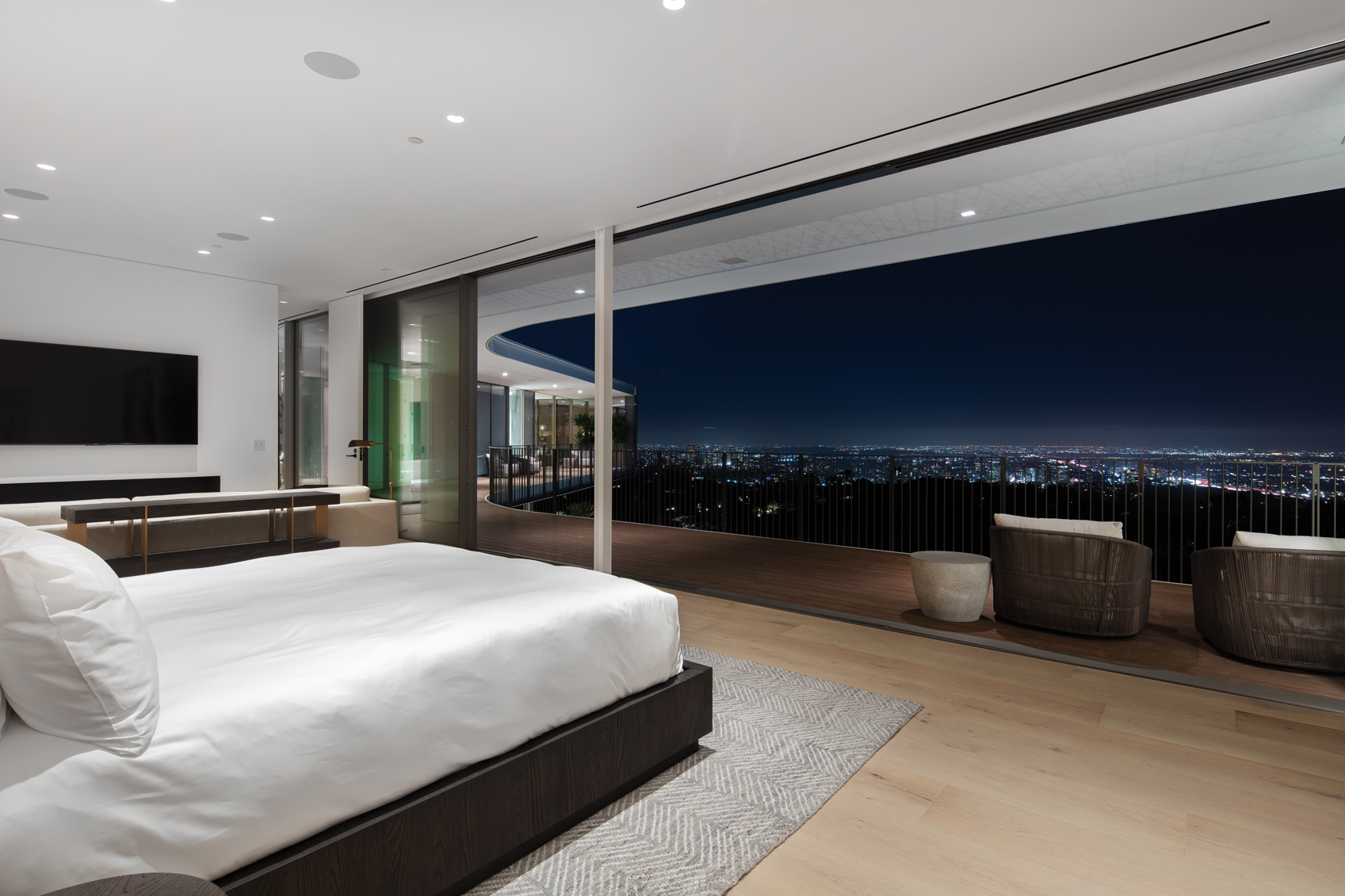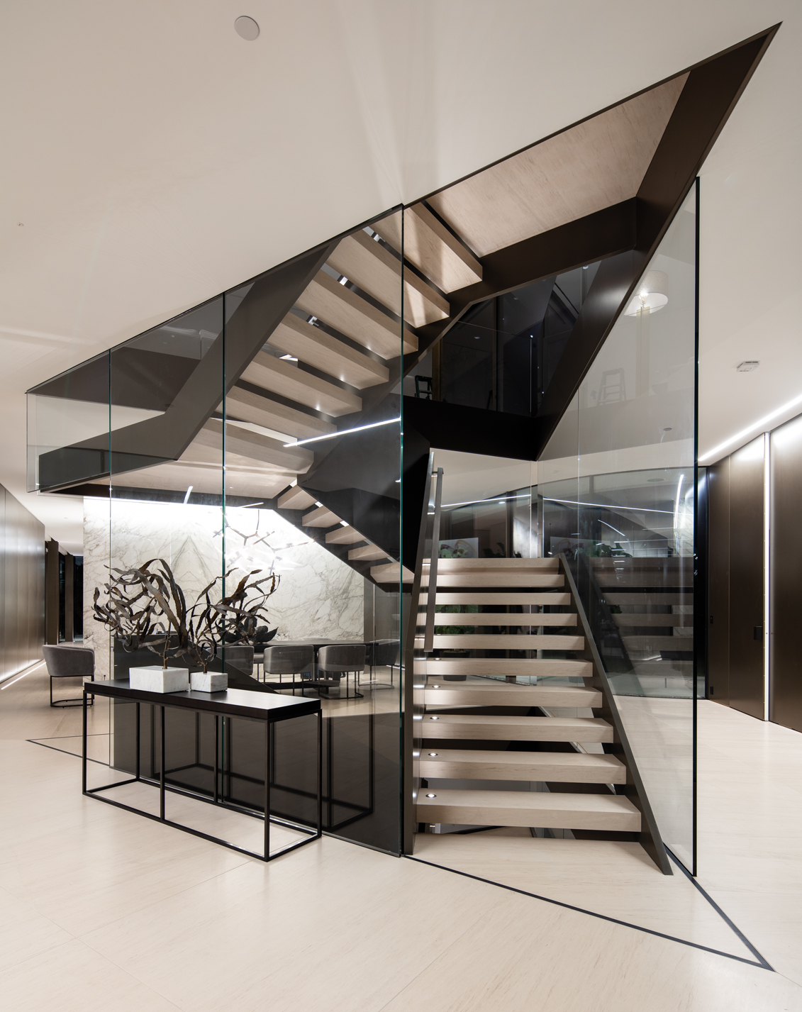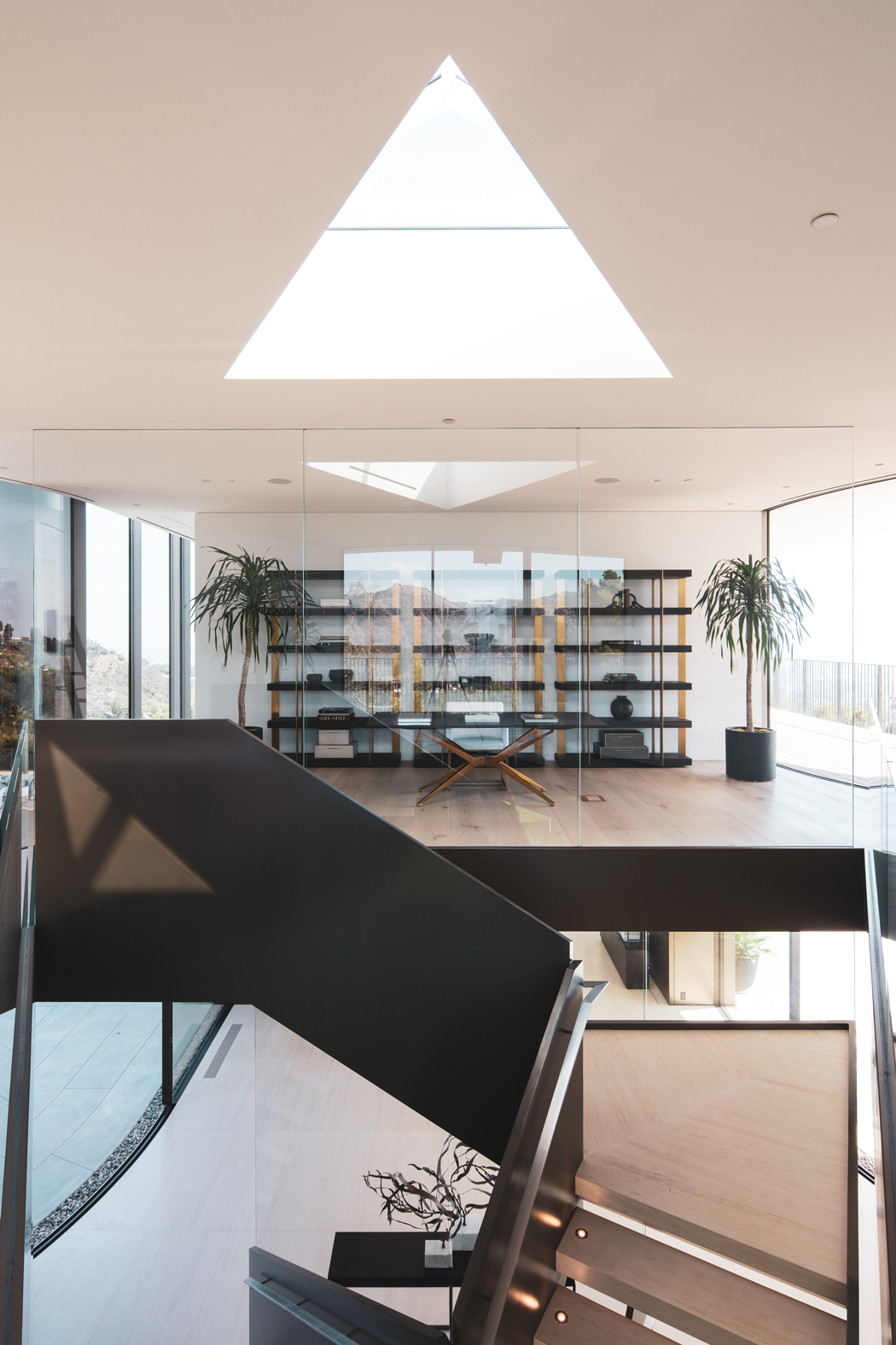 Réalisations de bâtiments commerciaux, culturels, publics, architecture résidentielle, etc., l’agence SPF:a, fondée par Zoltan E. Pali et Judit M. Fekete-Pali et basée à Los Angeles, imagine de nombreux projets d’envergure sur le continent américain principalement, à l’image de The Line Lofts au cœur de la Cité des anges, un récent programme résidentiel qui a été particulièrement remarqué. Grâce à l’architecture du bâtiment en premier lieu, et au design intérieur ultra créatif pensé par Gulla Jónsidóttir (voir Artravel n° 86). Orum Residence, sur les hauteurs d’une colline du quartier chic de Bel Air, s’impose comme un projet XXL avec ses 1 750 m2 habitables, répartis dans un bâtiment en forme d’hélice à trois ailes ! Cette originalité n’a pas été voulue uniquement pour marquer la différence. Les architectes ont longuement réfléchi au positionnement du bâti sur son terrain dominant. Optimiser les panoramas inouïs sur Los Angeles et les orientations, intégrer parfaitement la résidence dans son environnement constituaient les autres défis à relever. L’architecture de la demeure n’est pas la seule singularité de ce projet hors du commun. Chaque aile, reliée en son centre par une cage d’escalier impressionnante entourée de verre, se pare de façades en verre, conçues selon un système sophistiqué, développé en partie avec la société suisse Sky-Frame. Les parois de verre sont constituées de panneaux de cinq largeurs différentes, avec quatre types de finitions (réfléchissant, translucide, opaque et clair), engendrant un effet visuel changeant assez spectaculaire ! Orum se déploie sur trois niveaux aux intérieurs résolument contemporains, sublimés par des matériaux nobles, et très ouverts sur l’extérieur grâce à la présence de baies vitrées encastrées dans le sol et le plafond. Le rez-de-chaussée abrite l’entrée, les zones communes et les espaces de réception ; le premier étage, lui, enferme les espaces privés de la maison, avec, entre autres, de vastes suites. Le troisième étage, sous les deux autres, a été creusé dans la colline et compte des espaces à l’atmosphère intime, ainsi que des pièces dédiées aux loisirs et au bien-être : spa, sauna en cèdre, salle de sport, salle de cinéma, cave à vins, etc.