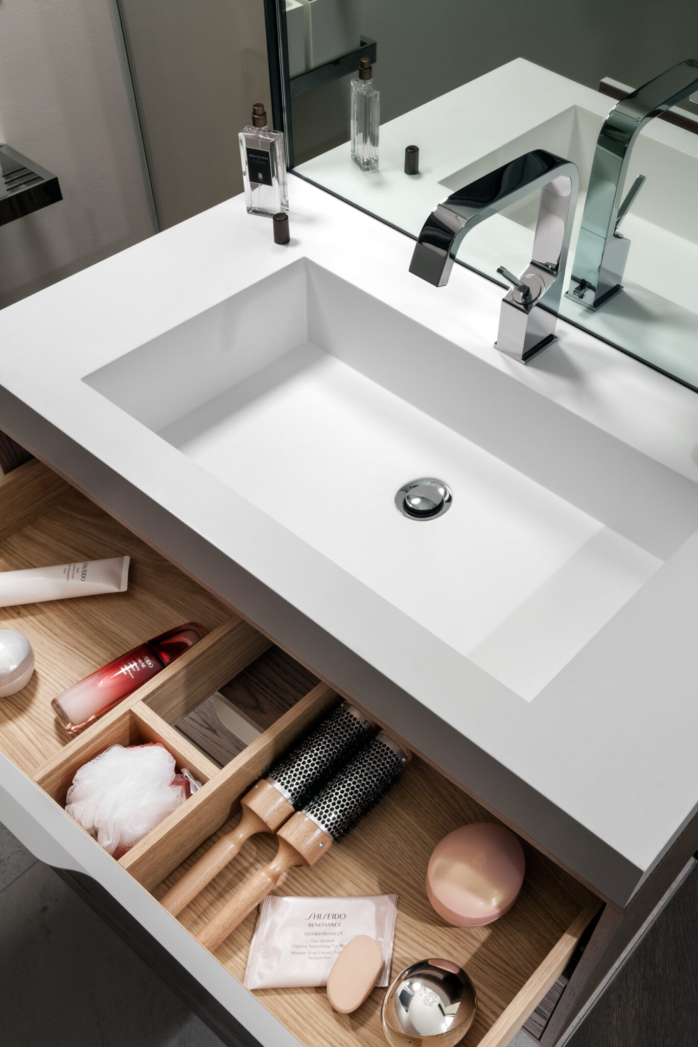 Les deux étages sont reliés par les escaliers Fontanot, un modèle LaFont Fascia: une structure en fer, une finition en gypse teinté blanc comme les murs et une balustrade en verre flotté laminé. De plus, la collection Slide Natural Genius, développée avec Daniele Lago et une partie du projet Natural Genius de Listone Giordano, s’intègre parfaitement dans le design.