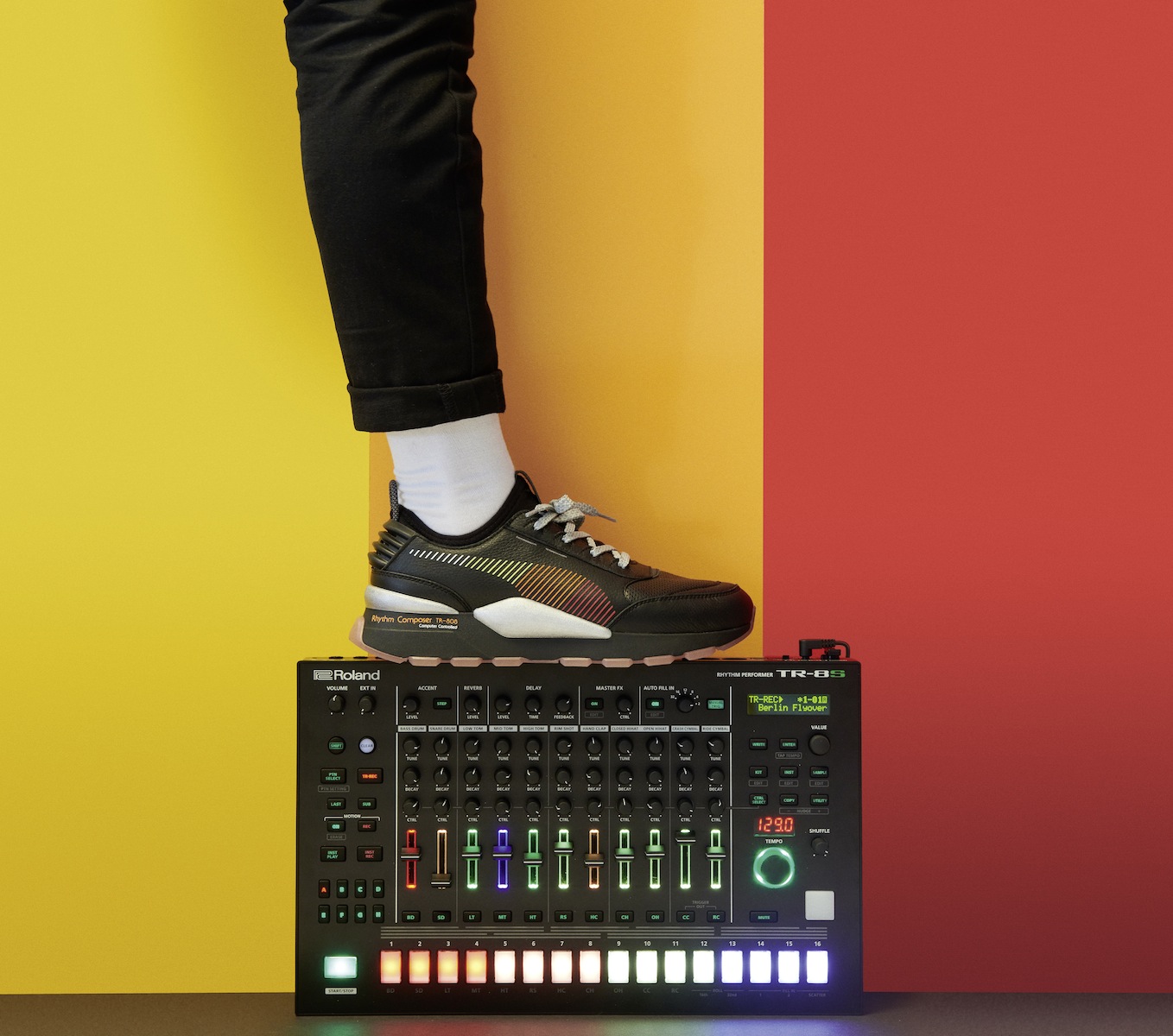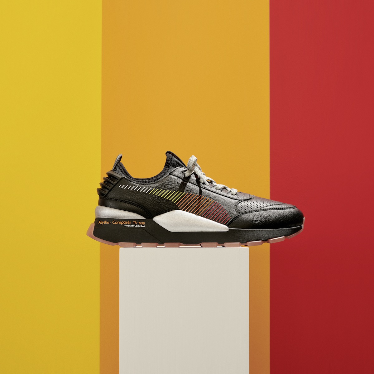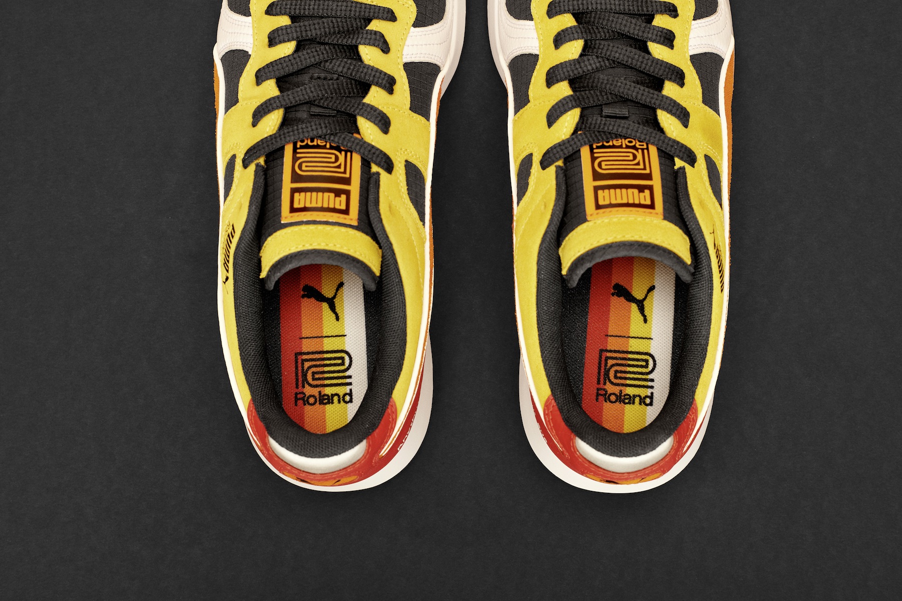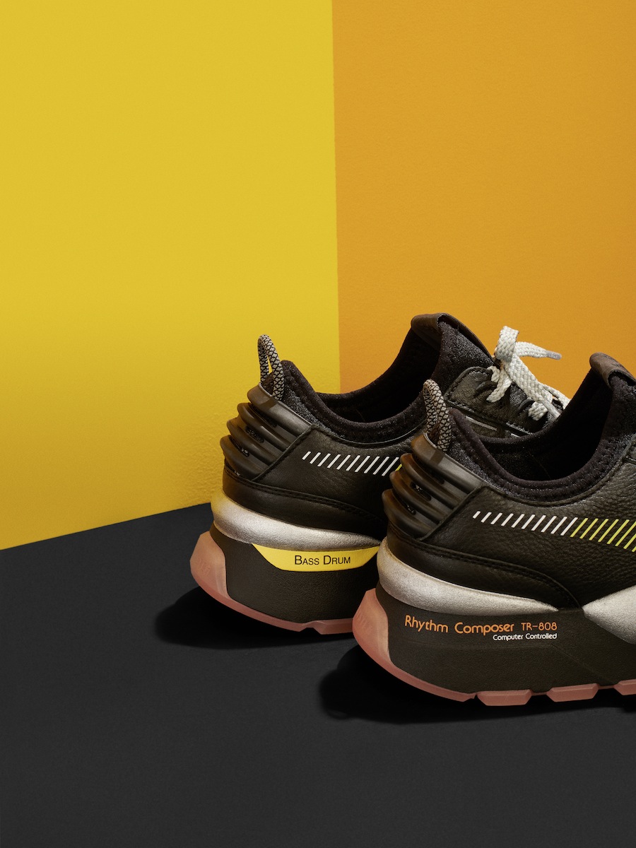 La tige en daim de la RS-100 Roland se pare d’une Formstrip orange vif avec bords réfléchissants et d’une combinaison de cuir blanc et rouge, de panneaux en tissu rispstop noir et de daim jaune. Le marquage PUMA et Roland apparaît sur la languette, la semelle et l’étiquette en métal anodisé. « Rhythm Composer TR-808, Computer Composer » est imprimé sur le talon. Les logos PUMA et Roland sont imprimés sur la semelle de propreté tandis que la semelle d’usure se pare de lignes qui imitent les éclairages d’un synthétiseur. Tous les coloris et détails sont dans le style rétro des années 1980 emblématique de la boîte à rythmes Roland TR-808.