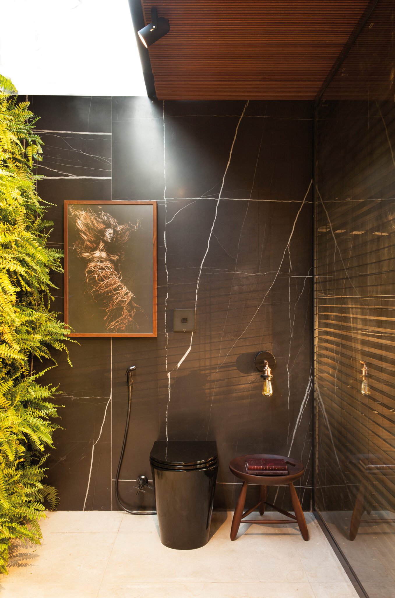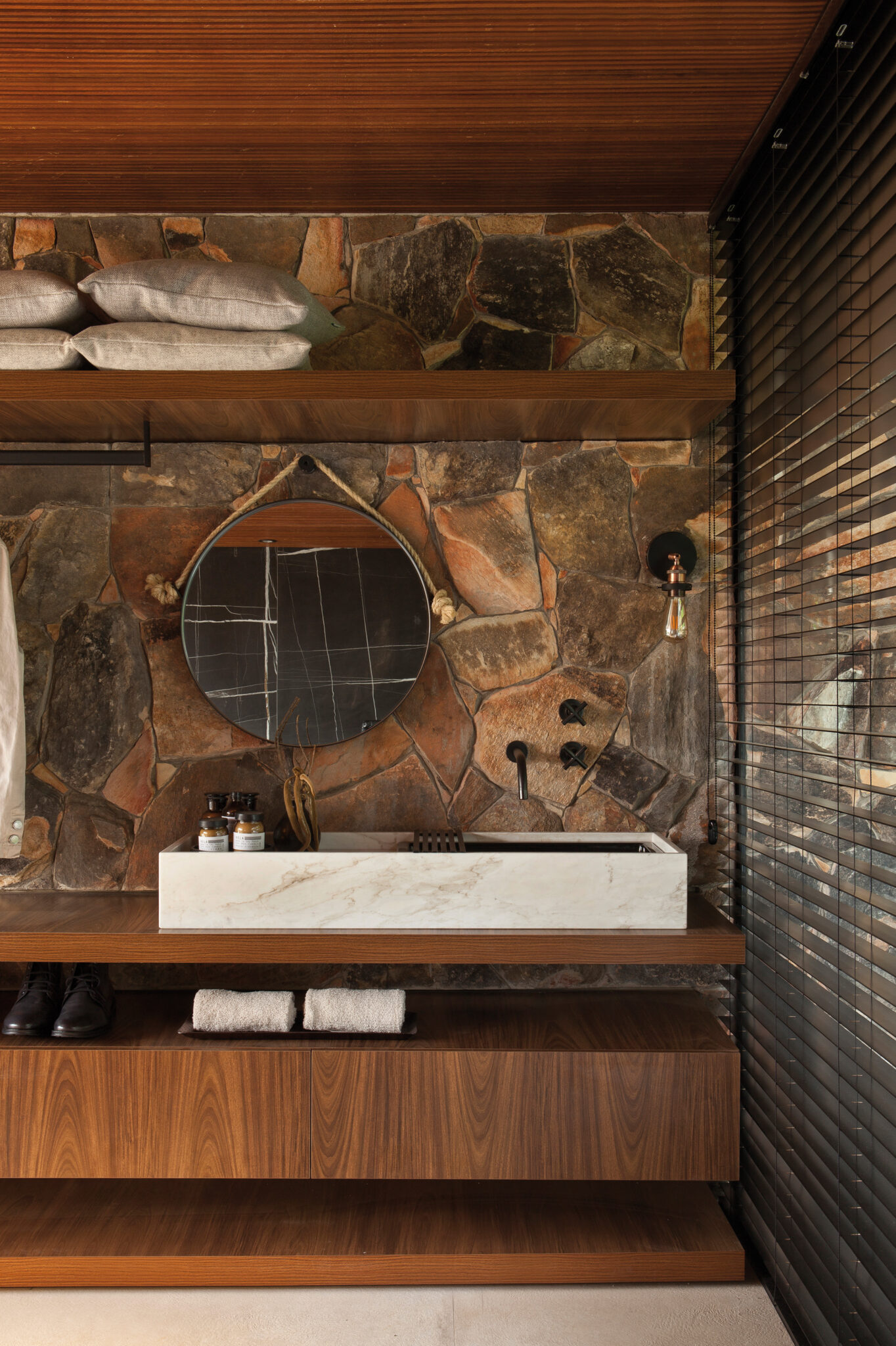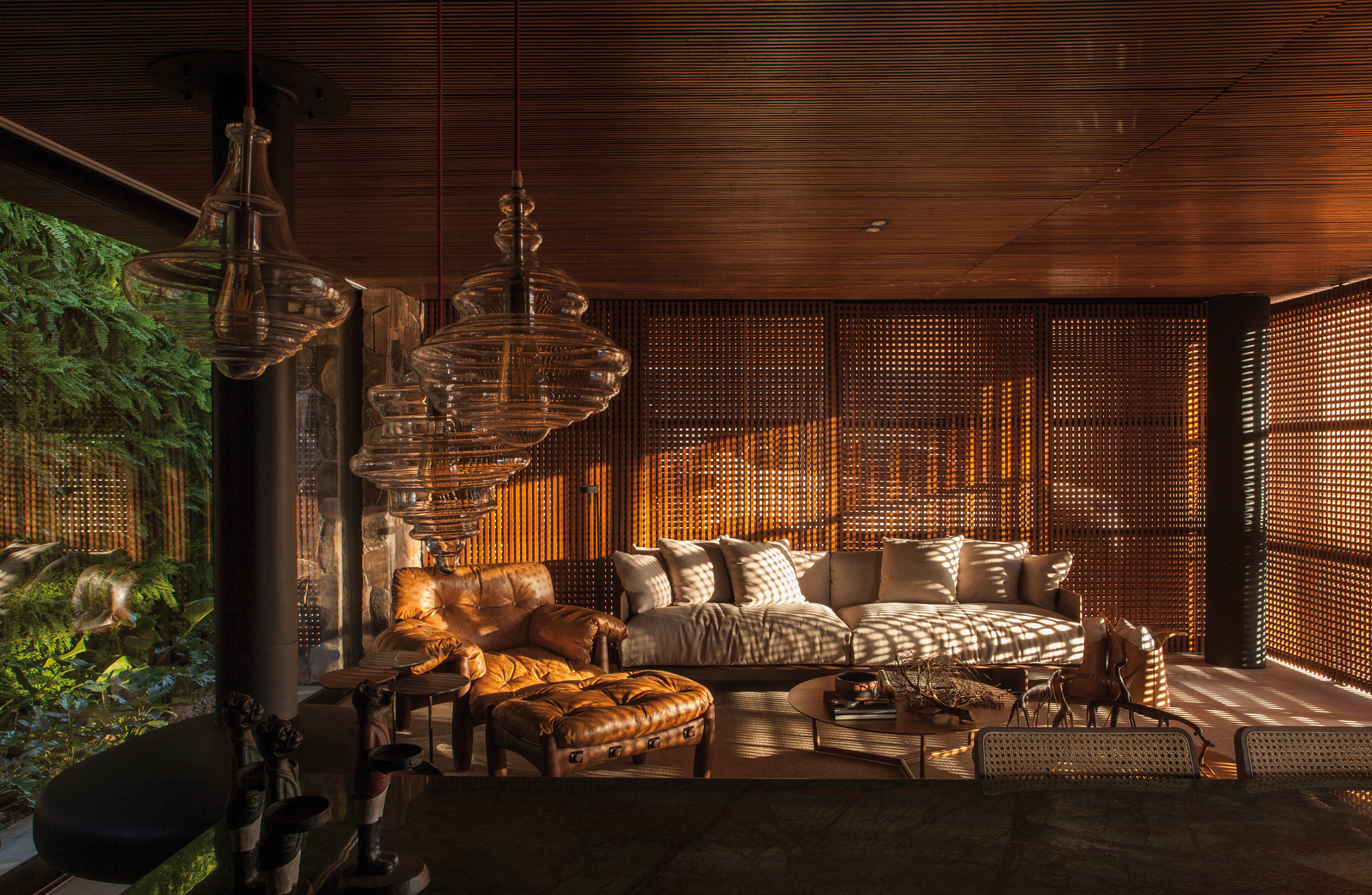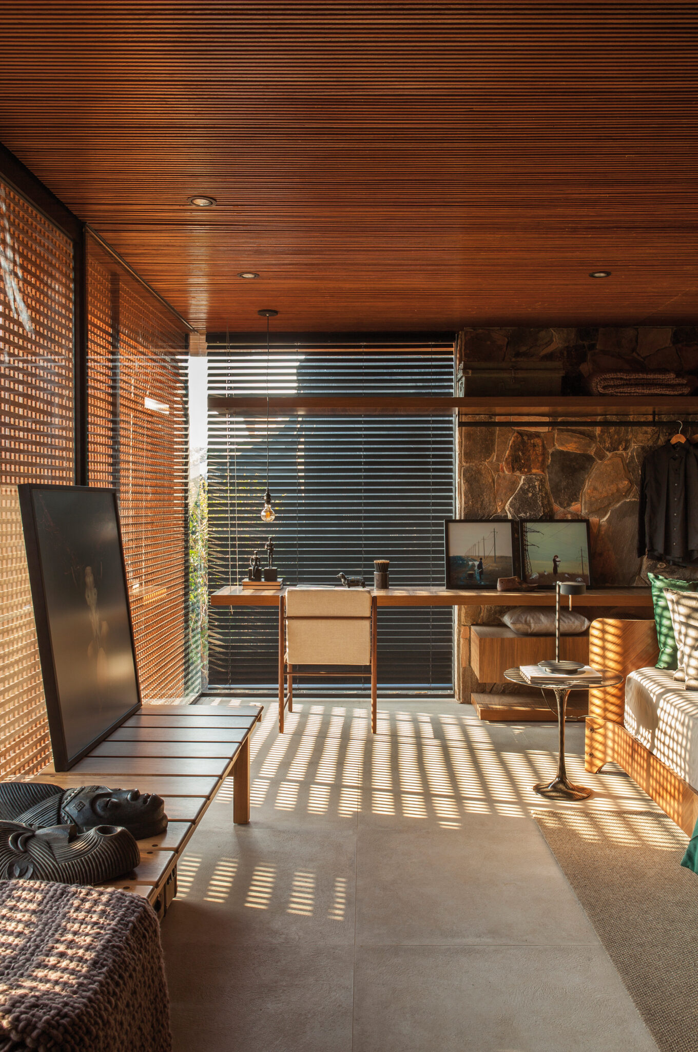 L’excellence est ici traduite par une véritable pureté des formes mais aussi une relation complète au monde qui l’entoure. Maisonnette de plain-pied, le refuge est ainsi consciemment bardé de verre et d’un bois ajouré (à la façon d’un moucharabieh !), qui, alternés, offrent le sentiment tangible du confort cosy d’un intérieur et celui de l’inhérence concrète de l’univers naturel environnant. Bois, verre mais aussi marbre noir sont autant d’éléments organiques qui s’invitent jusque dans l’intérieur de la maison. Refuge de nature. Nature de refuge. Reste aux architectes d’habiller l’ensemble. Là encore, la simplicité efficace et naturelle d’un mobilier de bois, posé sur un sol de béton et de pierre, parachève l’effort de cohérence, mais aussi de transparence d’un lieu qui se veut accessible. Spontanément. Et sans compromis. De même pour le design. Cette habitation presque fortuite, où règne un équilibre visuel et palpable, comprend les principes d’une vie faite d’un hédonisme élégant mais sans aucun doute frugal. Une frugalité qui ne peut néanmoins échapper à la loi de la nature et donc à celle de l’art. Celui-ci que l’on retrouve entre objets artéfacts tribaux et représentations photographiques d’une nature humaine diaboliquement mise en scène.