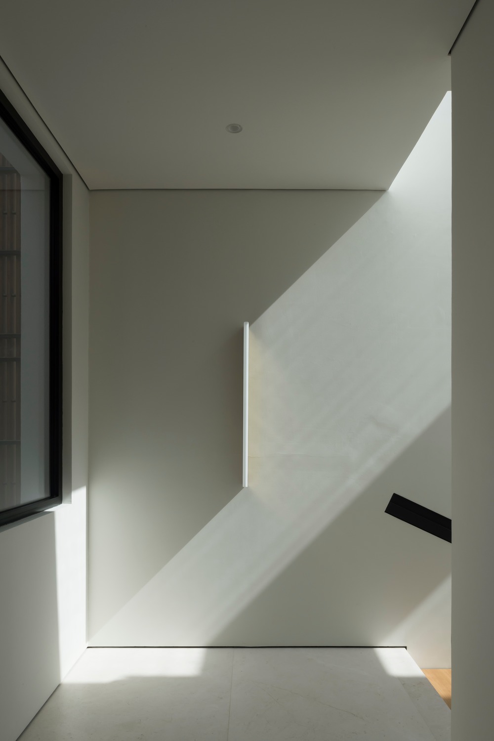 VSHD Design a imaginé une maison en forme de L qui regarde à l’intérieur du terrain où la famille peut profiter de la piscine et du jardin luxuriant tout en préservant leur intimité. L’expérience d’entrée débute au niveau du mur frontière, en tirant le meilleur parti de la taille de la parcelle. Un surplomb en bois a été utilisé pour compléter la géométrie du «L» et pour donner une certaine intimité au couloir interne du côté de la rue.