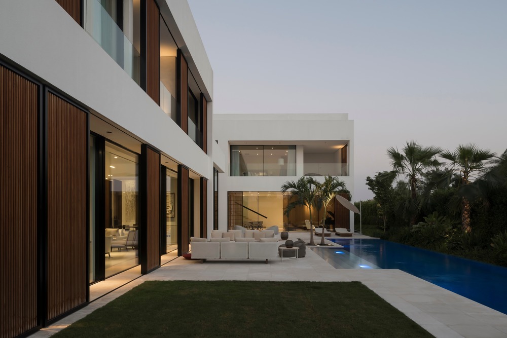 Le contour intérieur en L est transparent avec de grandes portées de portes coulissantes en verre. Les grands panneaux de verre ont un profil linéaire mince créant une frontière homogène entre l’extérieur et l’intérieur. Cela ouvre la maison à une vue sur la piscine et le jardin et crée un lien visuel entre tous les espaces de vie.