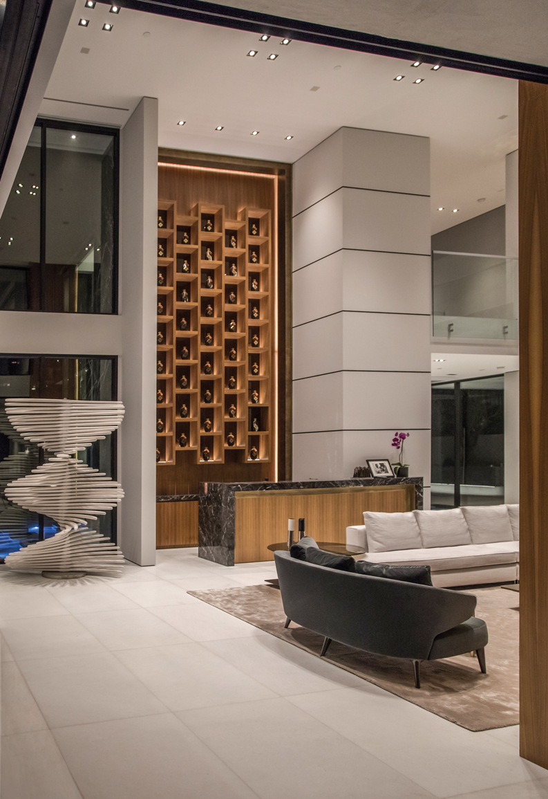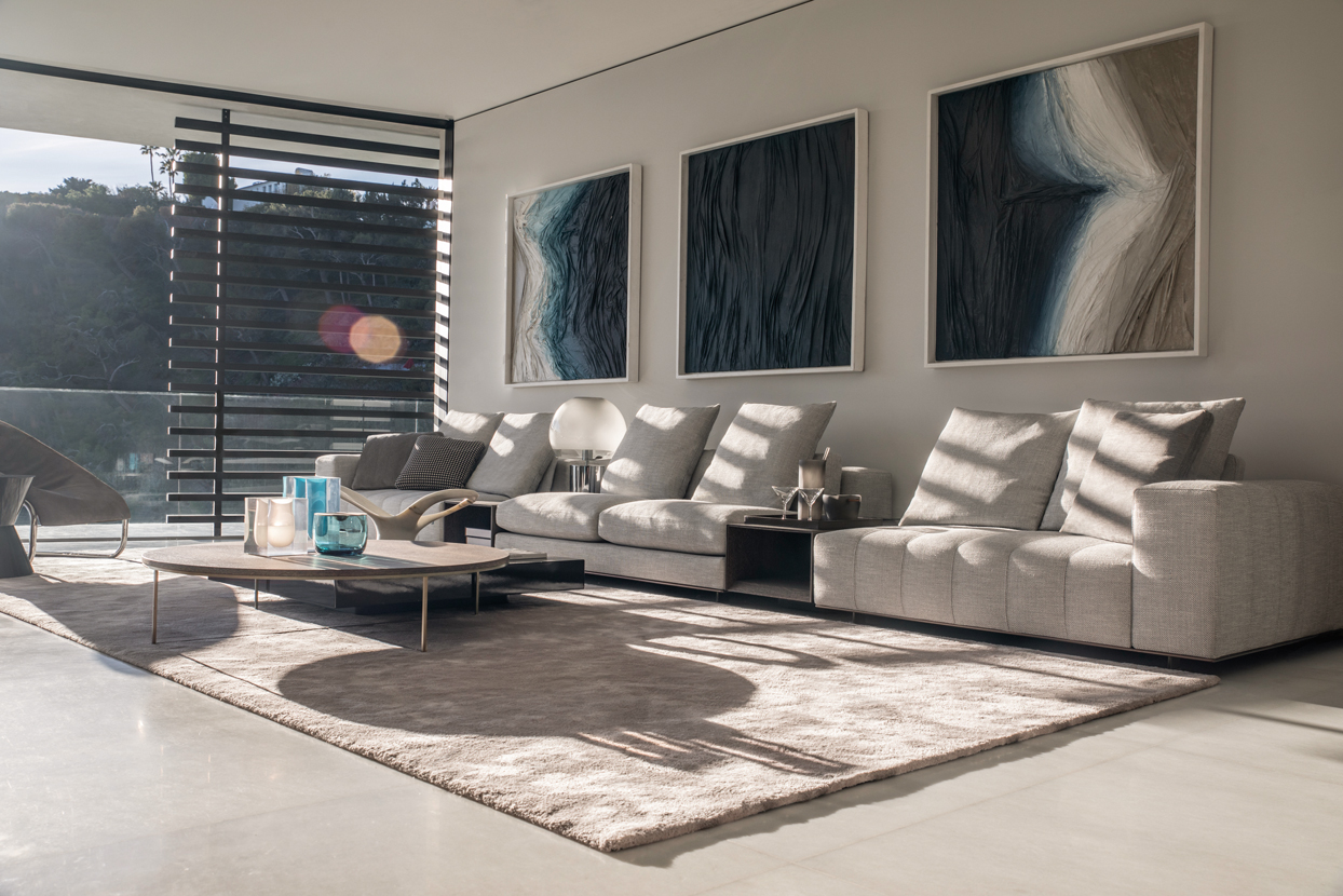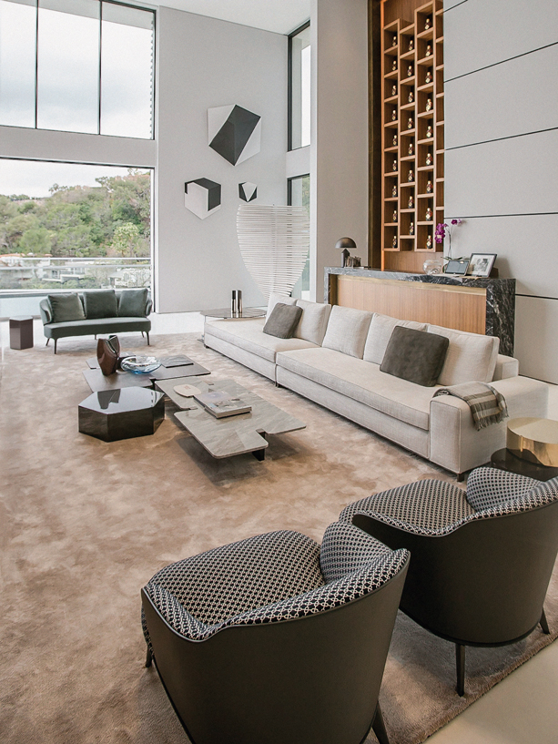 Basée à Los Angeles, l’agence d’architecture et de design Bowery Design Group imagine des architectures de résidences contemporaines, somptueuses et luxueuses dans la cité des Anges et particulièrement à Beverly Hills, Bel Air et Malibu, ainsi qu’ailleurs aux Etats-Unis mais aussi à l’étranger. Pour ce projet grandiose s’étalant sur environ 1 150 m2, l’agence californienne a collaboré avec le prestigieux éditeur de mobilier italien Minotti, et particulièrement avec son l’équipe du showroom de L.A, installé au cœur de West Hollywood Design District. Réalisée en 2017, la résidence occupe une place privilégiée dans le quartier résidentiel exclusif de Doheny Estates, et jouit d’un panorama époustouflant sur la ville et ses lumières. Pour profiter au maximum de cette vue, Bowery Design Group a pensé une maison sur plusieurs niveaux, délicieusement tournée vers l’extérieur, avec des espaces presque sans frontière entre le dedans et le dehors. Aussi, la demeure, à la décoration épurée et aux détails minutieux, bénéficie, partout, d’immenses parois vitrées permettant d’inonder généreusement chaque pièce de lumière naturelle. Chaque volume architectural, d’une belle hauteur sous plafond, a été dessiné avec soin. Les parois se parent de tonalités douces, du beige principalement ; des boiseries subliment certains murs, tandis que quelques beaux matériaux participent à la splendeur du lieu… Tout comme le choix du luxueux mobilier Minotti, aux matières, finitions et design incomparables. Dans le salon principal, impressionnant avec ses baies vitrées du sol au plafond, le canapé Williams, très confortable, voisine avec les fauteuils Leslie aux formes enveloppantes et la table Benson associant les matériaux nobles, le tout designé par Rodolfo Dordoni pour Minotti. Ce dernier, pour le même éditeur, a également conçu nombre de pièces dans la résidence, comme les assises Andersen, la petite table iconique Cesar, la bergère Jensen, les tabourets hauts Aston dans le coin bar, le système de sièges Freeman ou encore les petites tables des collections Calder Bronze et Ritter. Le fauteuil Cortina de Gordon Guillaumier pour Minotti, dans l’un des salons, apporte également du caractère au décor. Une sélection qui parfait merveilleusement l’endroit aussi chaleureux, contemporain que spectaculaire !
