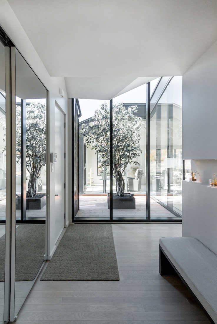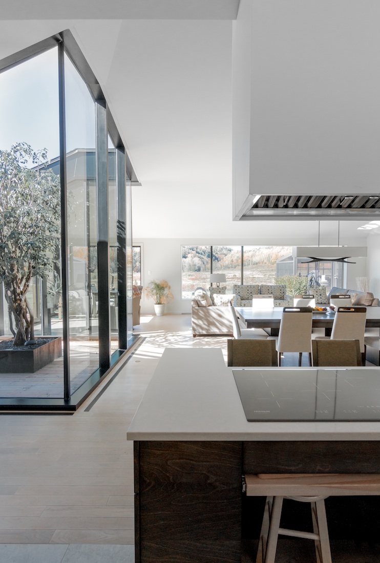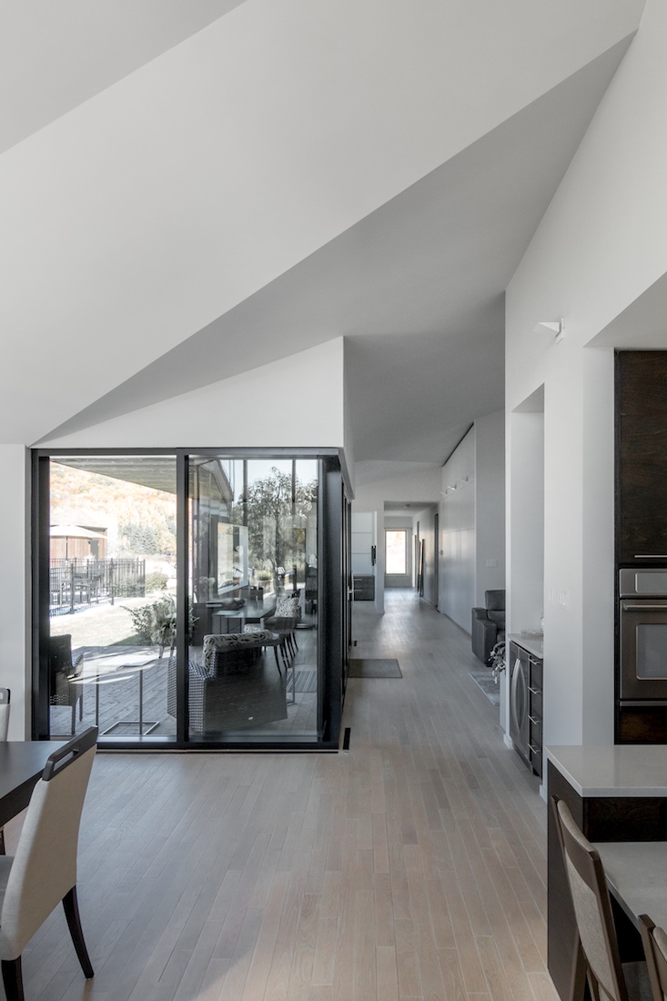 L’horizontalité perçue de la maison est créée par l’ampleur du lieu ; six chambres, deux salles familiales, quatre salles de bain et trois espaces de garage – qui est principalement distribué au rez-de-chaussée. La toiture aux plans inclinés et aux angles irréguliers établit un dialogue avec les collines ondulantes du paysage environnant. Outre les multiples études de toiture développées pour le projet, la maison s’ancre sur le site à travers différentes terrasses qui se projettent directement dans la vallée. La principale terrasse aspire le paysage au cœur de la maison pour offrir un jardin intime aux propriétaires.