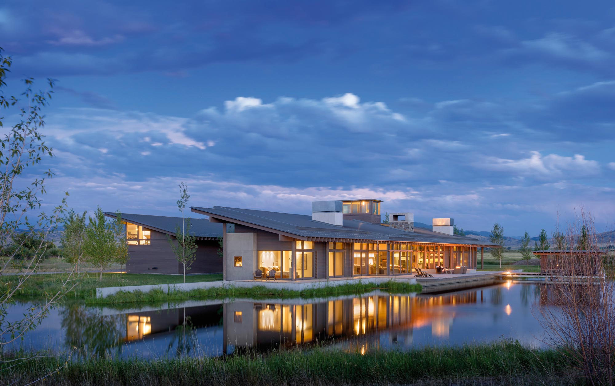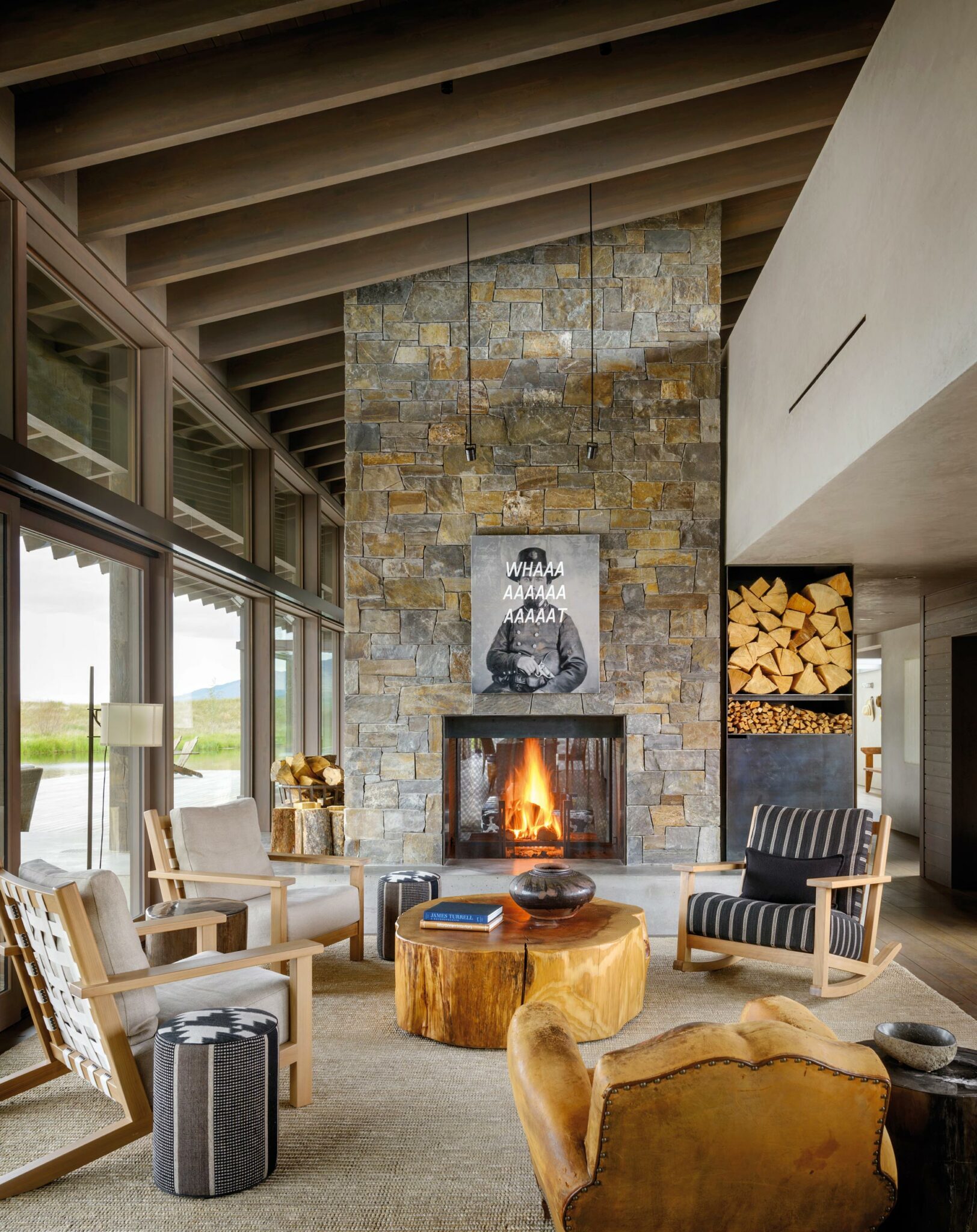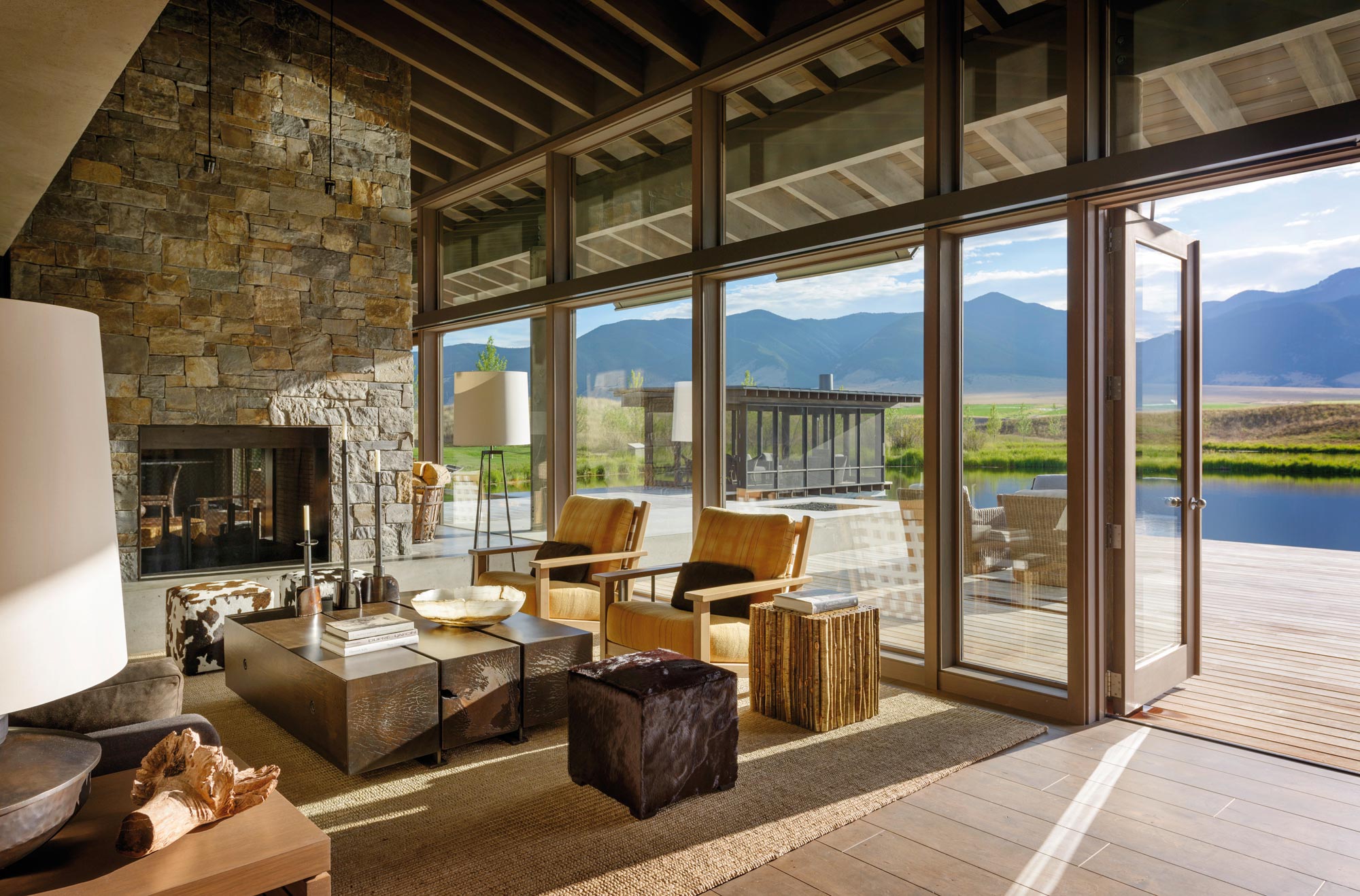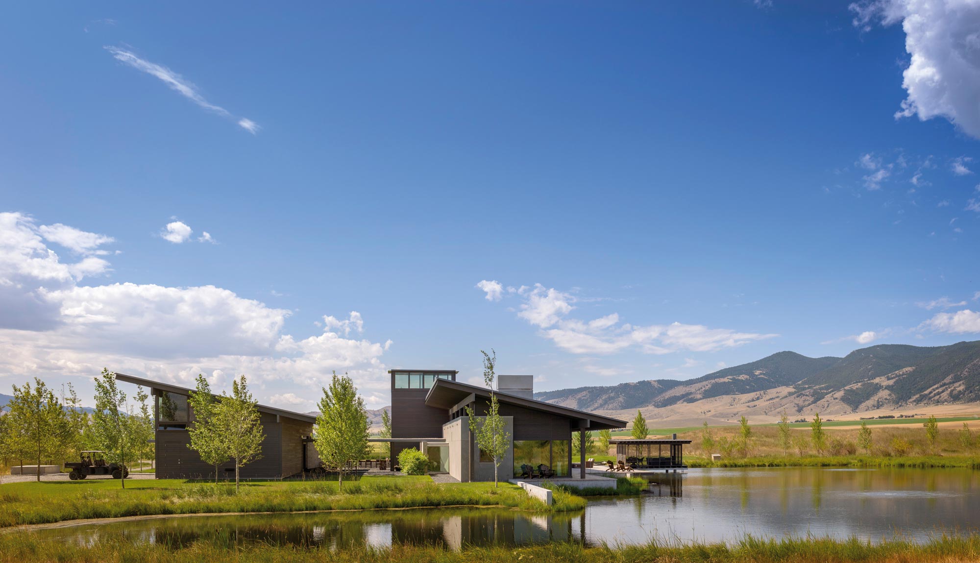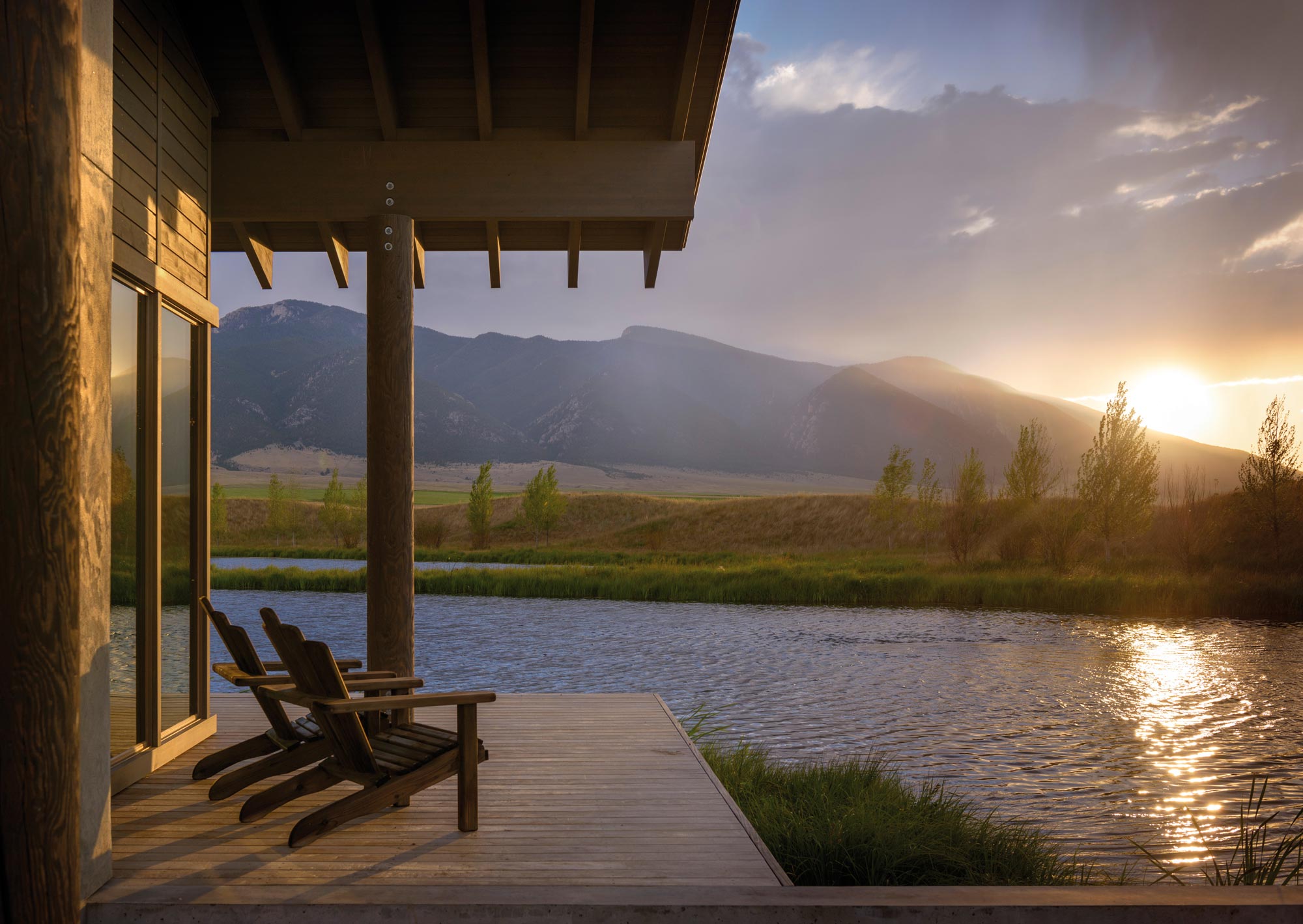 Bois bruts aux coupes franches, peaux de bêtes, pierres locales qui parent certains murs, et quelques pièces de mobilier chinées ici et là, agrémentent l’ameublement plus contemporain dessiné tout spécialement pour la résidence (comme l’îlot de cuisine par Montana Tile & Stone) ou commandé auprès de marques de renommée internationale, comme le banc de l’entrée par Peter Glassford pour Bespoke Global, les fauteuils du salon de Terris Draheim, un huile par Shawn Huckins ou une lampe sur pied signée Christian Liaigre. Agrémentée de deux chambres, d’un atelier d’artiste, d’une salle de gym et d’une salle de jeux, la résidence contient aussi un espace entièrement consacré à la vie en extérieur : la terrasse de bois jouxte ainsi les deux mares spécialement conçues pour une pêche à la truite que l’on pourrait faire là quotidiennement, installé dans un fauteuil Adirondack signé Tom the Irishman, face à cette chaîne de montagnes qui embrasse le paysage de ces cimes au loin… Paisiblement