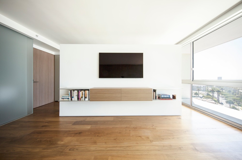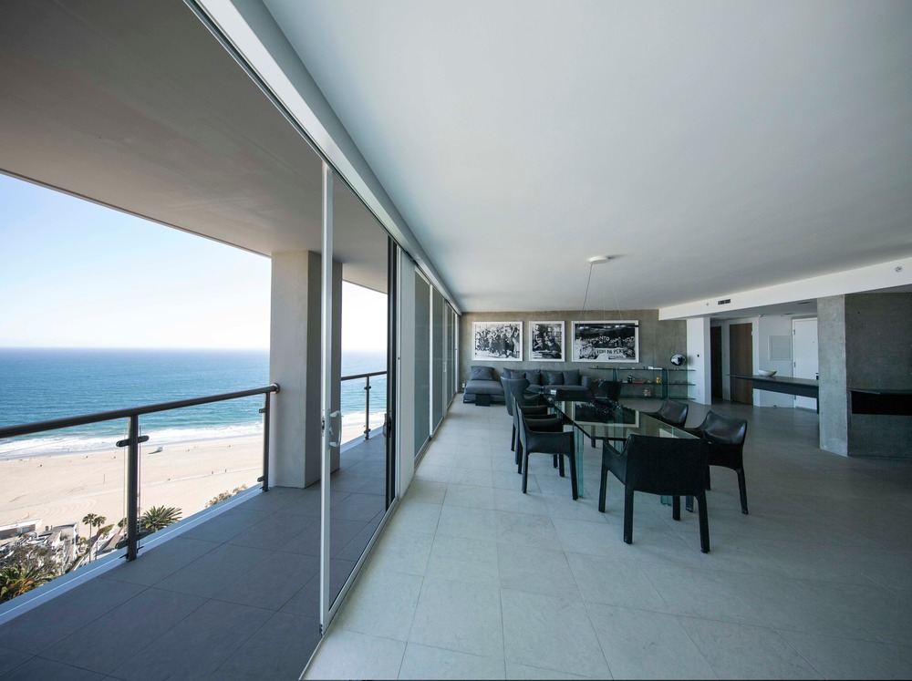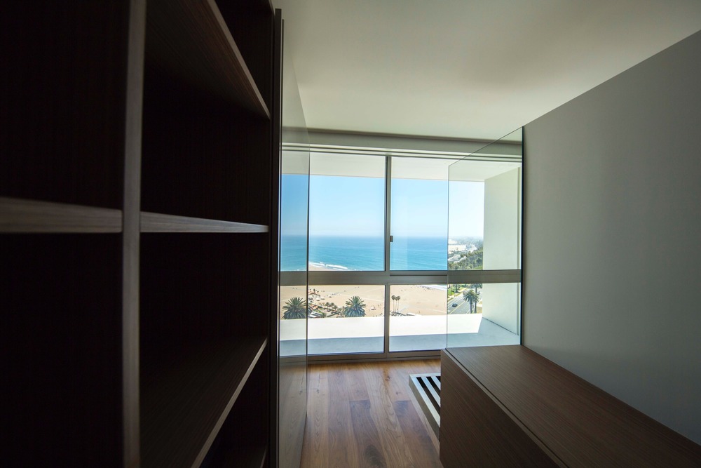 Ce condominium situé au 17e étage dévoile de spectaculaires vues de la ville aux plages de Santa Monica, de l’océan pacifique jusqu’à Malibu. Le client a ainsi acquis deux appartements adjacents dans l’intention de les réunir. L’unité centrale consiste donc en un grand appartement de deux chambres adjointes d’un studio additionnel.