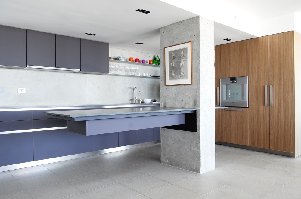 Cela a permis d’élargir sensiblement la salle de bains dont le mur de verre sablé coulissant ferme ou ouvre l’espace sur la chambre. La cuisine elle aussi a été déplacée et élargie. Le plan de sol fut optimisé pour offrir de splendides vues vers l’extérieur à tous endroits, même depuis la chambre et le dressing. Les murs cimentés existants ont été déshabillés de leurs cloisons plâtrées pour imprimer à l’appartement un caractère et une atmosphère uniques.
