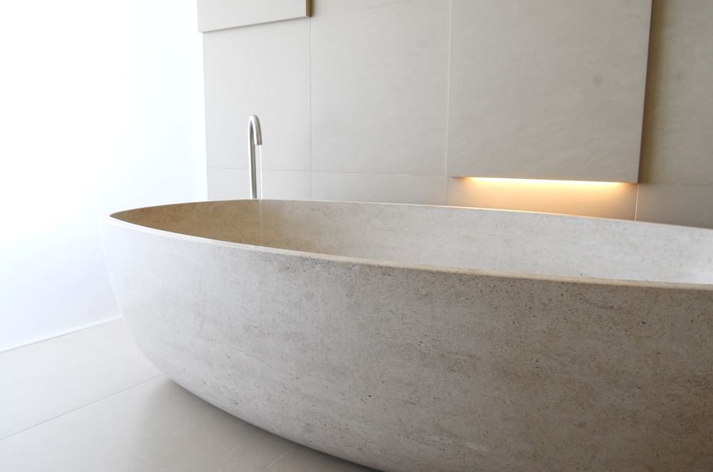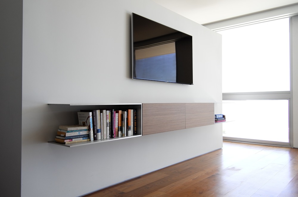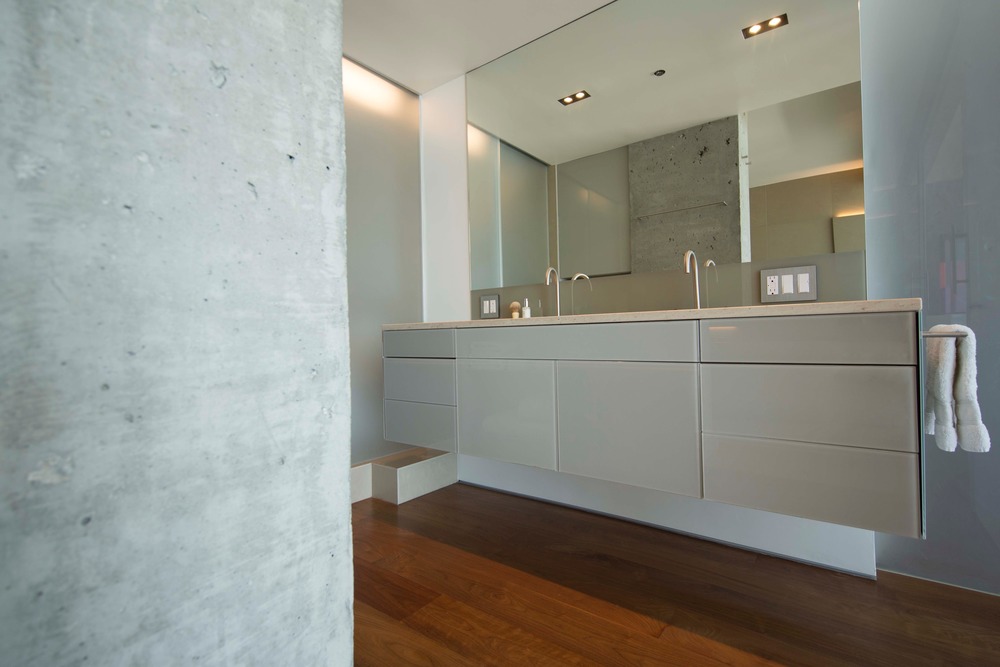 Le projet inclut différents éléments encastrables sur mesure tels que penderie, vanités de salle de bains, cuisine, baignoire et éviers. La baignoire minérale fut taillée dans une unique pierre au Portugal. Un nouveau sol de noyer ainsi que des adjonctions de bois naturel sur les portes et certaines armoires de cuisine apportent de la chaleur à l’ensemble. La cuisine est signée Boffi, mais les fines étagères d’aluminium et les supports en porte-à-faux du comptoir ont été réalisées sur mesure, achevant ainsi une cuisine totalement unique et singulière.