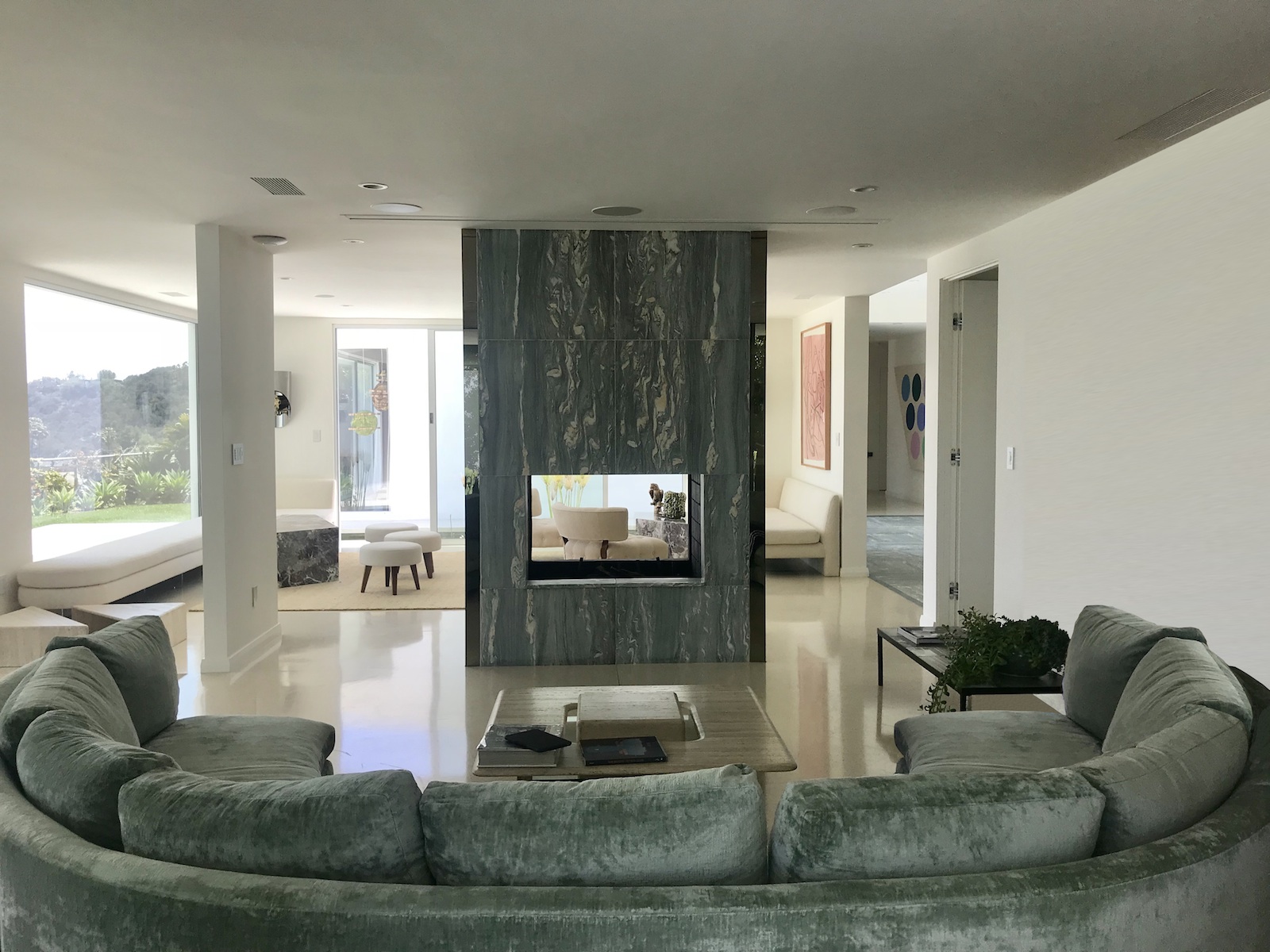 L’immeuble utilise des matériaux tels que le plâtre, la pierre, le terrazzo ainsi que de larges étendues de verre. À l’intérieur, les pièces sont aménagées comme une série d’espaces ouverts individualisés, offrant une transparence maximale sur la découverte de la nature et du paysage environnants.