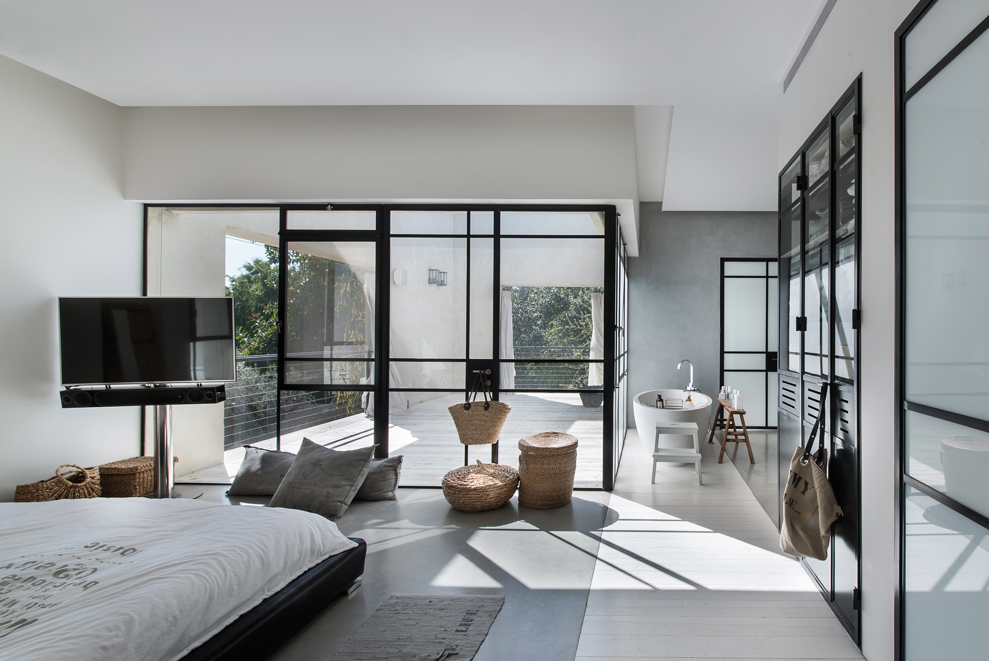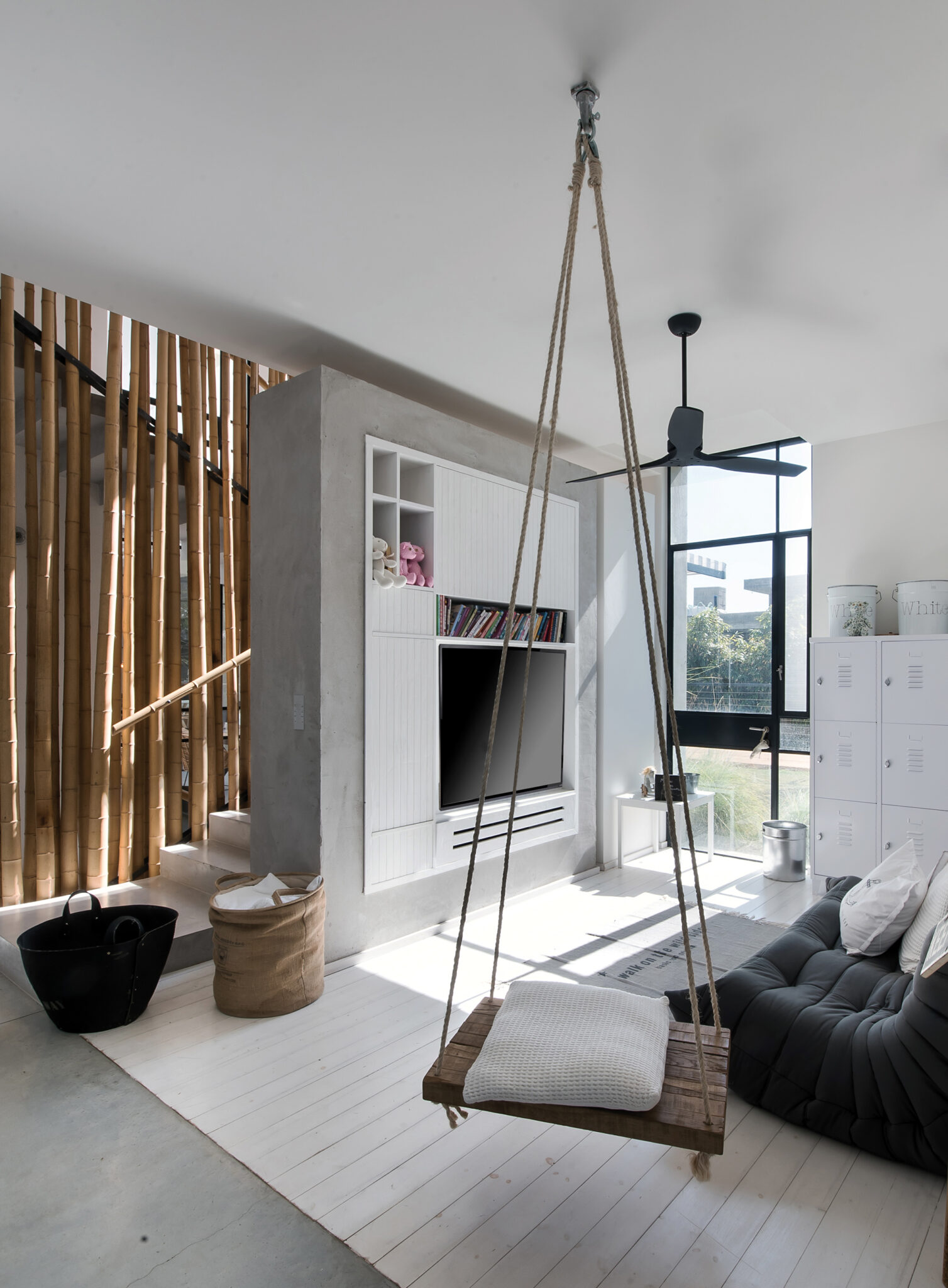Austère, la maison l’est sans aucun doute. Habillée de ce bien strict béton ainsi que de larges panneaux de verre, superbement encadrés de ferronnerie scrupuleusement sobre, la résidence Savion ne néglige aucune des règles d’une architecture dite moderne et fonctionnaliste. Pourtant, Sharon Neuman et Hila Tzur (les deux architectes responsables du projet) n’ont pas manqué d’y apporter quelques touches de chaleur et confort. On trouve ainsi des parquets de chêne ou des carreaux de béton, une rampe d’escalier profilée en bambou, quelques pièces de mobilier chinées ici et là, et ces lits suspendus qui donnent à la résidence Savion toute son âme méditerranéenne. Une maison du Sud qui pousse le plaisir jusque dans sa piscine à débordement qui frôle, avec un dédain non dissimulé, les murs de la résidence, pour mieux finir en une mini cascade au bout de son couloir de marbre. Comme un air de bohème, chic et racé, suspendu en plein cœur de la ville.