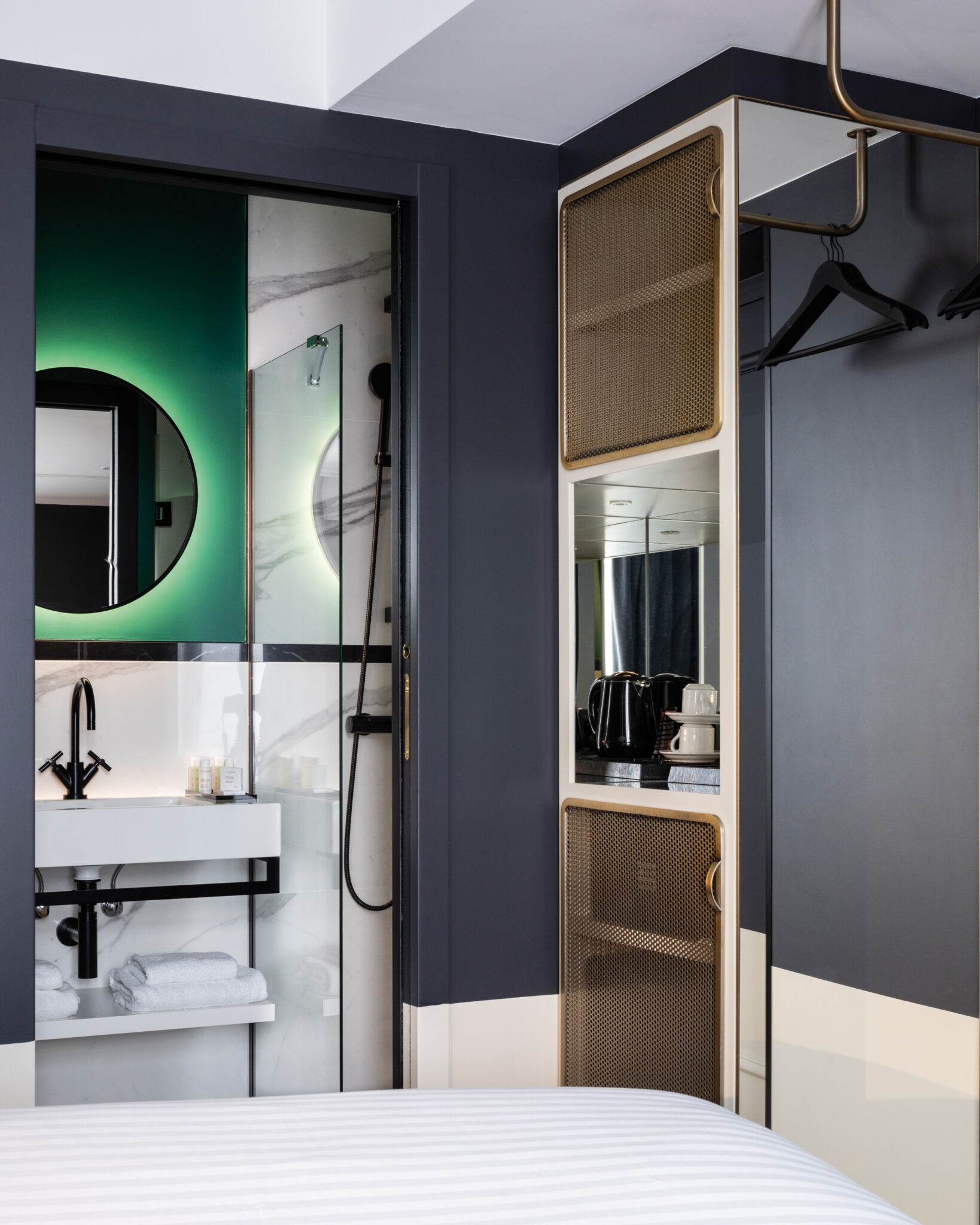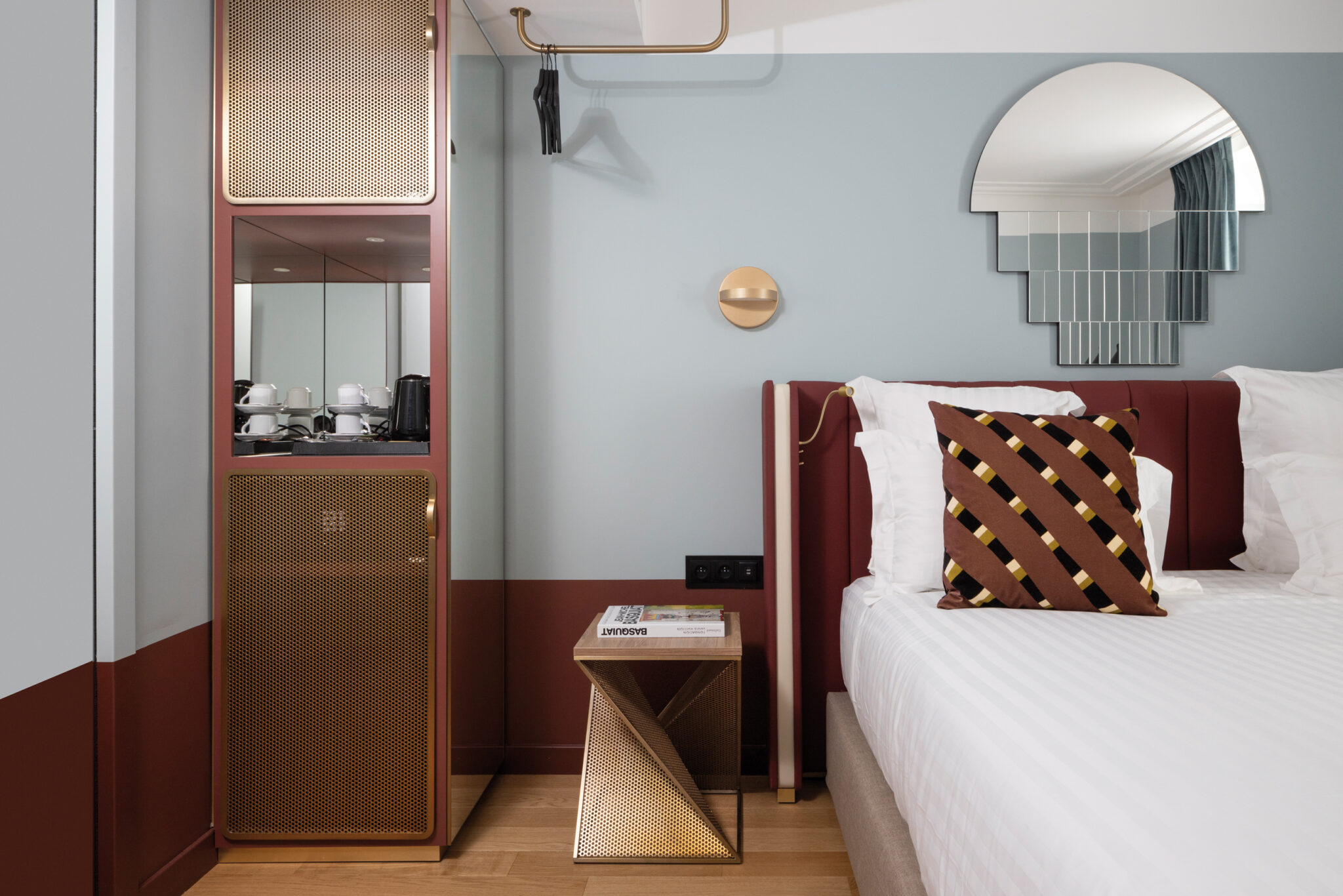 L’un de ses derniers opus, l’Hôtel Victor Hugo quatre étoiles, dans le XVIe arrondissement de Paris, est un véritable écrin Art déco, inspiré par l’architecture originelle de l’adresse. Ici, il a réinterprété ce style, mais de manière réellement contemporaine, « replaçant, à la manière des ensembliers, l’ornement et le décor au cœur de la recherche esthétique ». Pour l’Hôtel Parisianer, autre quatre étoiles achevé en mai dernier, à deux pas du Viaduc des Arts et de la gare de Lyon, il a imaginé une atmosphère d’une « précieuse décontraction », où se côtoient belles matières, textures, pièces de design iconiques, miroirs fumés et de couleur rose, tonalités poudrées et moquette sur mesure, décalée et bucolique. Précédemment, en septembre 2018, il avait signé l’Hôtel Bowmann cinq étoiles, installé dans un immeuble haussmannien du boulevard Haussmann à Paris, où il avait excellé en matière de dialogue entre les époques. Car l’architecte d’intérieur aime particulièrement les bâtiments qui racontent une histoire… De retour du Japon, où il vient d’achever la suite présidentielle du Park Hyatt Tokyo traduisant l’architecture à la française, il nous parle de son parcours, de ses projets actuels et à venir.