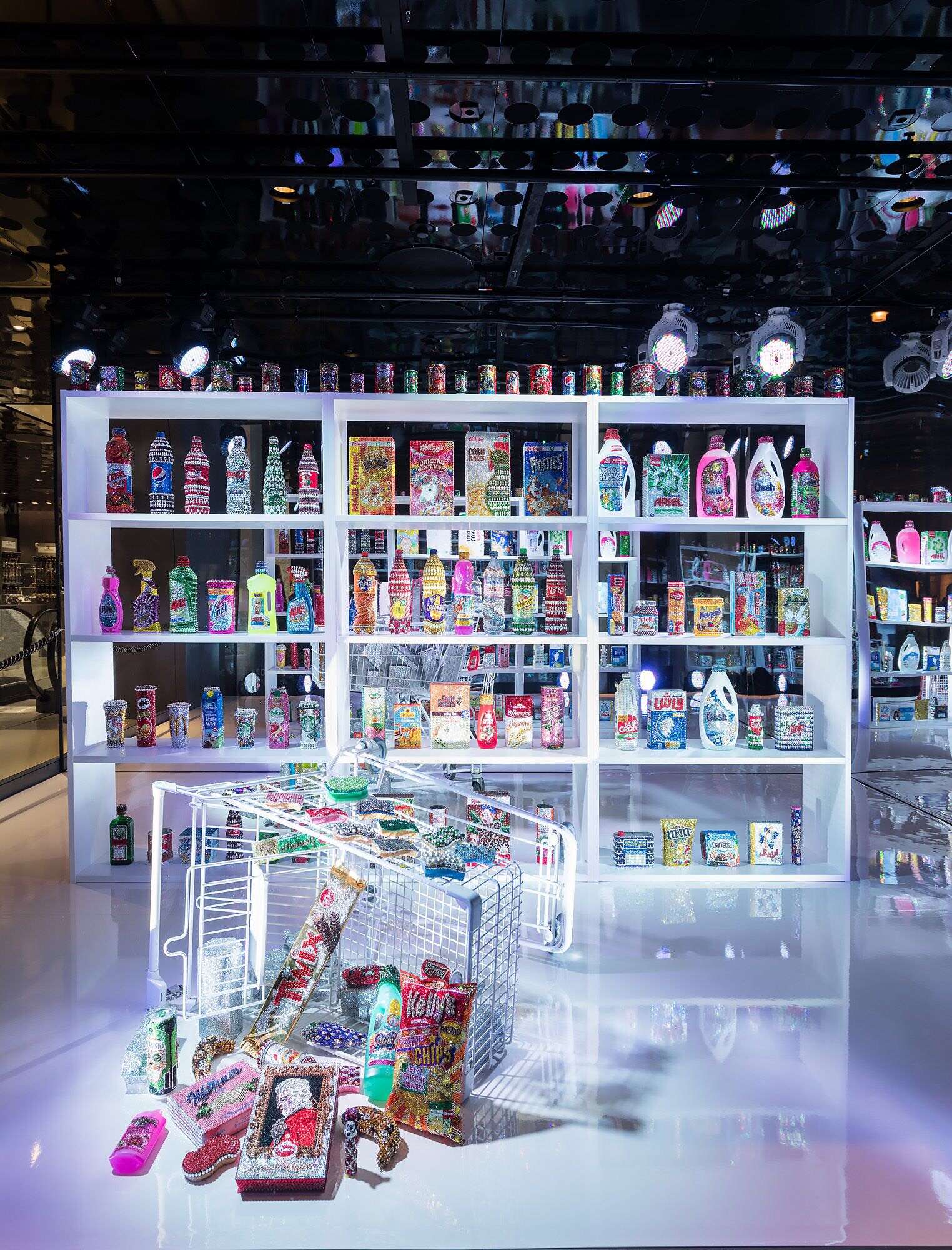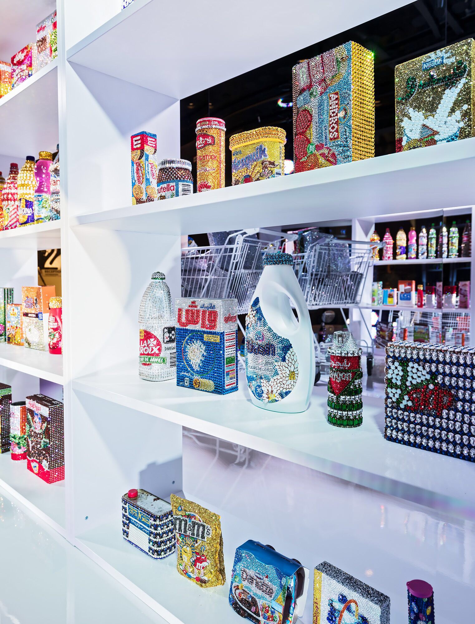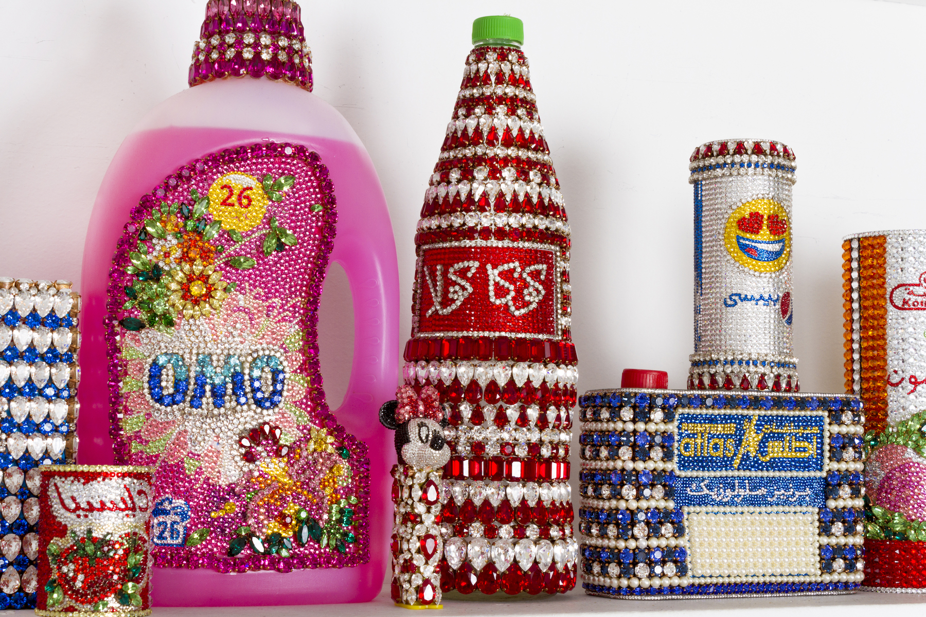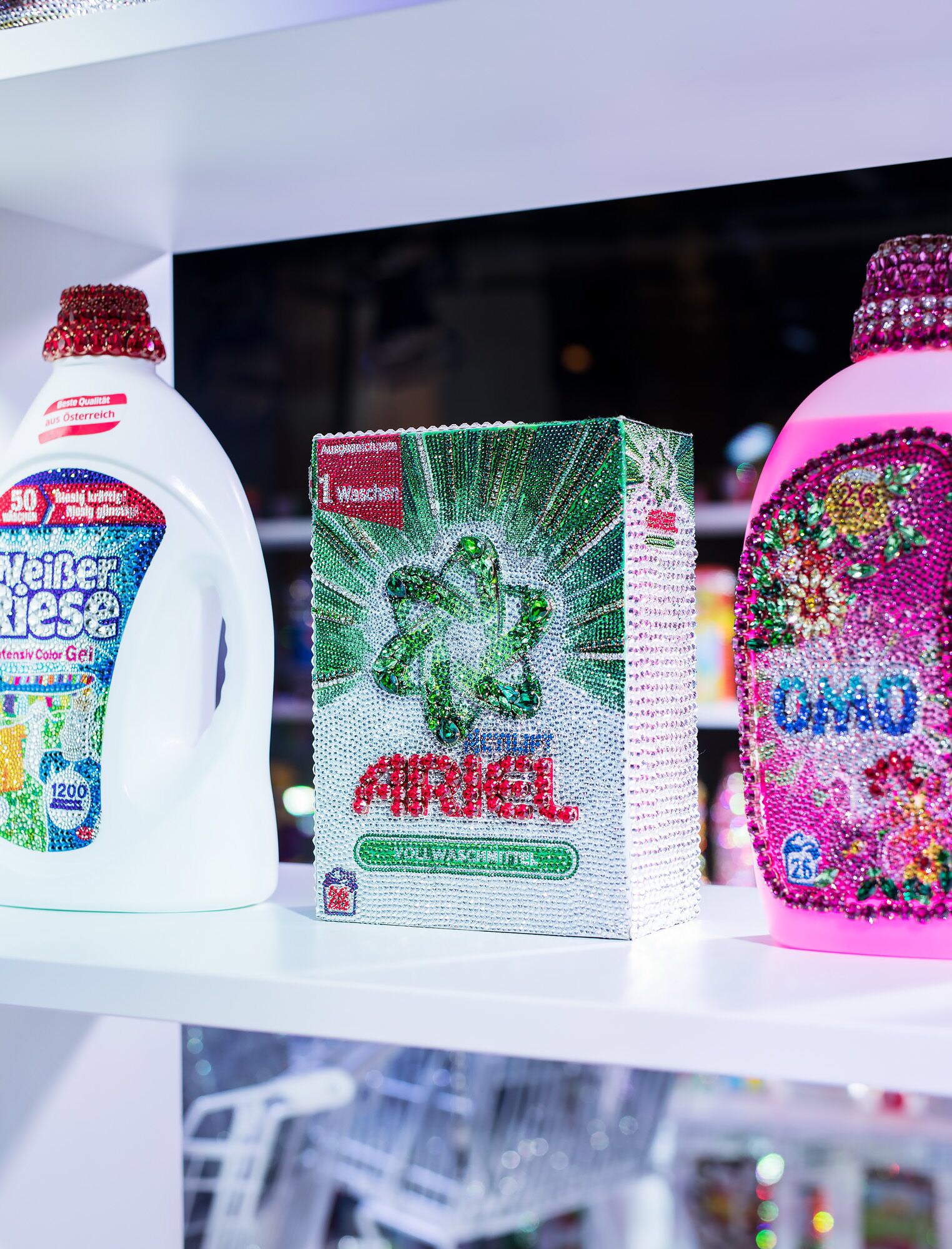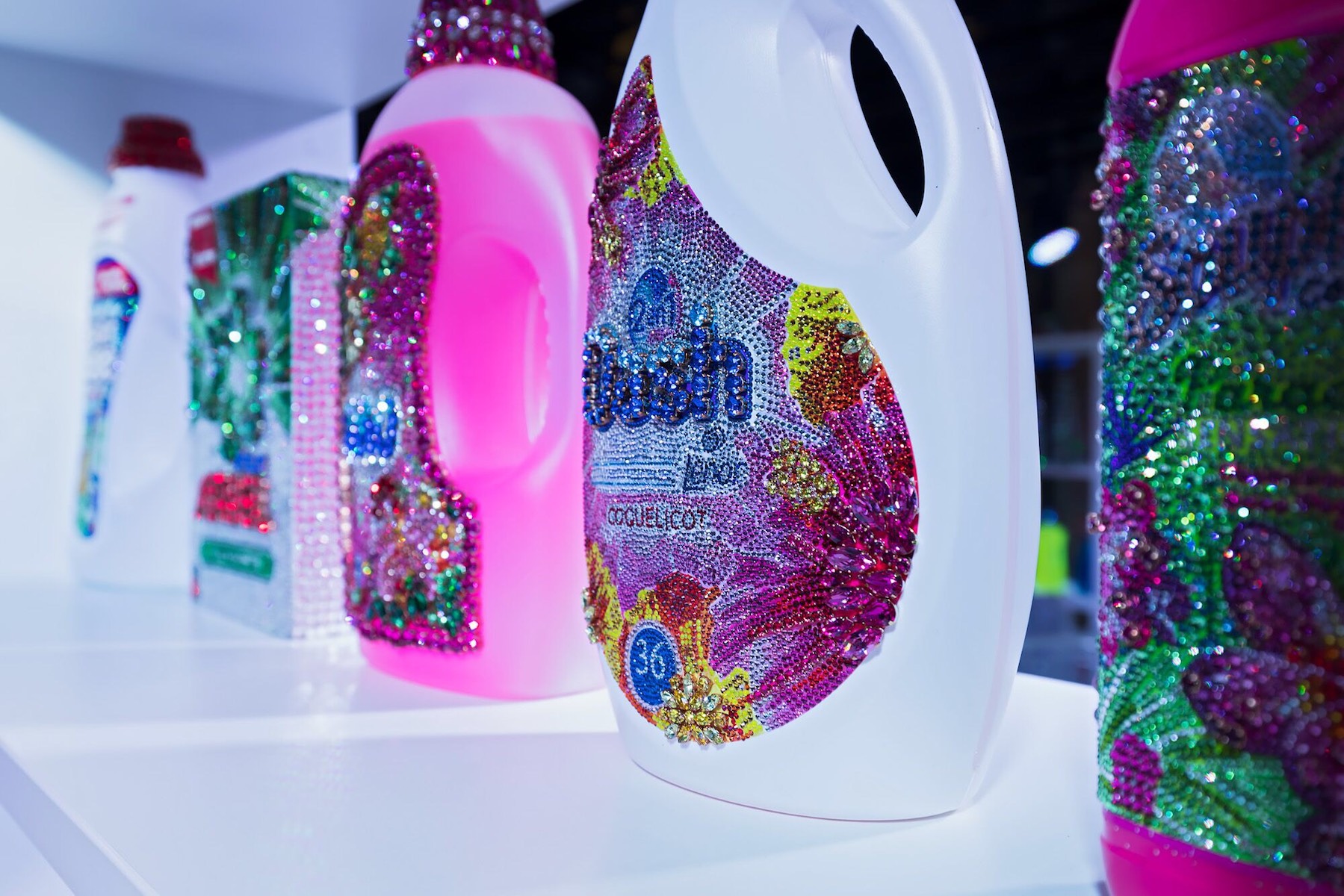 Une bouteille d’Ajax suffisait à la transporter dans un monde utopique, sans crainte d’une réalité sismique, où les rêves n’avaient aucune limite. C’est ainsi qu’« Ordinary life » nait. Cette installation en collaboration avec Swarovski dévoilée à Vienne soumet les produits du quotidien à une touche de glamour et de fantaisie. Les bidons de lessive Woolite et les paquets de Bonux, les bouteilles de Pepsi, les Pez de notre enfance, les produits ménagers Ace ou encore Ajax ; une pléiade d’authenticité et de souvenirs d’antan.